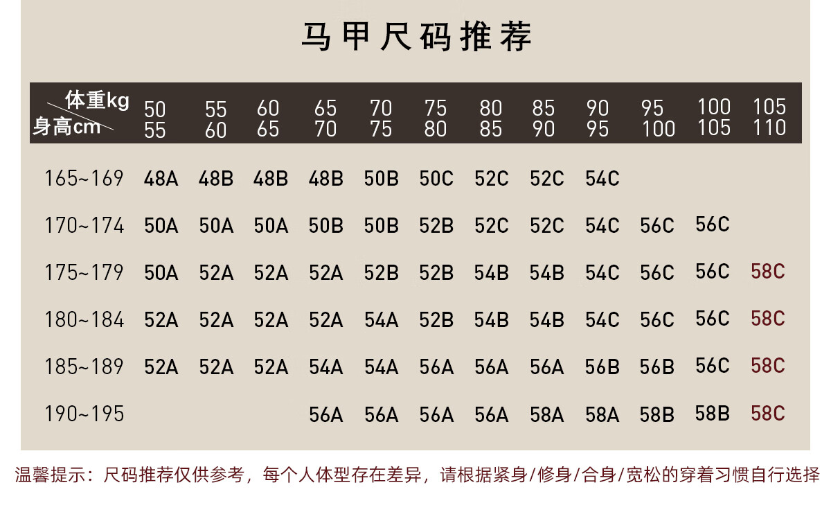 China (cm) 160-165/84-86 165-170 / 88-90 167-172 / 92-96 168-173 / 98-102 170-176 / 106-110