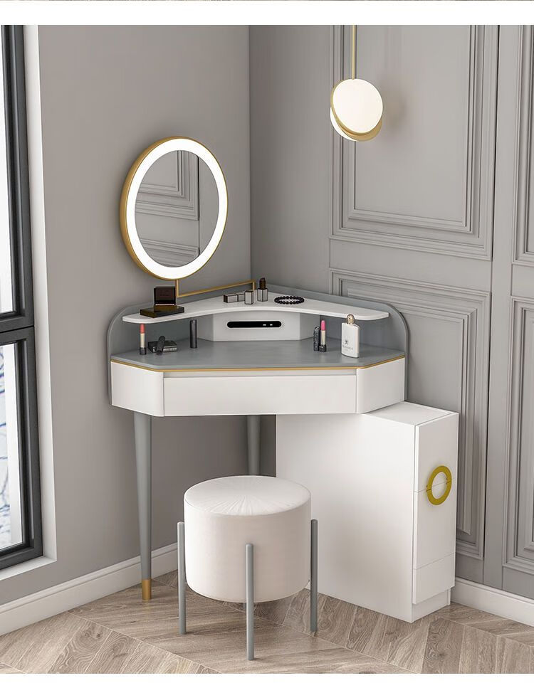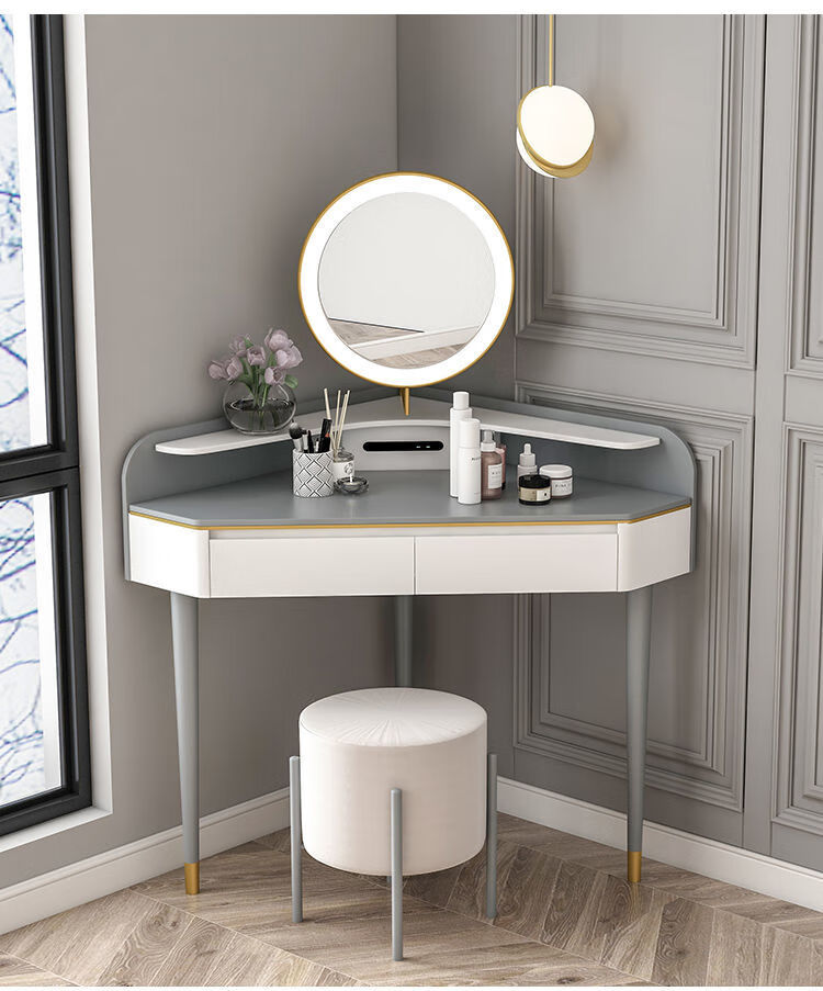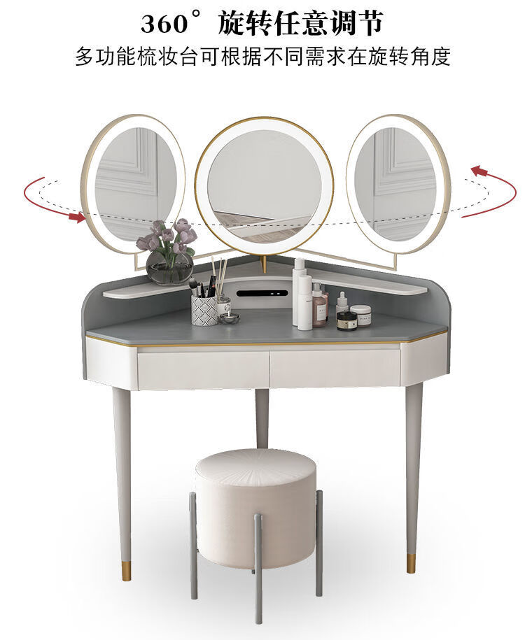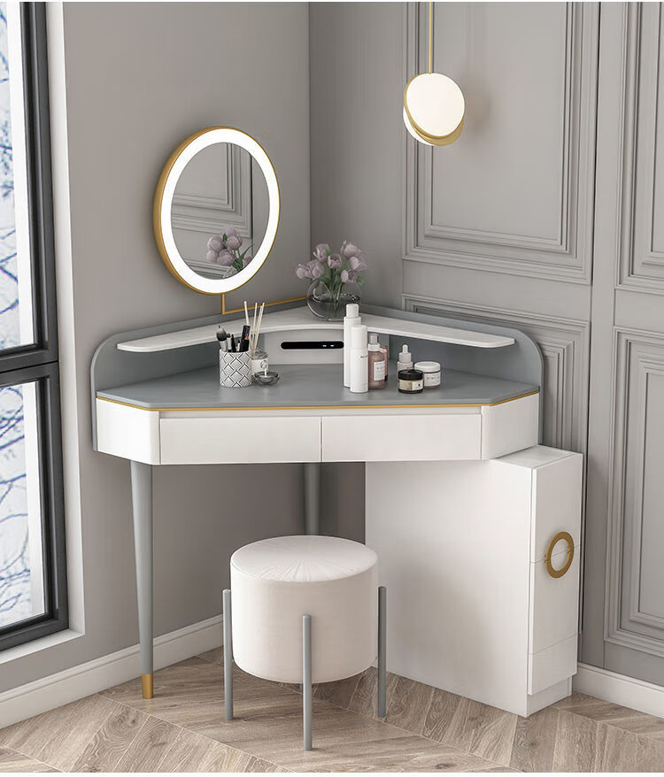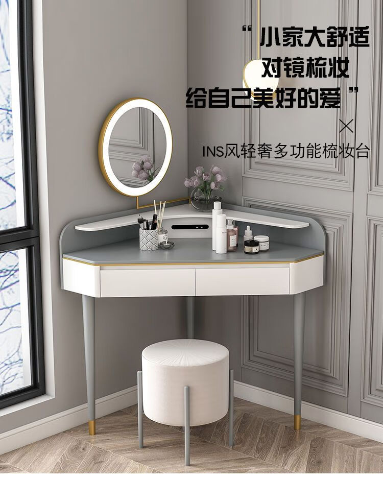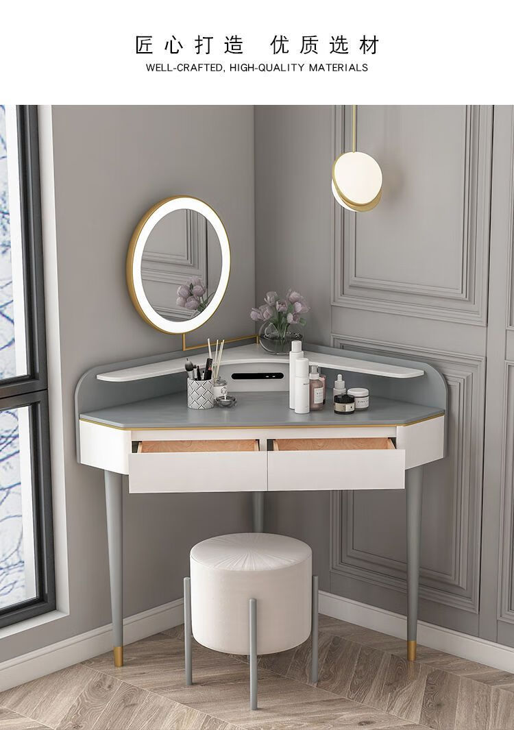 Shanghuashi Dressing Table Bedroom Corner Light Luxury Triangle Internet Celebrity Ins Style Corner Mini Dressing Table LED Light Small Dressing Table 0.6 Meter Dressing Table (Free Makeup Stool)