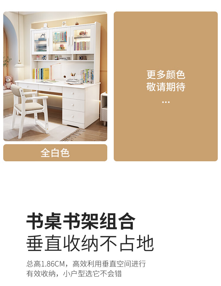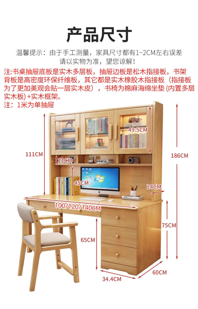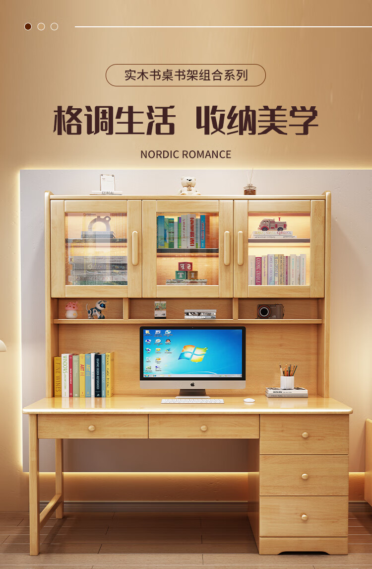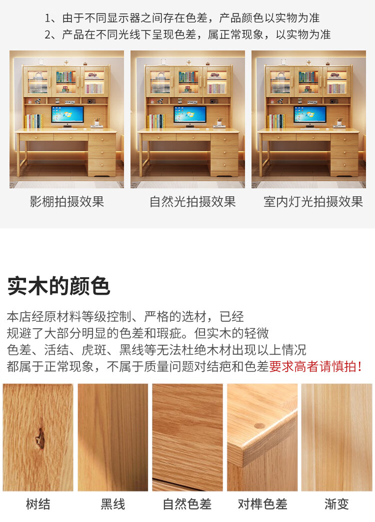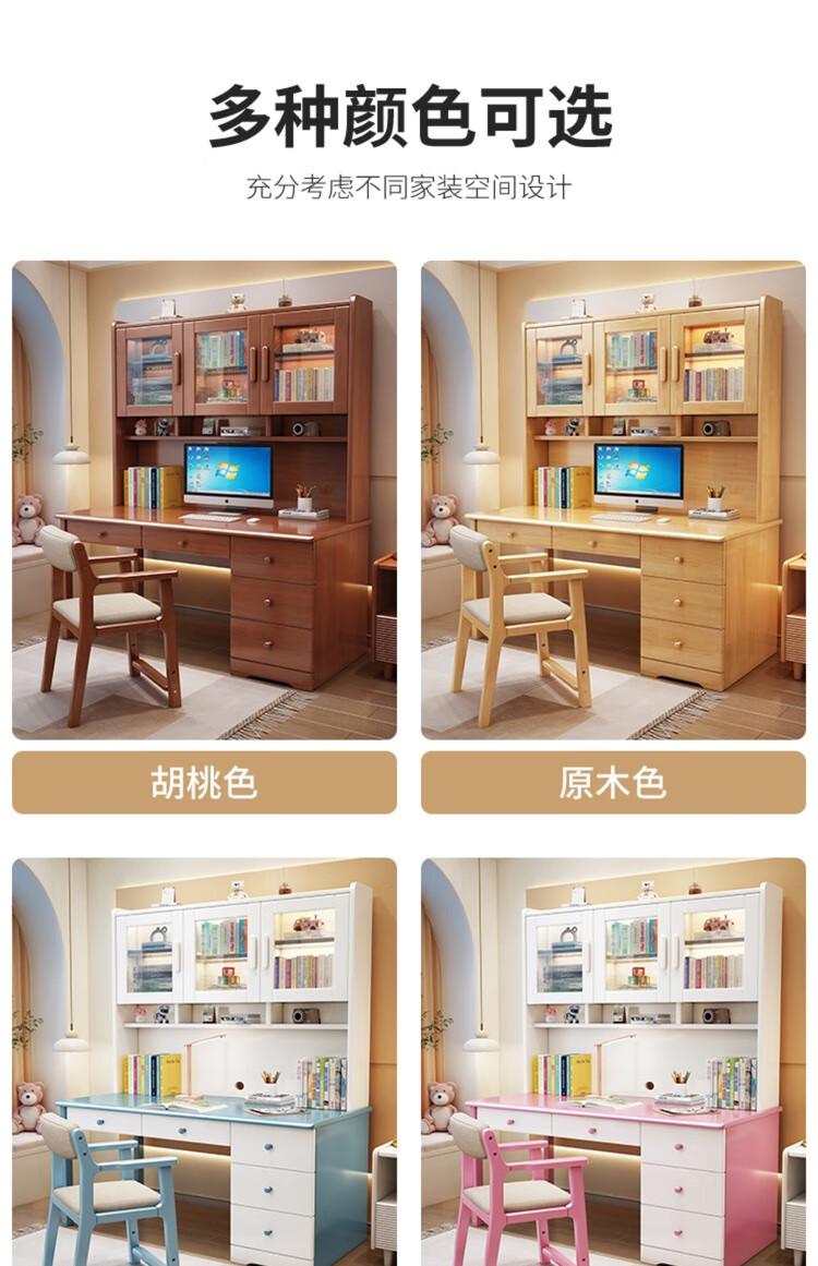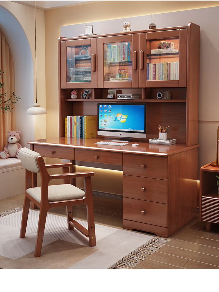 Bamboo sound desk solid wood computer desk bookshelf bookcase integrated combination study table and chair bedroom student writing desk home walnut color single table 140x60x186cm