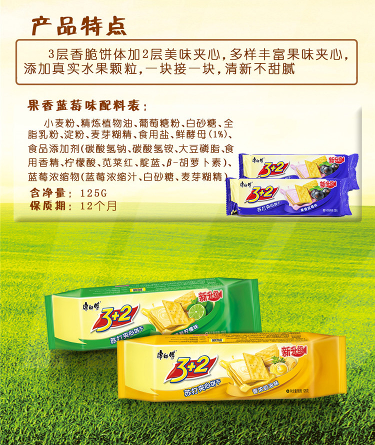 Master Kong 3+2 soda sandwich cookies (fruity blueberry flavor) 125g/bag