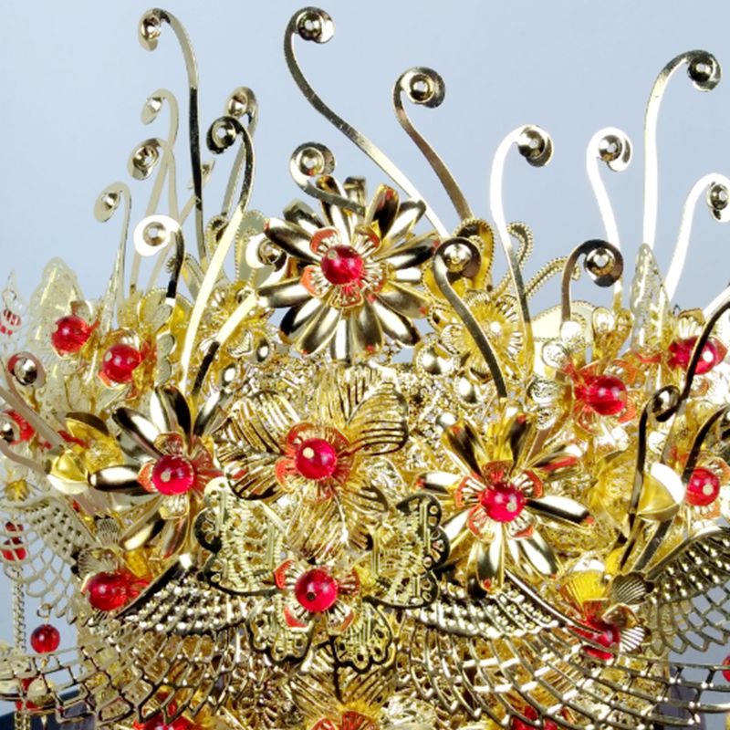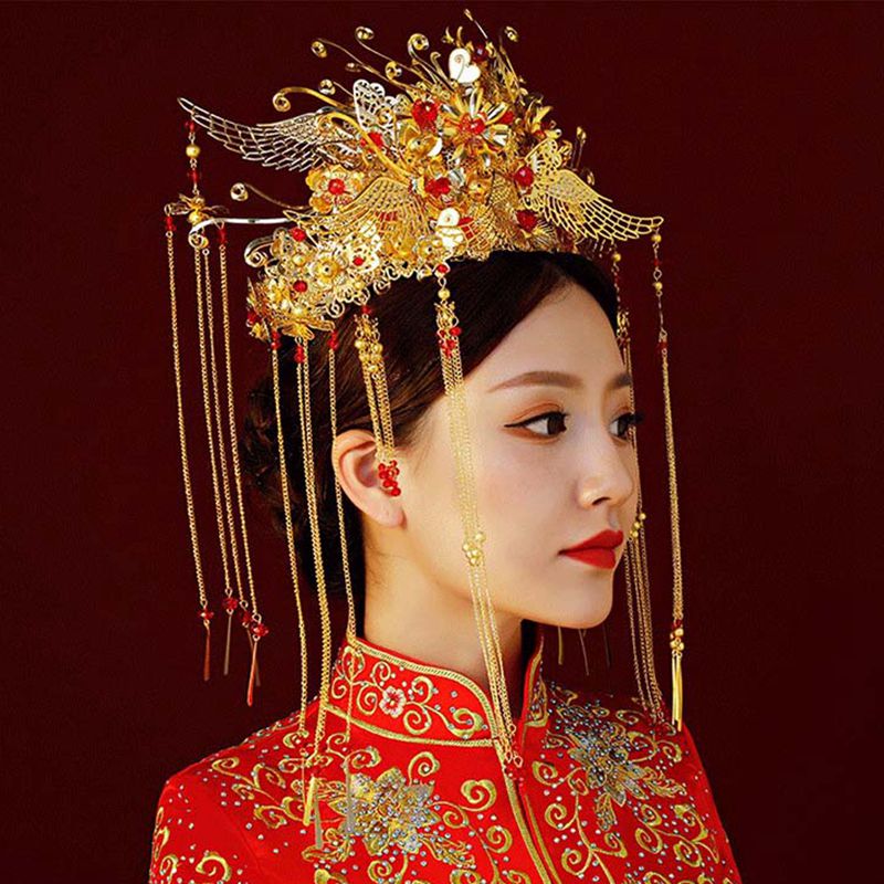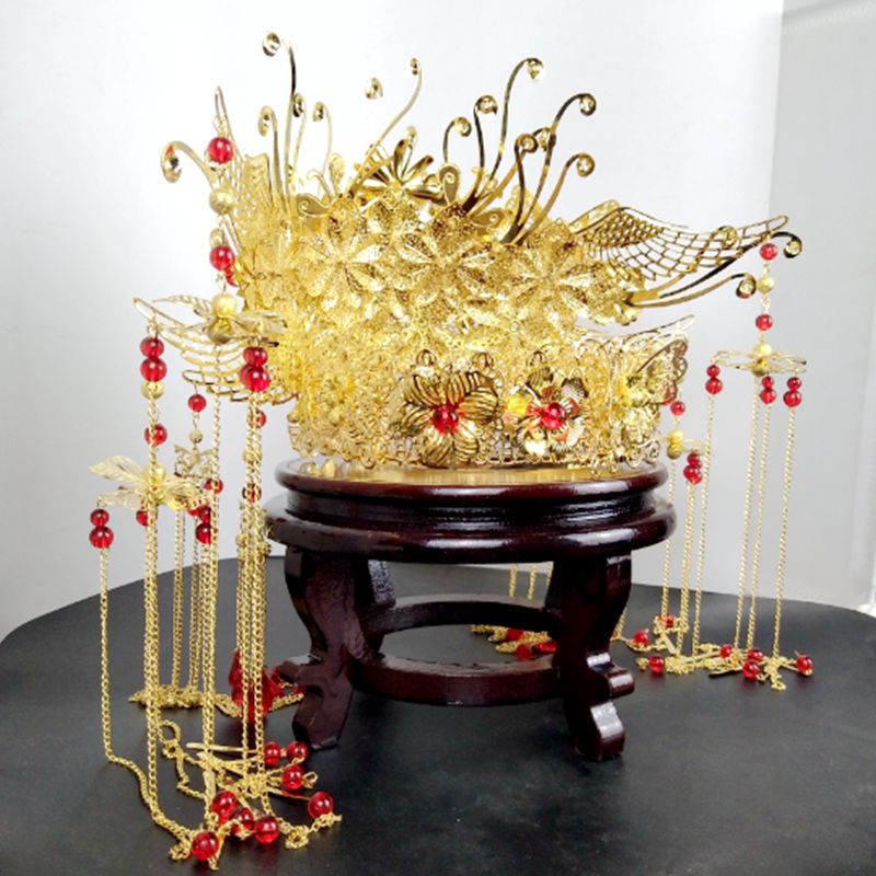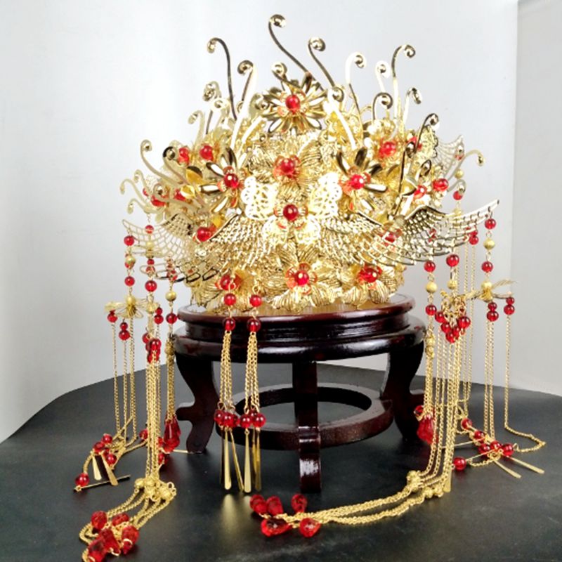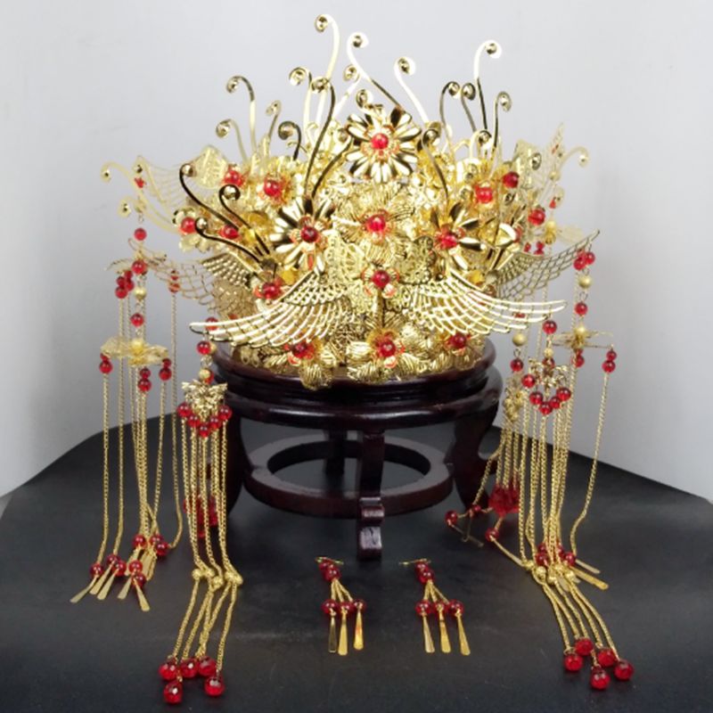 Lai Qi Bridal Ancient Costume Headdress Chinese Wedding Queen Hair Accessories Dragon and Phoenix Gown Xiuhe Suit Tang Suit Hanfu Accessories Large Phoenix Crown Round Phoenix Crown Headdress + Earrings (Clip)