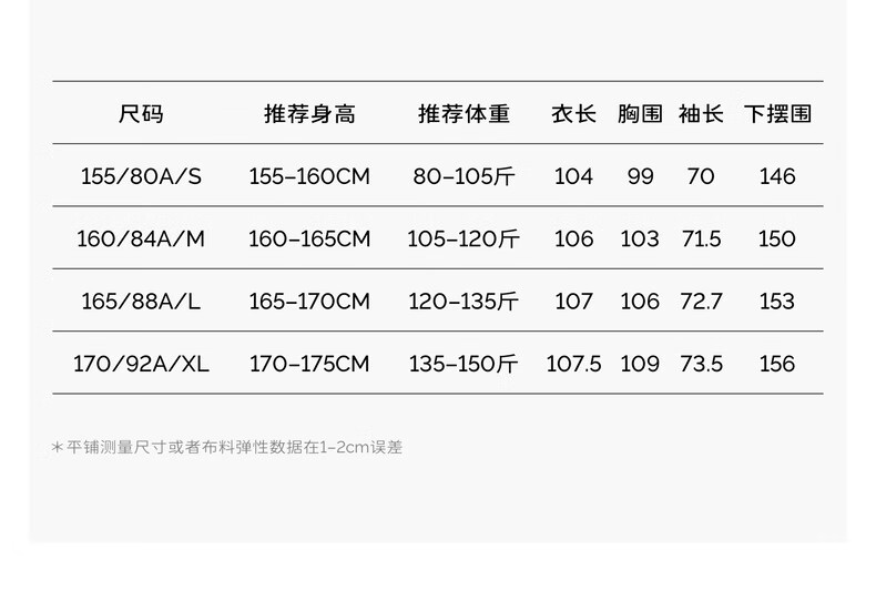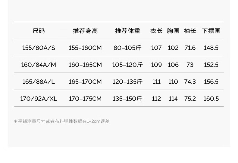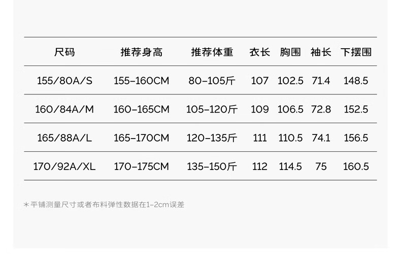 China (cm) 160-165/84-86 165-170 / 88-90 167-172 / 92-96 168-173 / 98-102 170-176 / 106-110