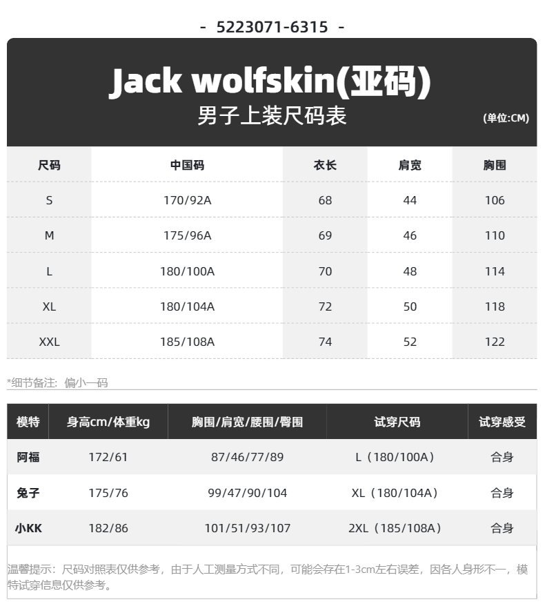 China (cm) 165 / 88-90 170 / 96-98 175 / 108-110 180 / 118-122 185 / 126-130