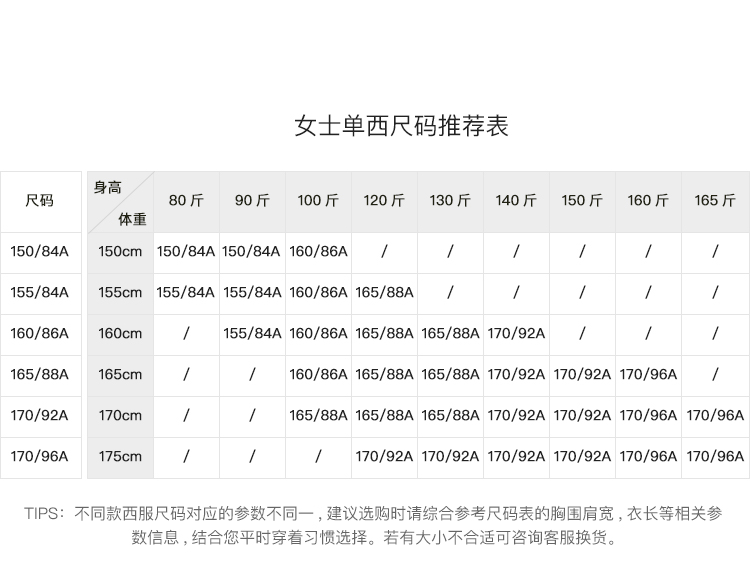 China (cm) 160-165/84-86 165-170 / 88-90 167-172 / 92-96 168-173 / 98-102 170-176 / 106-110
