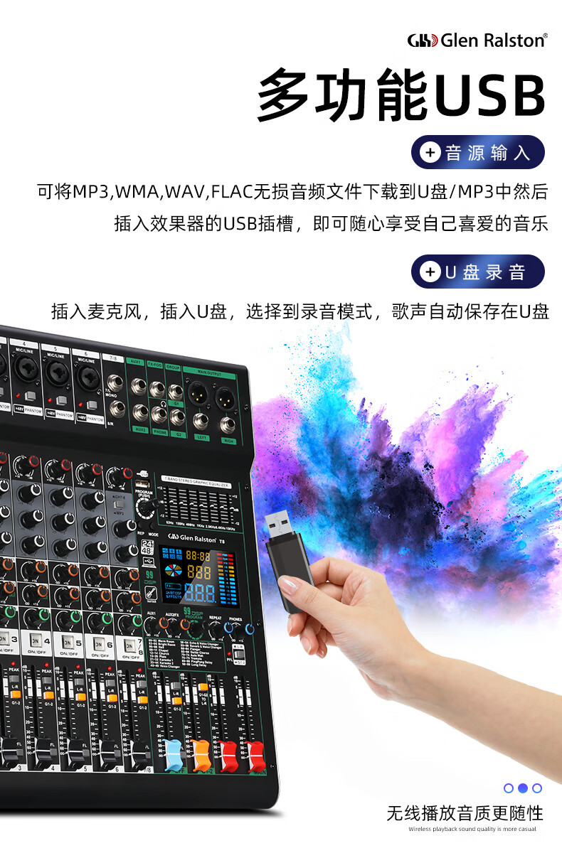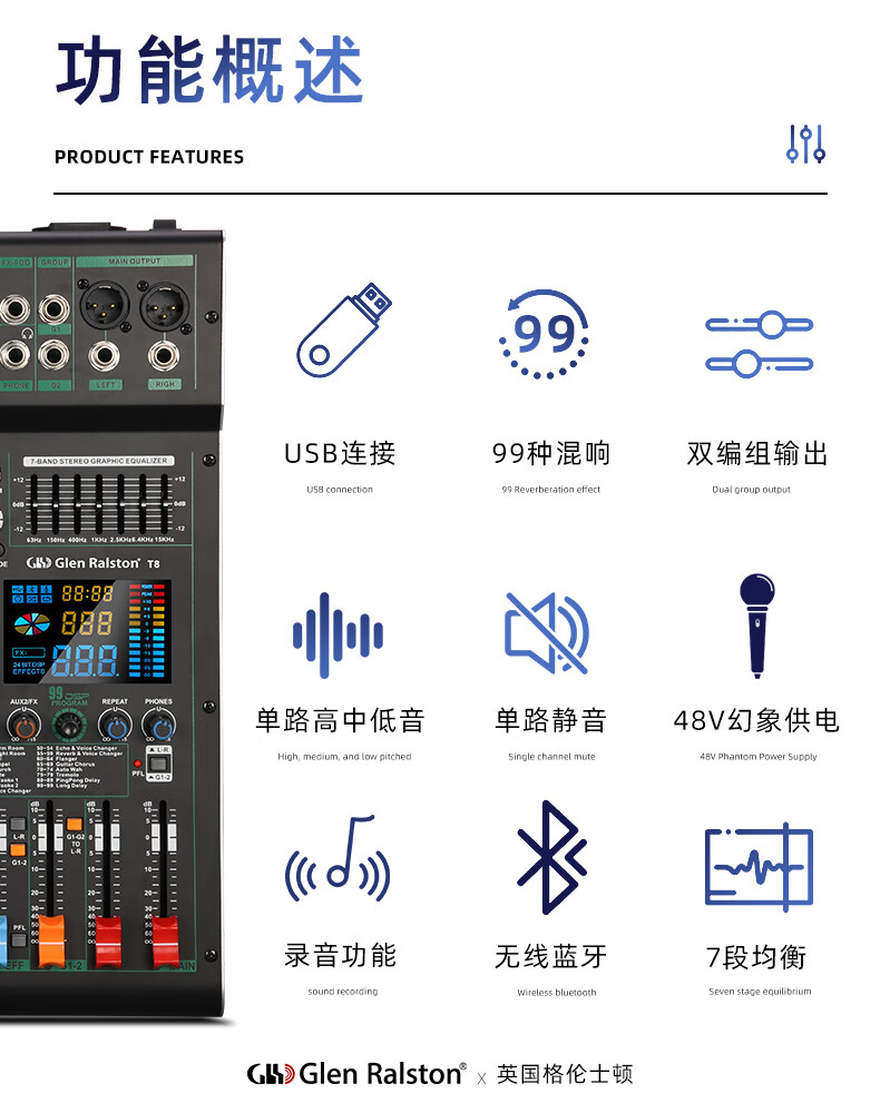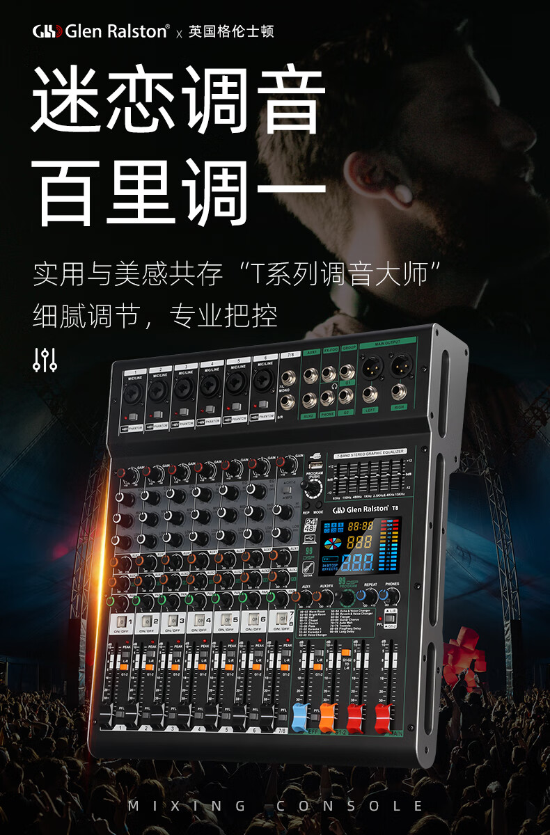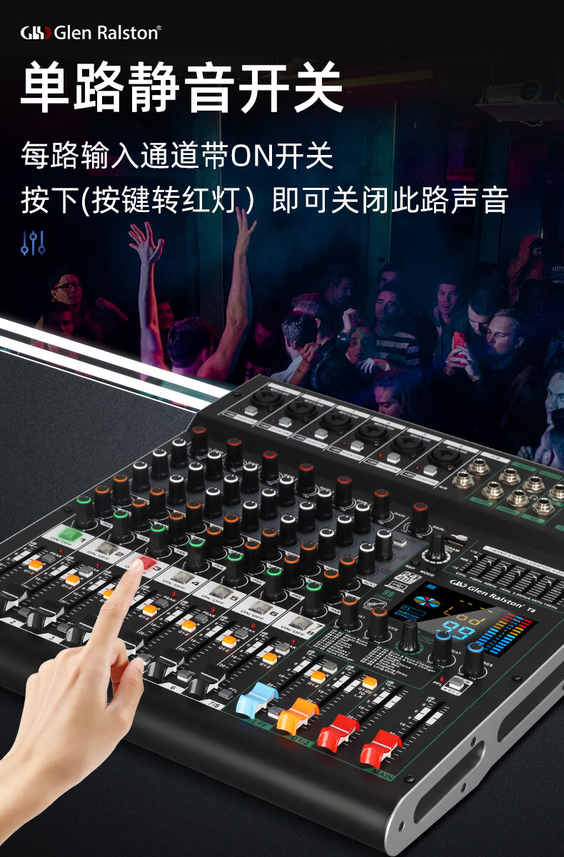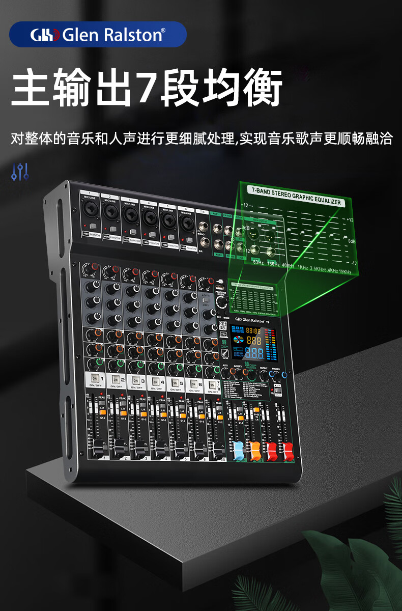Glen Ralston T8 professional 8-way mixer 99 types of reverberation MP3 Bluetooth balanced USB recording dual group stage T16 (16-way mixer)