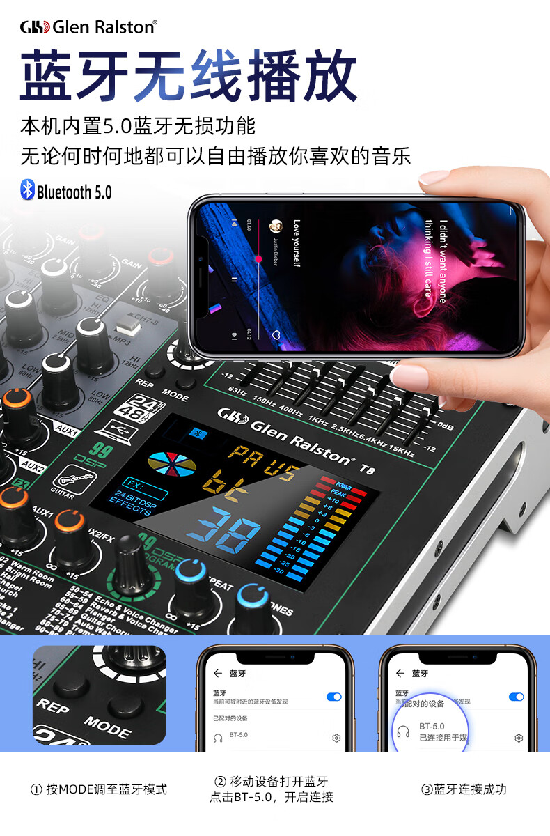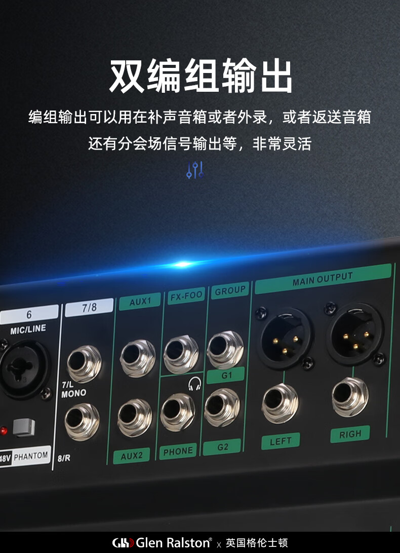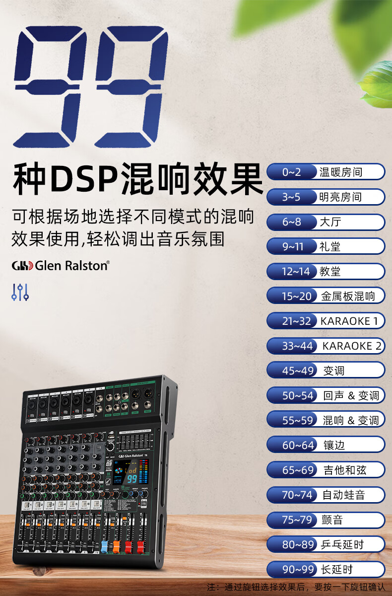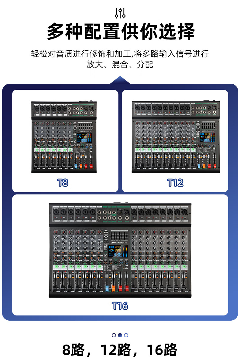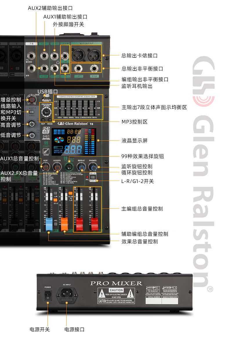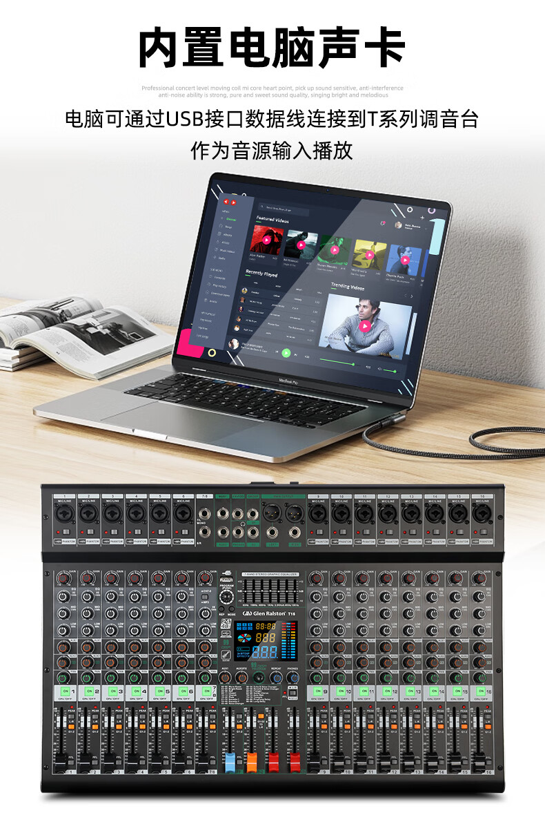 Glen Ralston T8 professional 8-way mixer 99 types of reverberation MP3 Bluetooth balanced USB recording dual group stage T16 (16-way mixer)