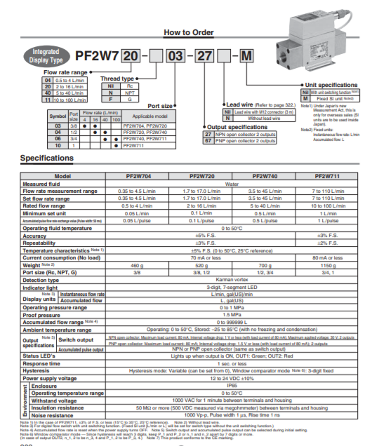 PF2W704/PF2W720/PF2W740/03/04/27/67/M Japanese SMC water flow switch PF2W711-10-27