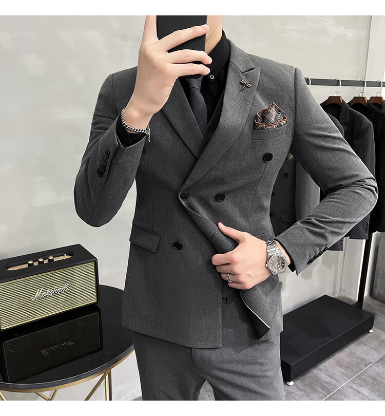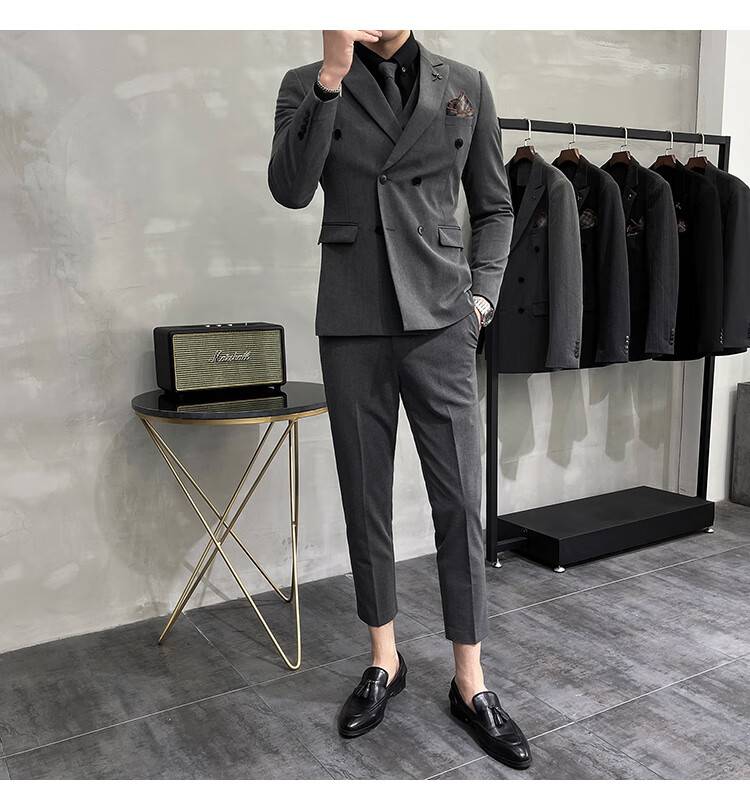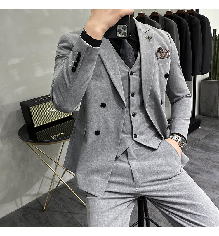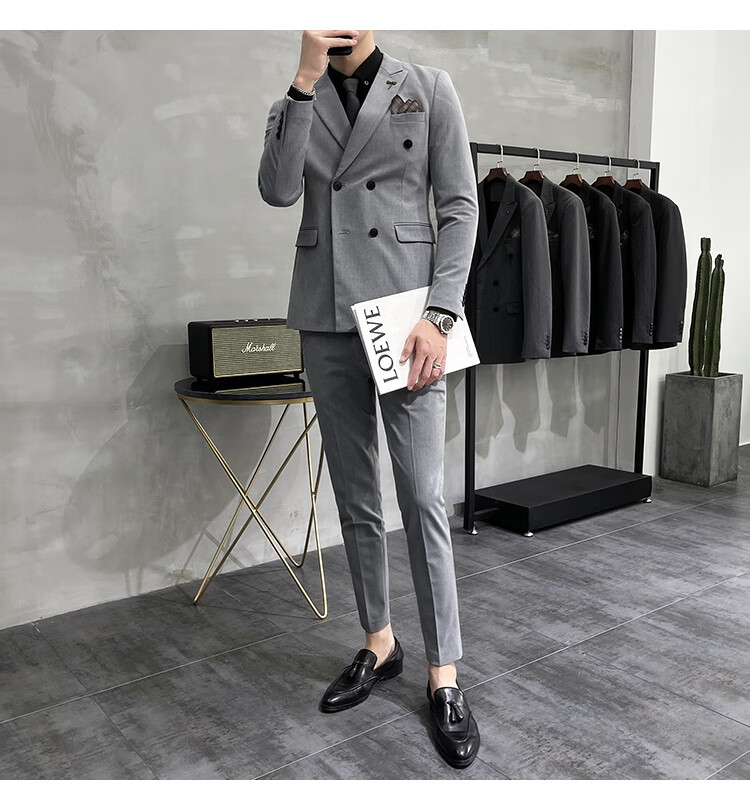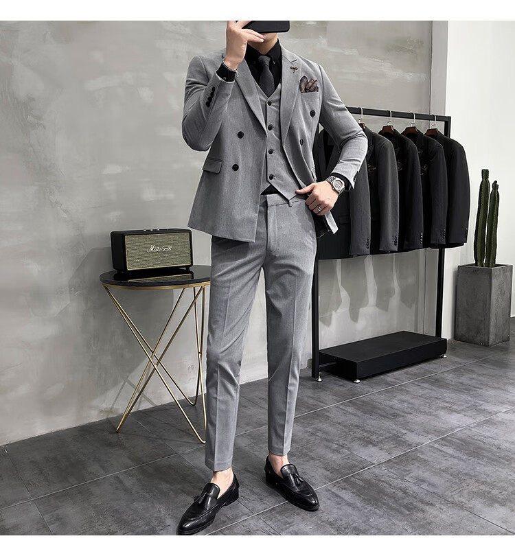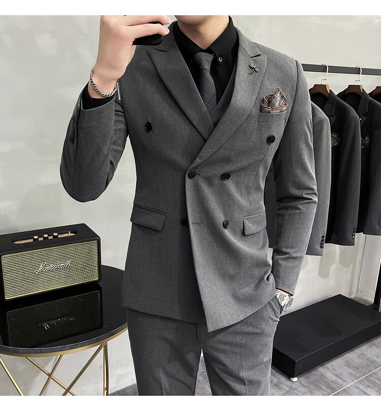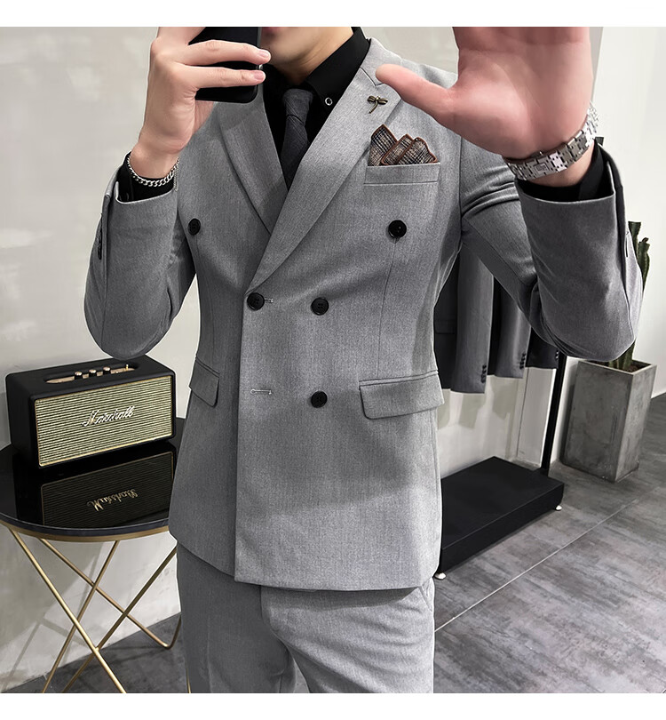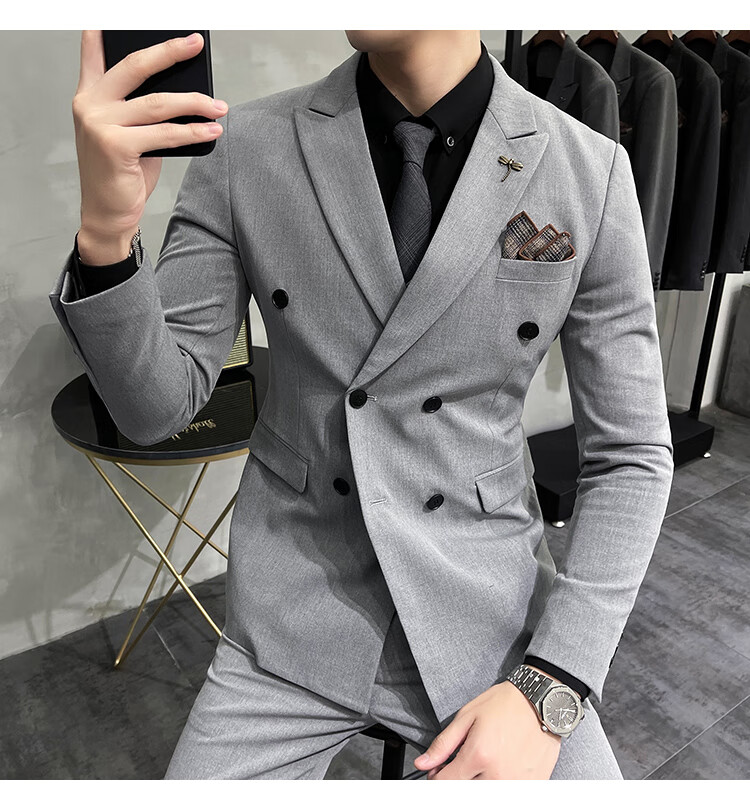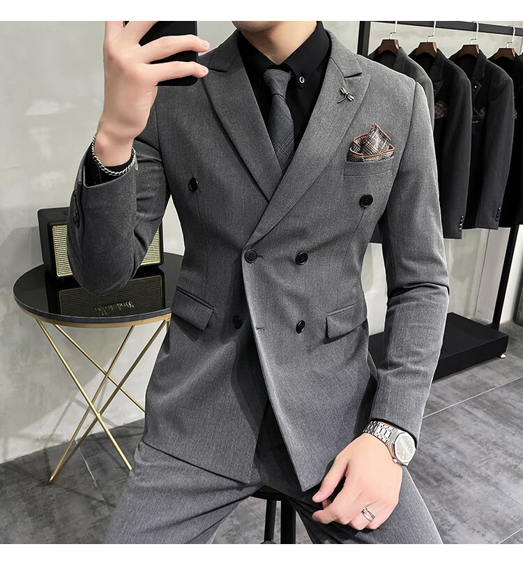 Pierre Cardin double-breasted suit suit for men, casual business suit, groom's wedding dress, handsome slim fit suit for men, medium gray two-piece suit (suit + trousers) 2XL (140-150Jin Jin is equal to 0.5kg)