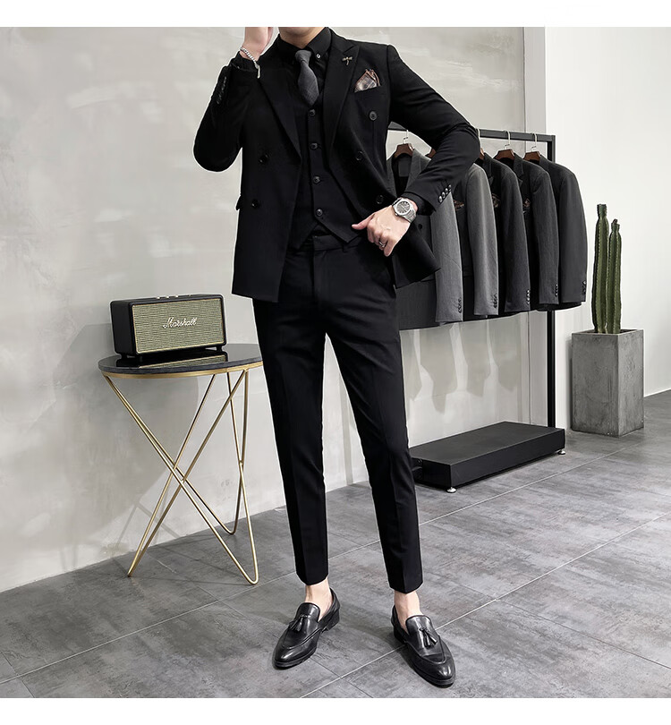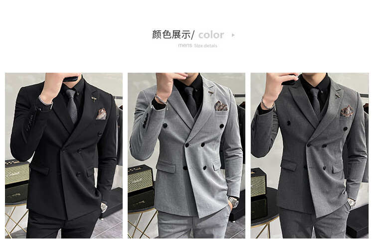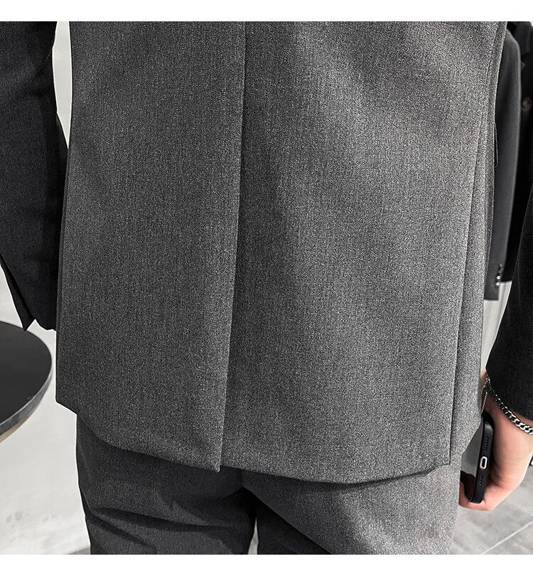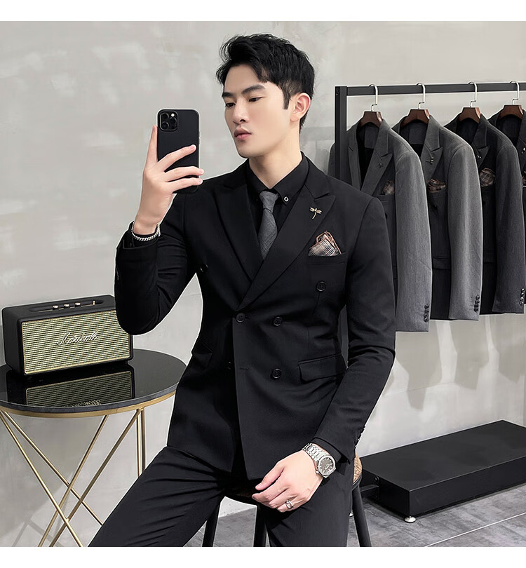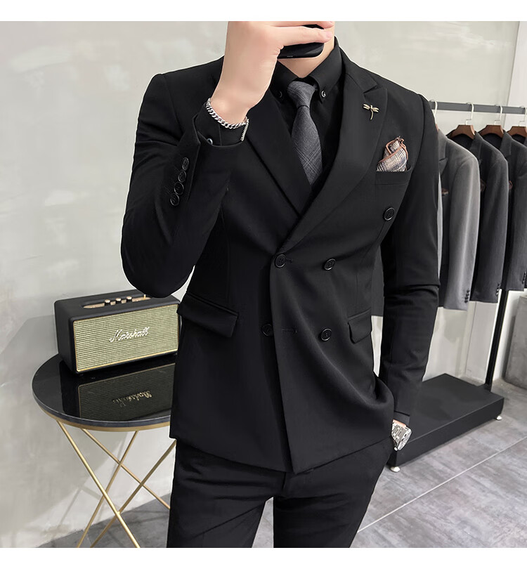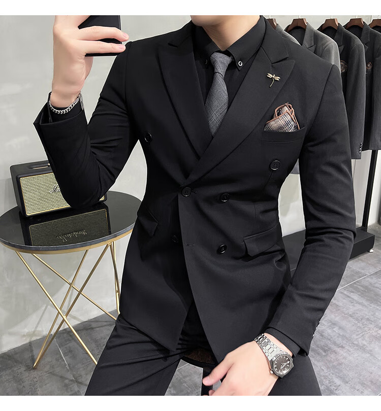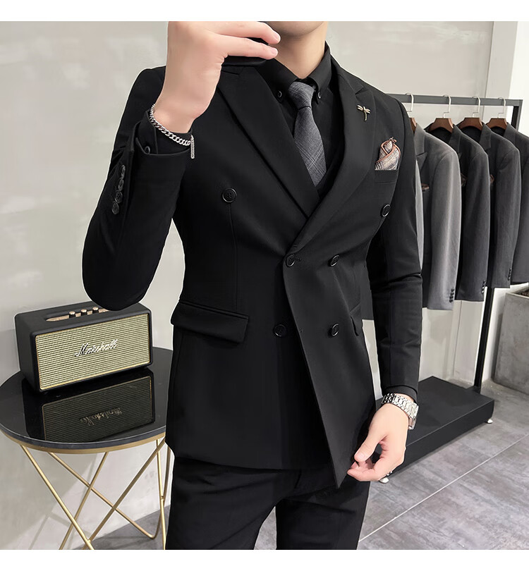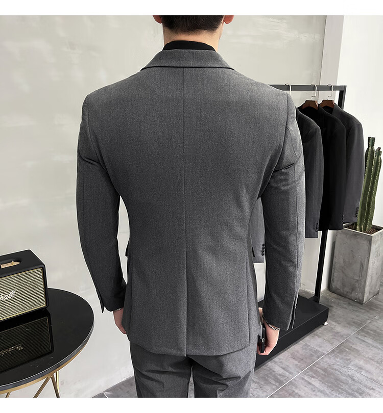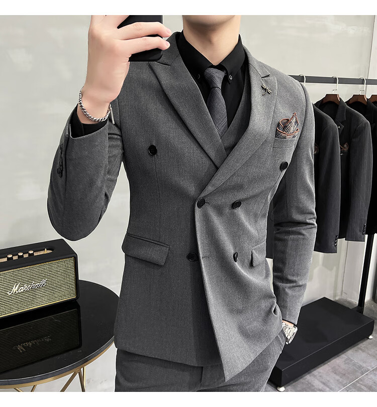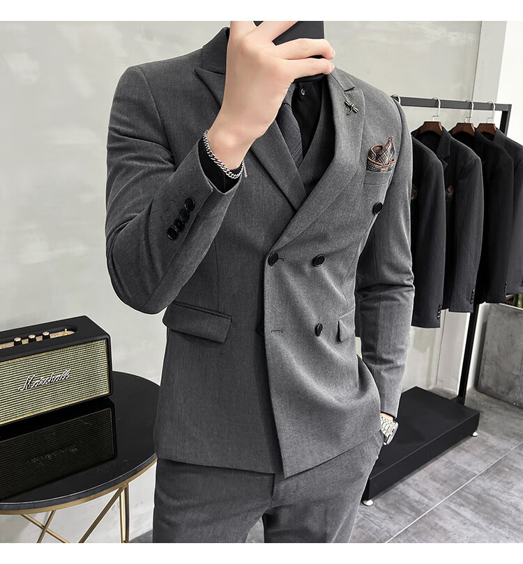 Pierre Cardin double-breasted suit suit for men, casual business suit, groom's wedding dress, handsome slim fit suit for men, medium gray two-piece suit (suit + trousers) 2XL (140-150Jin Jin is equal to 0.5kg)