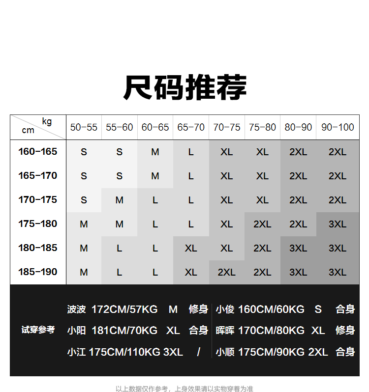 China (cm) 165 / 88-90 170 / 96-98 175 / 108-110 180 / 118-122 185 / 126-130