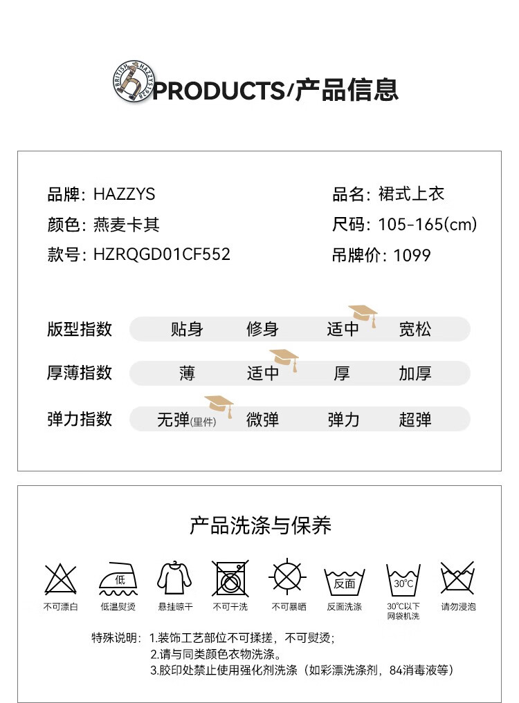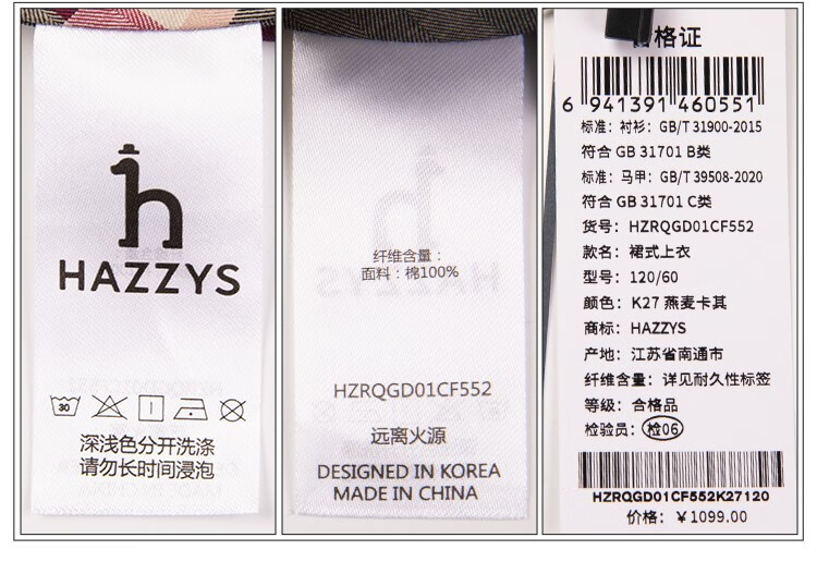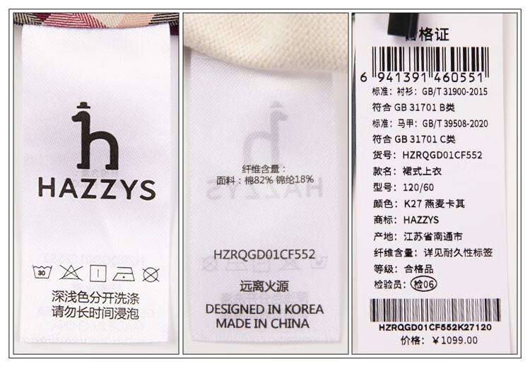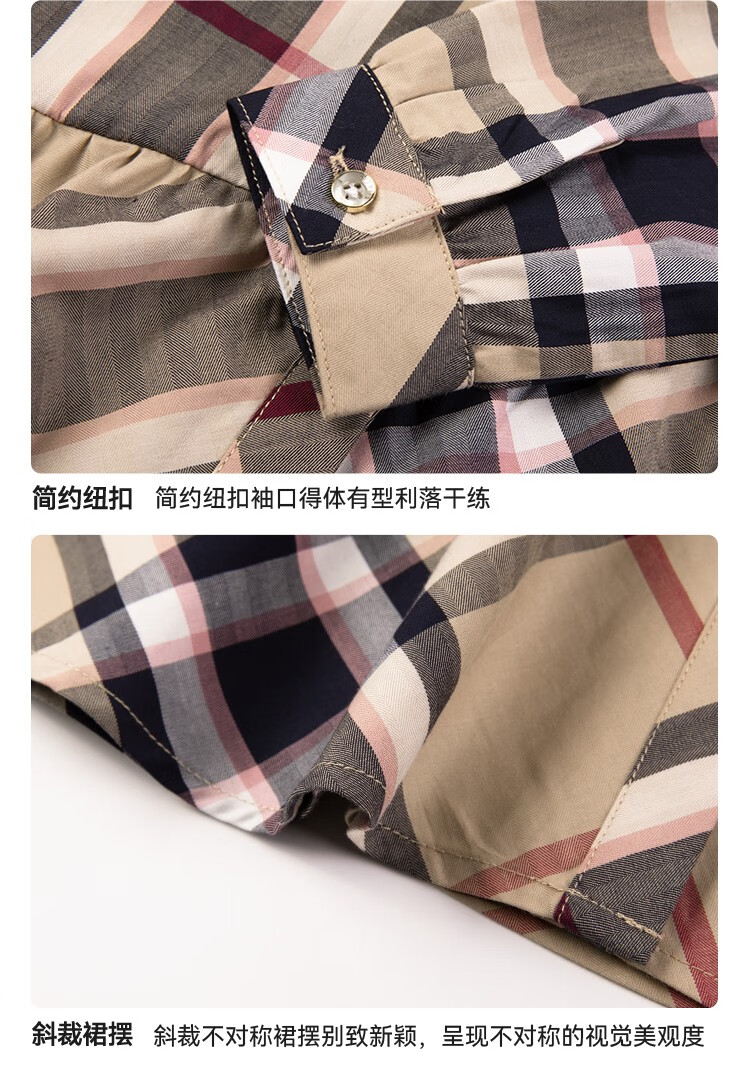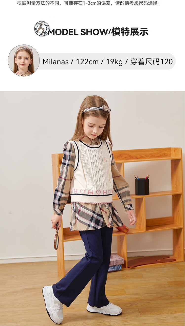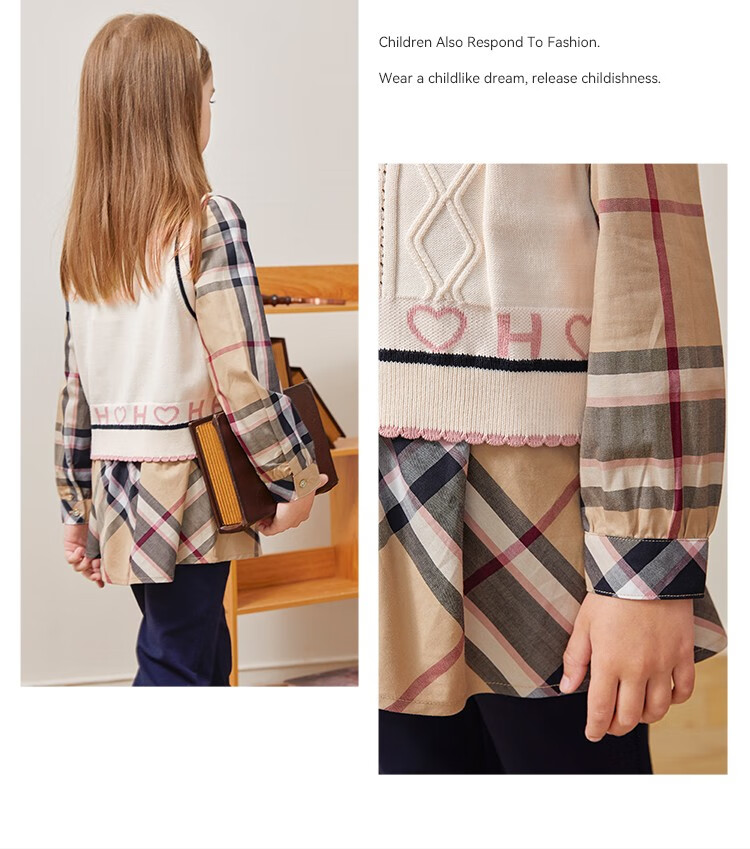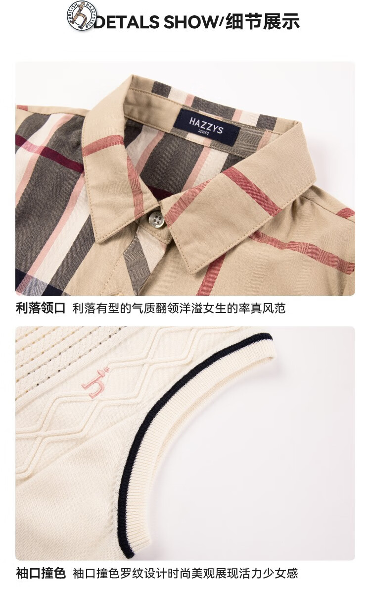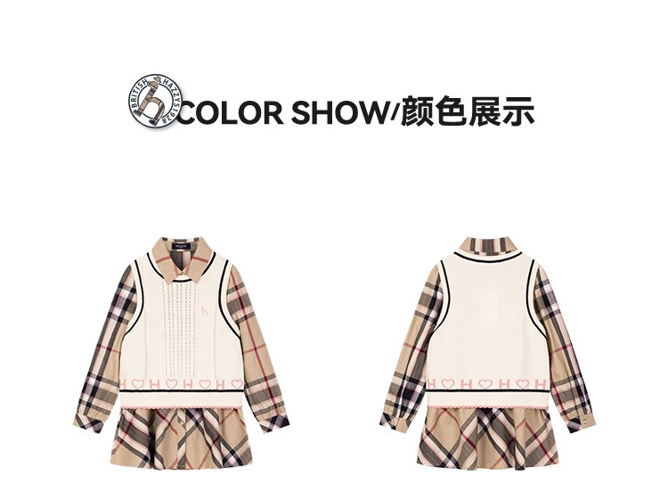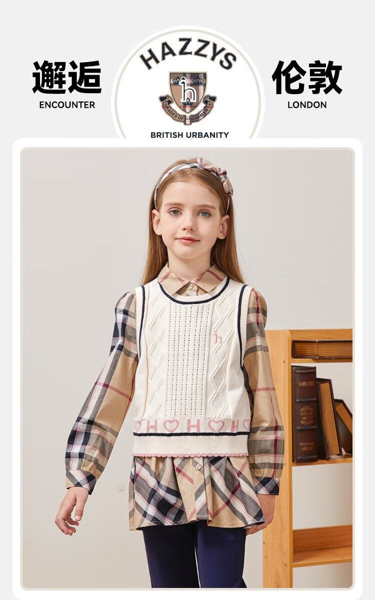 HAZZYS brand children's clothing for girls, new autumn product, comfortable, breathable, contrasting colors, simple plaid two-piece skirt top, oatmeal khaki 130