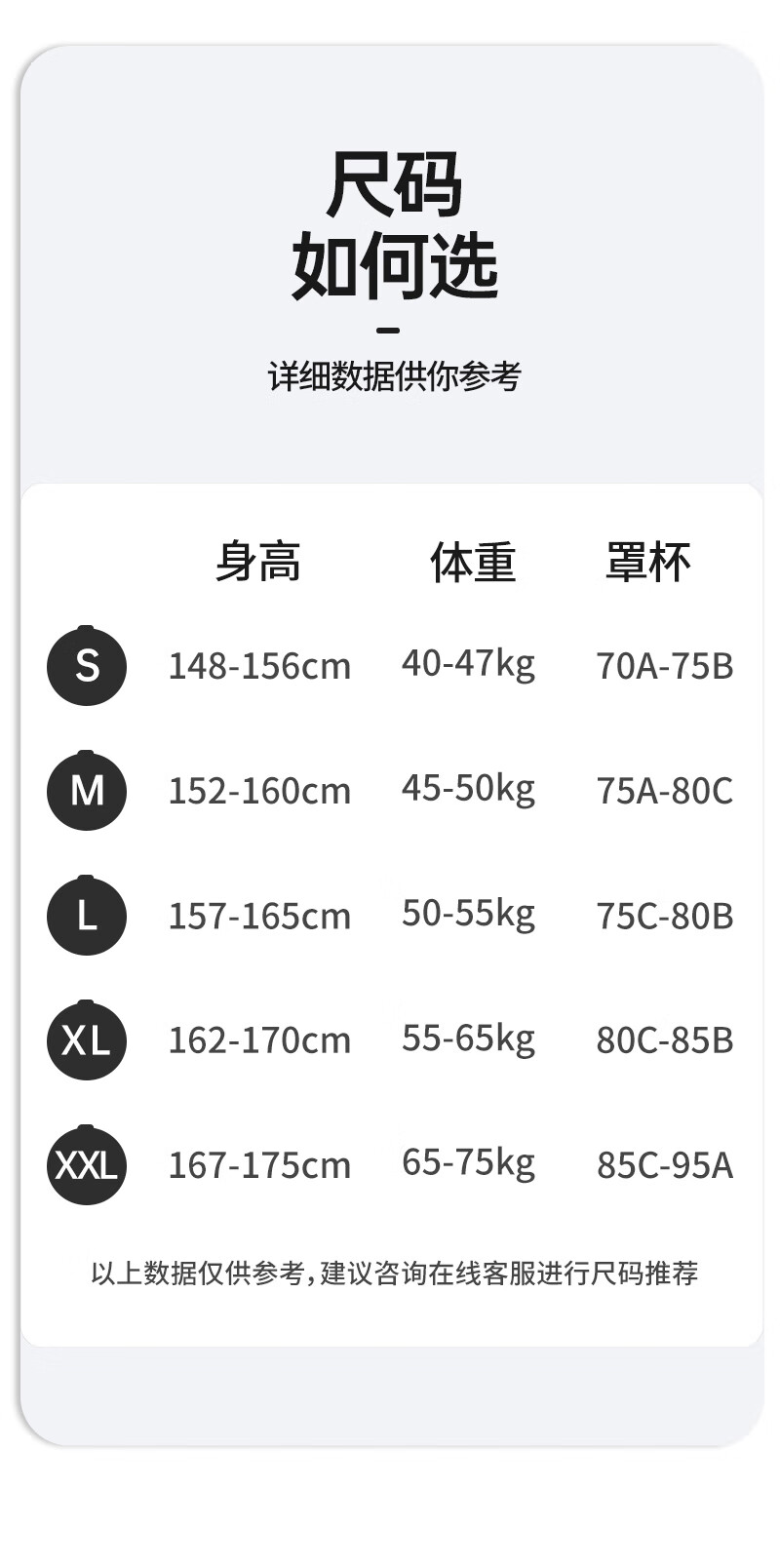 China (cm) 160-165/84-86 165-170 / 88-90 167-172 / 92-96 168-173 / 98-102 170-176 / 106-110