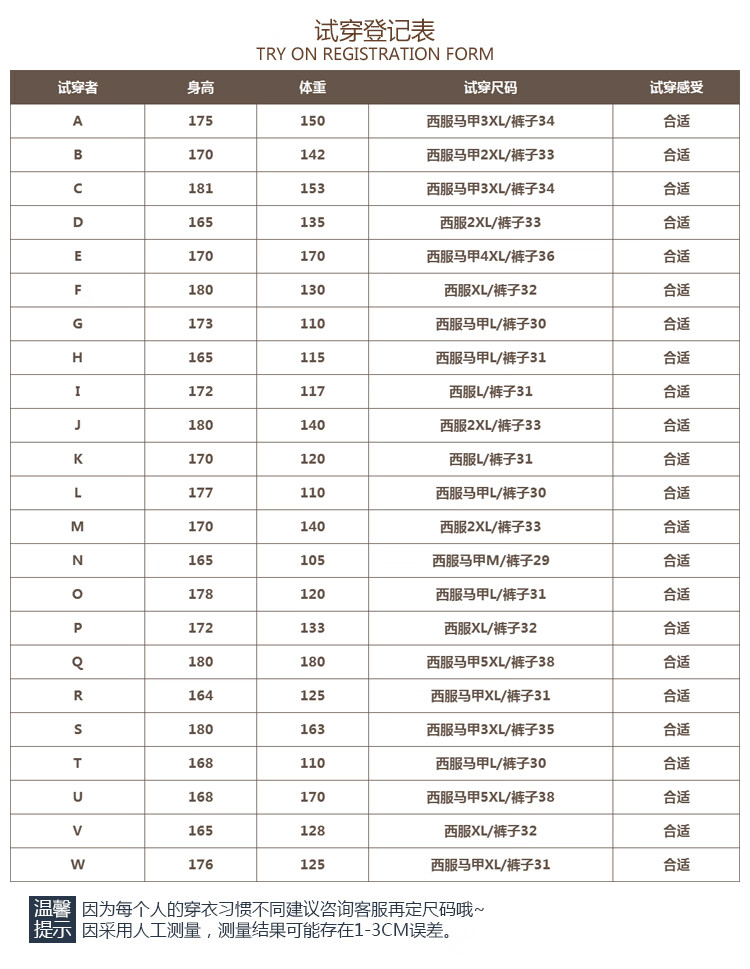 China (cm) 165 / 88-90 170 / 96-98 175 / 108-110 180 / 118-122 185 / 126-130