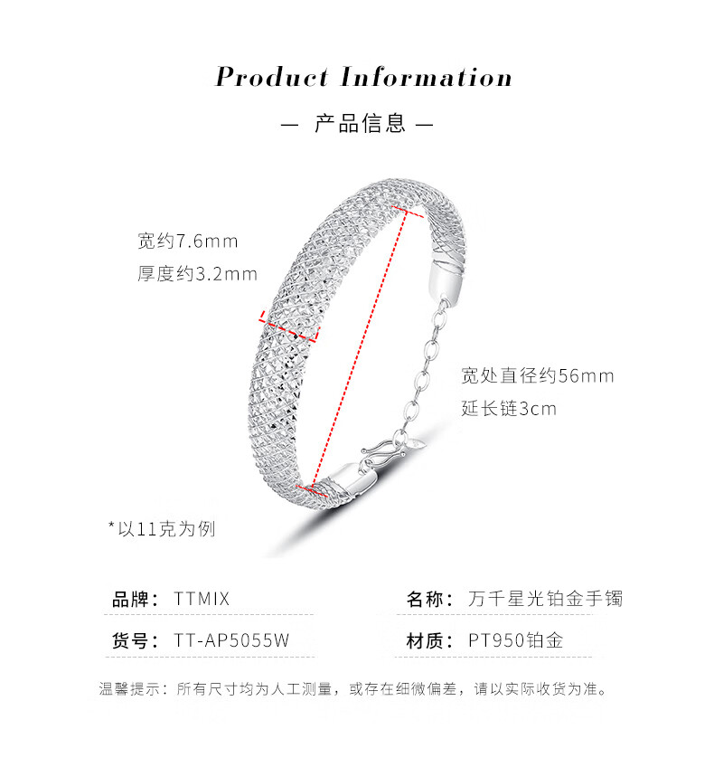 TTMIX Brilliant Starlight Platinum Bracelet PT950 Platinum Temperament Fashion Bracelet Wire Bracelet Birthday Gift 56mm Weight 15.26g Width 10.1mm