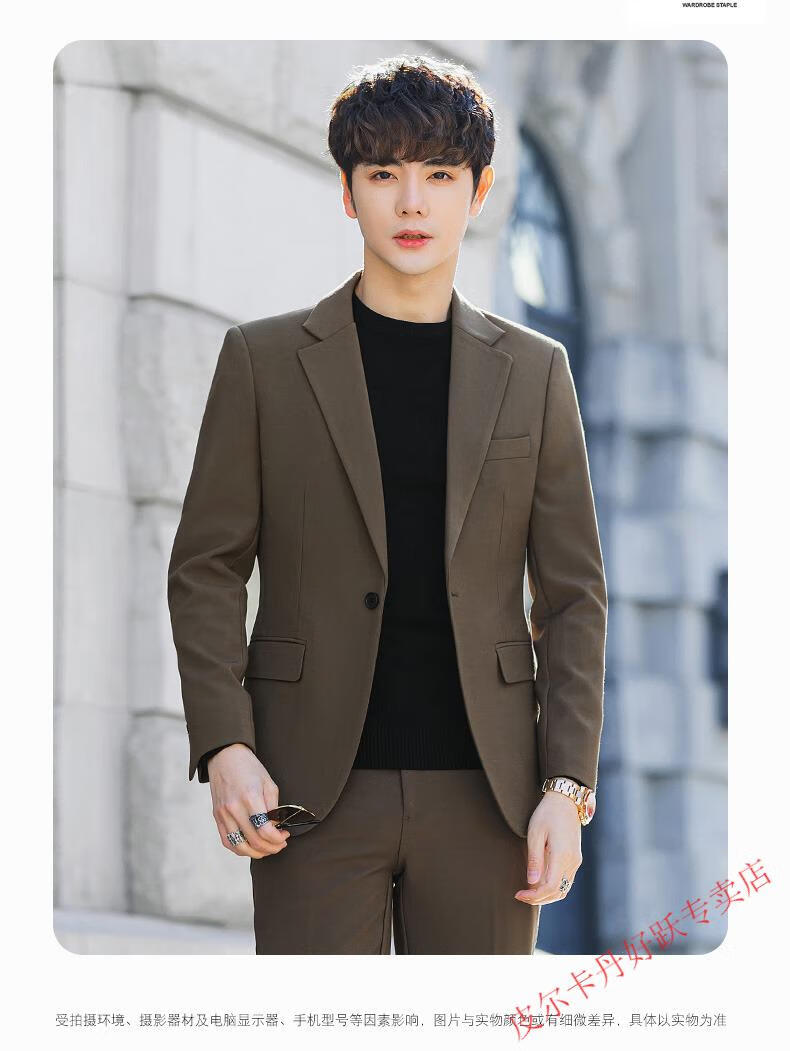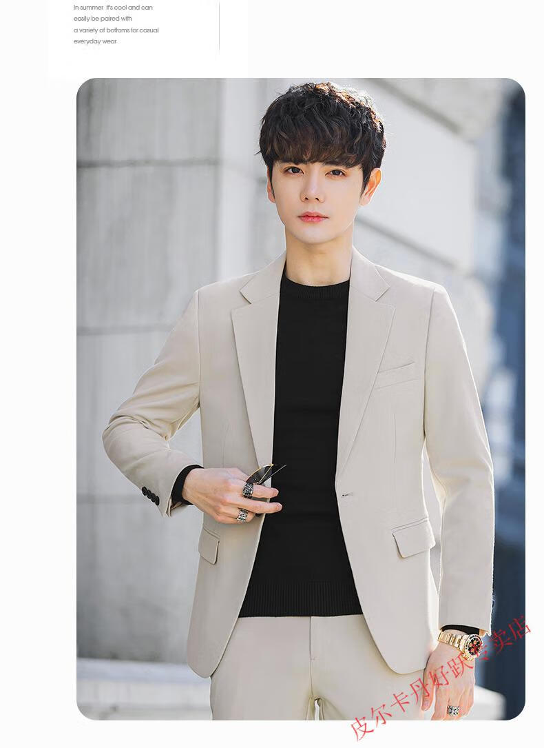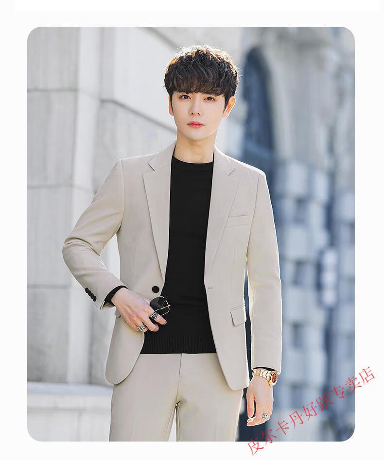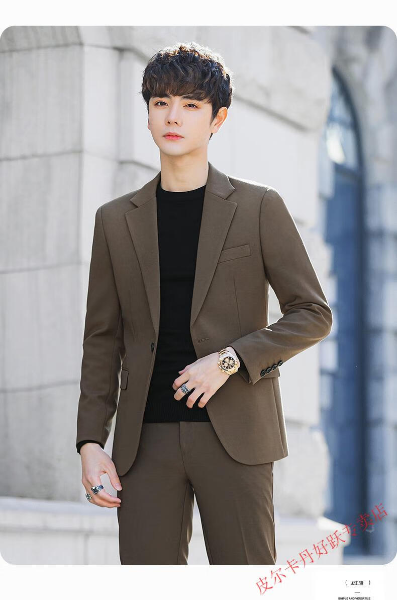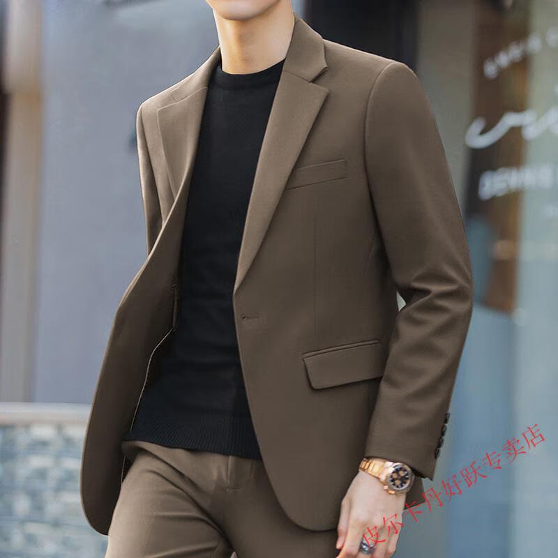Pierre Cardin men's brown suit spring and autumn slim handsome casual small suit jacket men's Korean style trendy wedding top apricot suit + pants + white shirt M