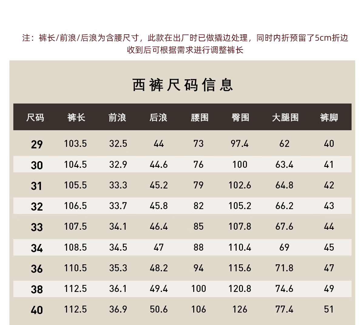 Outseam (cm) 99 cm 101.5 cm 104 cm 106.5 cm 109 cm