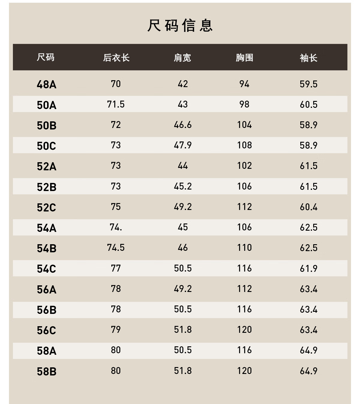 China (cm) 160-165/84-86 165-170 / 88-90 167-172 / 92-96 168-173 / 98-102 170-176 / 106-110