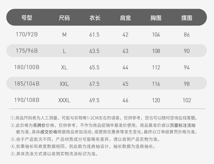 China (cm) 160-165/84-86 165-170 / 88-90 167-172 / 92-96 168-173 / 98-102 170-176 / 106-110