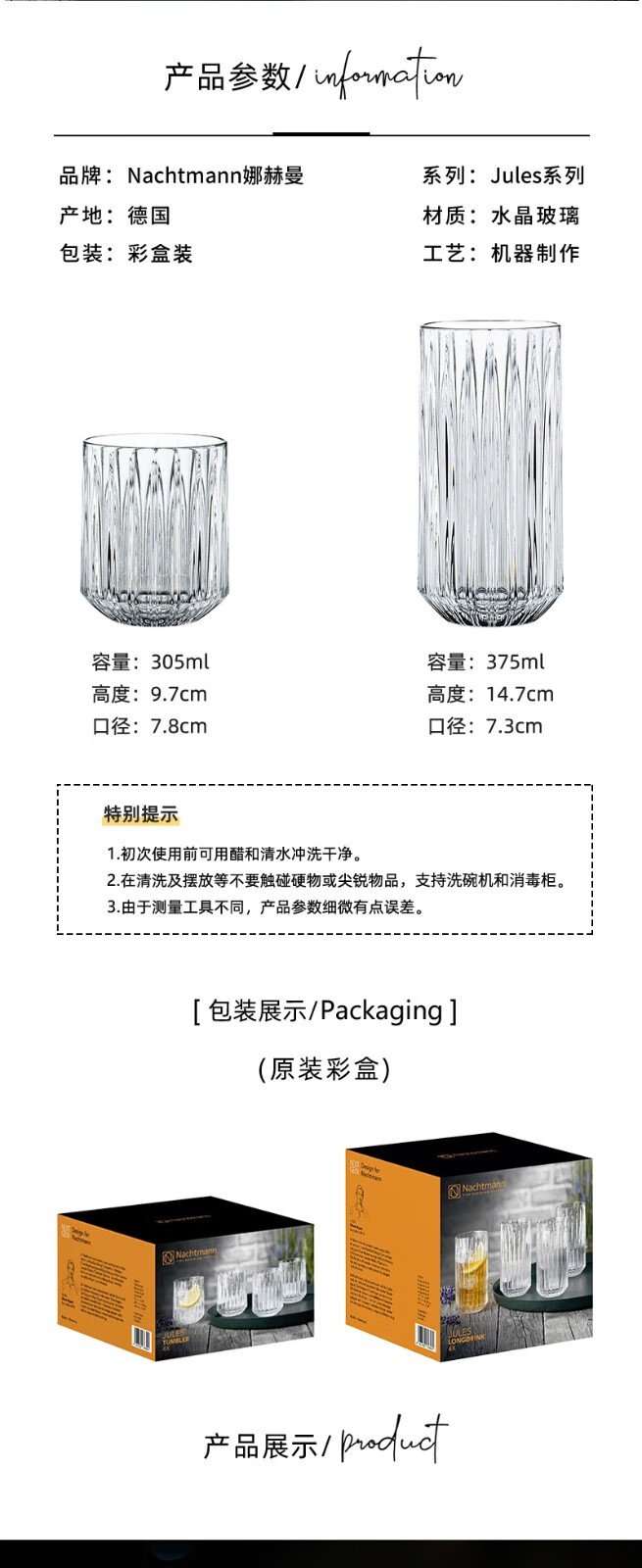 Nachtmann German imported Nachtmann crystal glass whiskey wine glass beer glass household water glass juice glass single/Jules whiskey glass 348ML