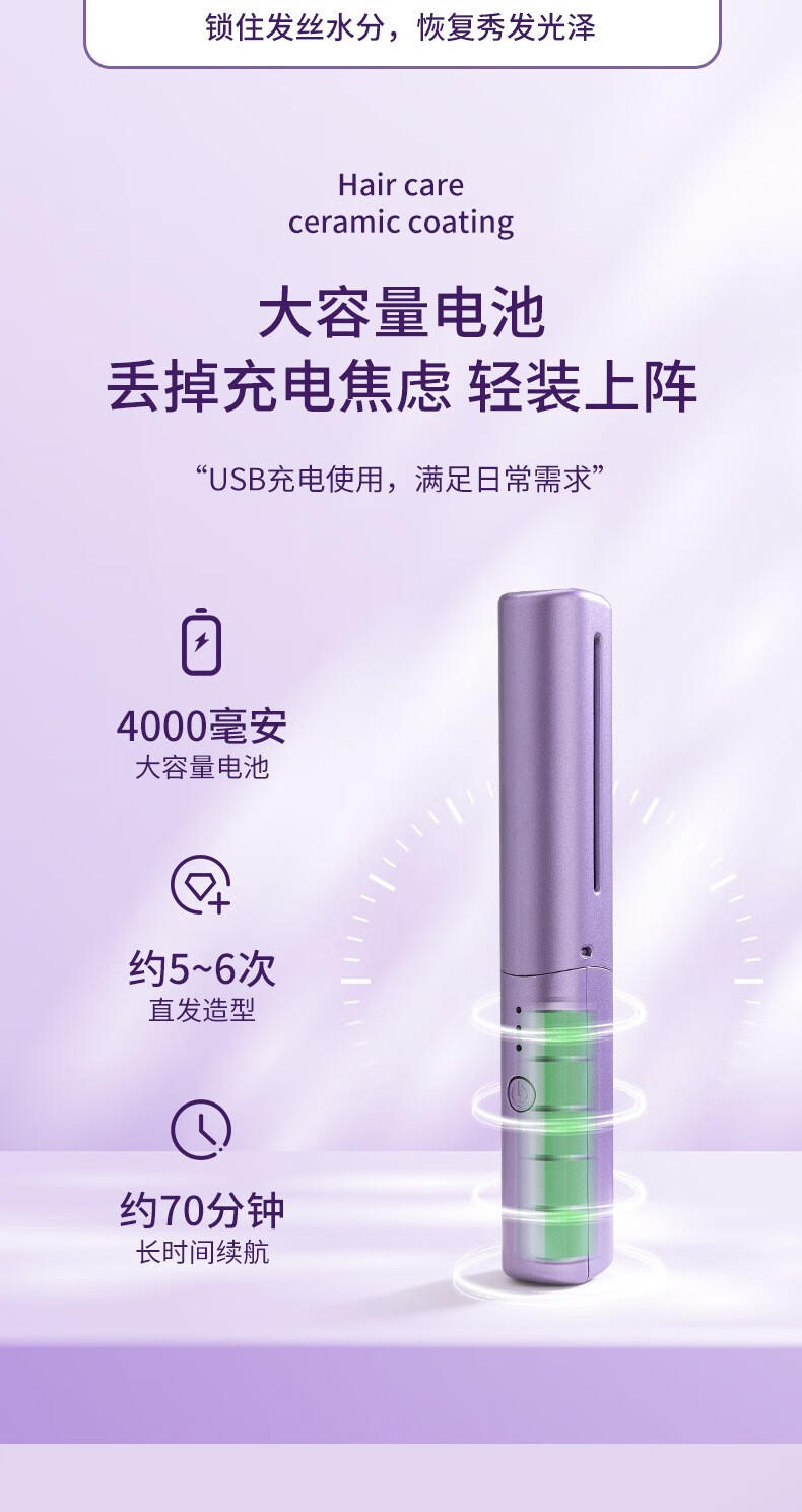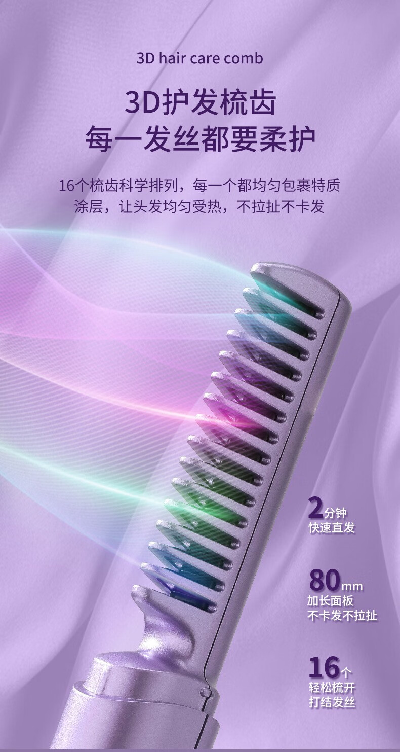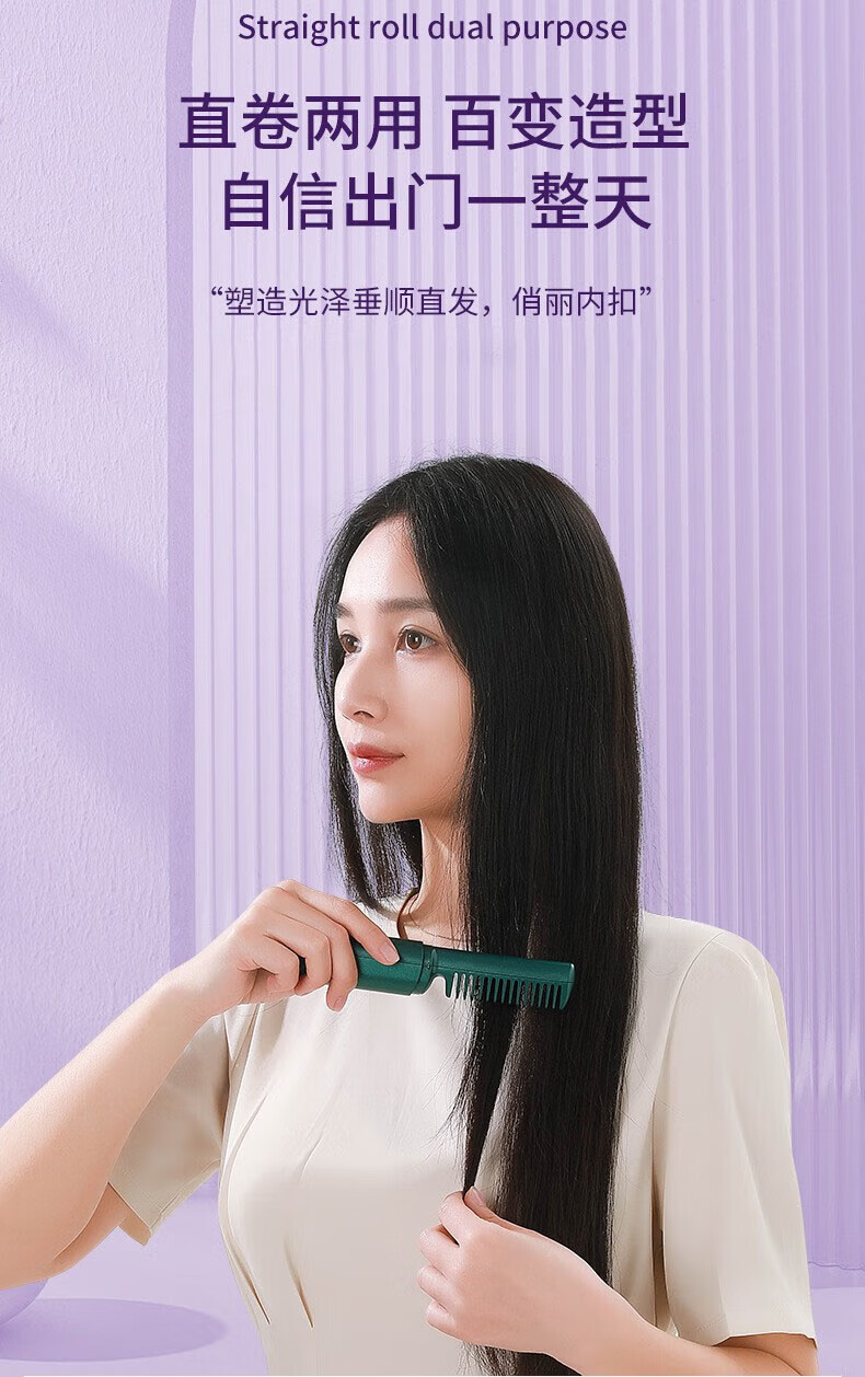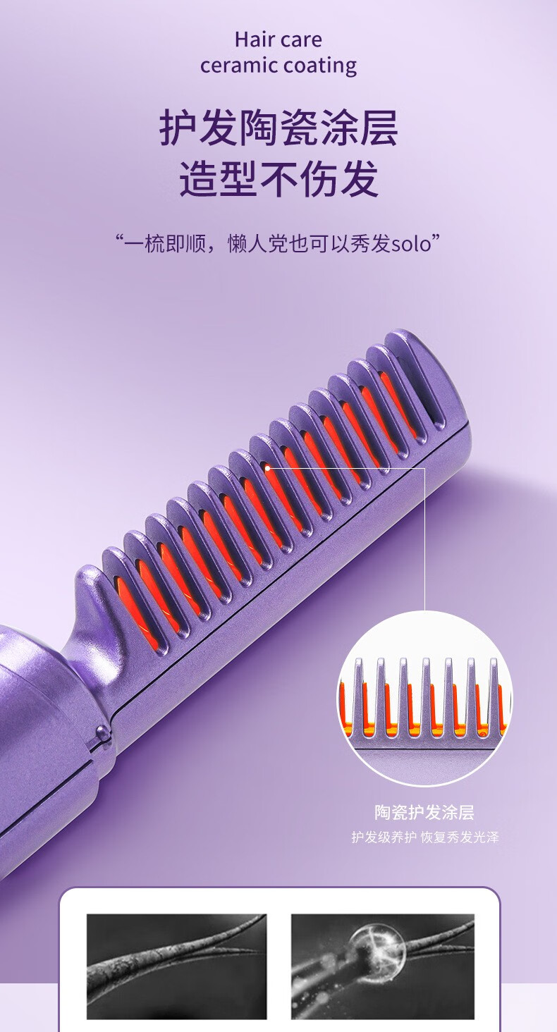 Wireless hair straightening comb, negative ion curling iron, nourishes hair without damaging hair, curls and straightens, dual-purpose lazy curling iron, home portable hair styling comb, electronic comb straightening splint, wireless curling iron, hibiscus purple, 3-level temperature control + negative ion hair care