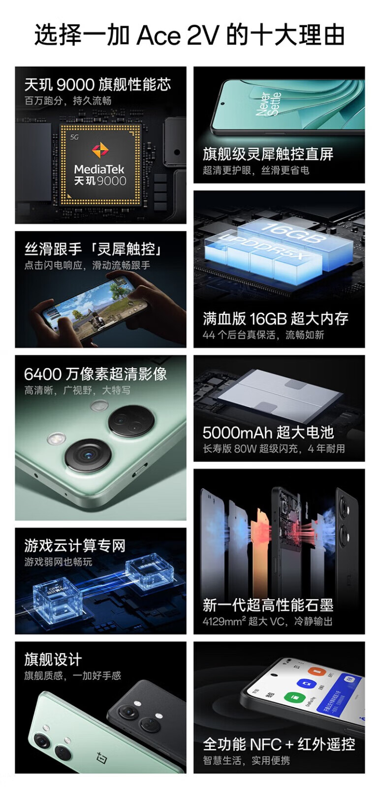 OPPO OnePlus Ace 2V second-hand mobile phone Dimensity 9000 flagship core 1.5K Lingxi touch direct screen 5G performance gaming phone celadon 16GB+256GB free super fast charge 99 new