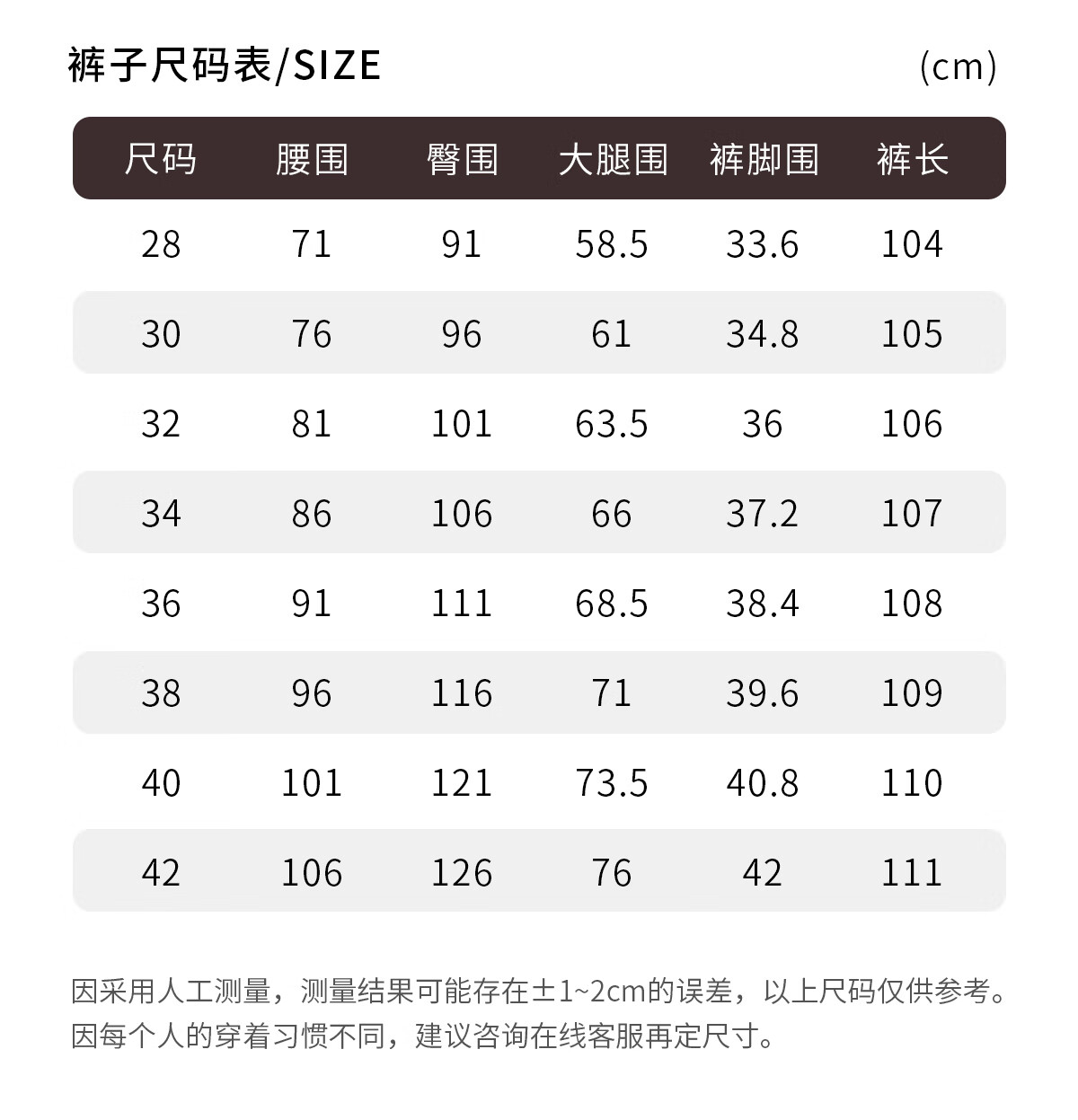 Outseam (cm) 99 cm 101.5 cm 104 cm 106.5 cm 109 cm