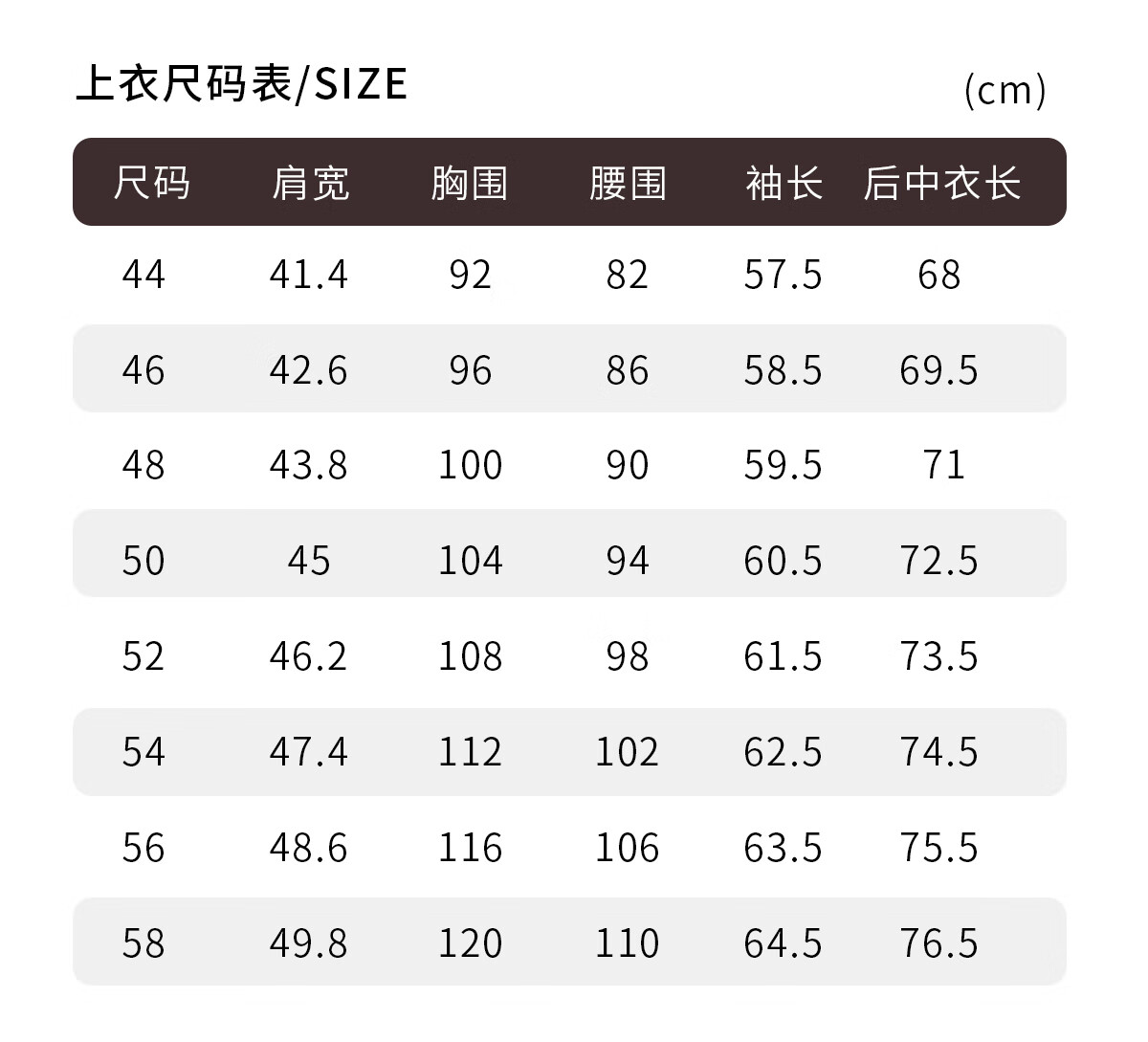 Size (cm) 42 44 46 48 50