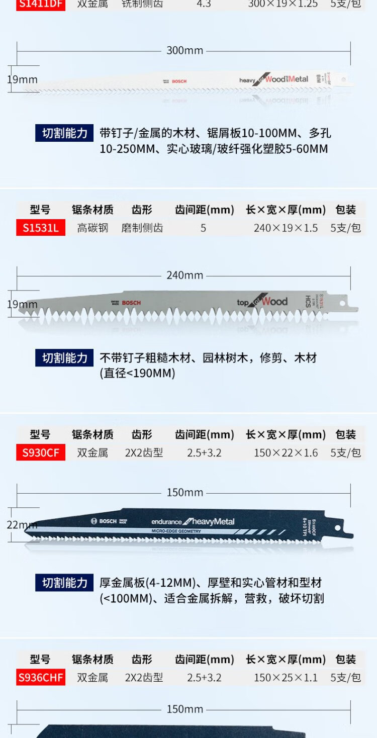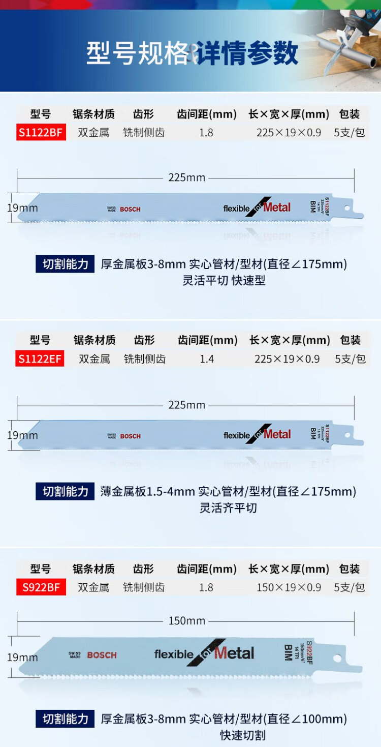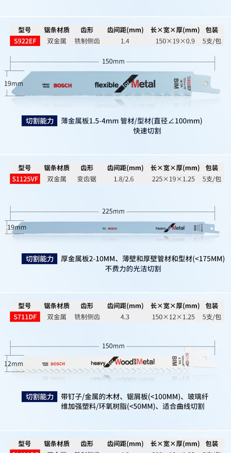 Bosch (BOSCH) imported saber saw blade electric saw reciprocating saw blade metal cutting rapid profile pipe stainless steel aluminum alloy cutting metal S1225VF professional type (5 pieces)