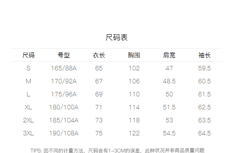 China (cm) 165 / 88-90 170 / 96-98 175 / 108-110 180 / 118-122 185 / 126-130