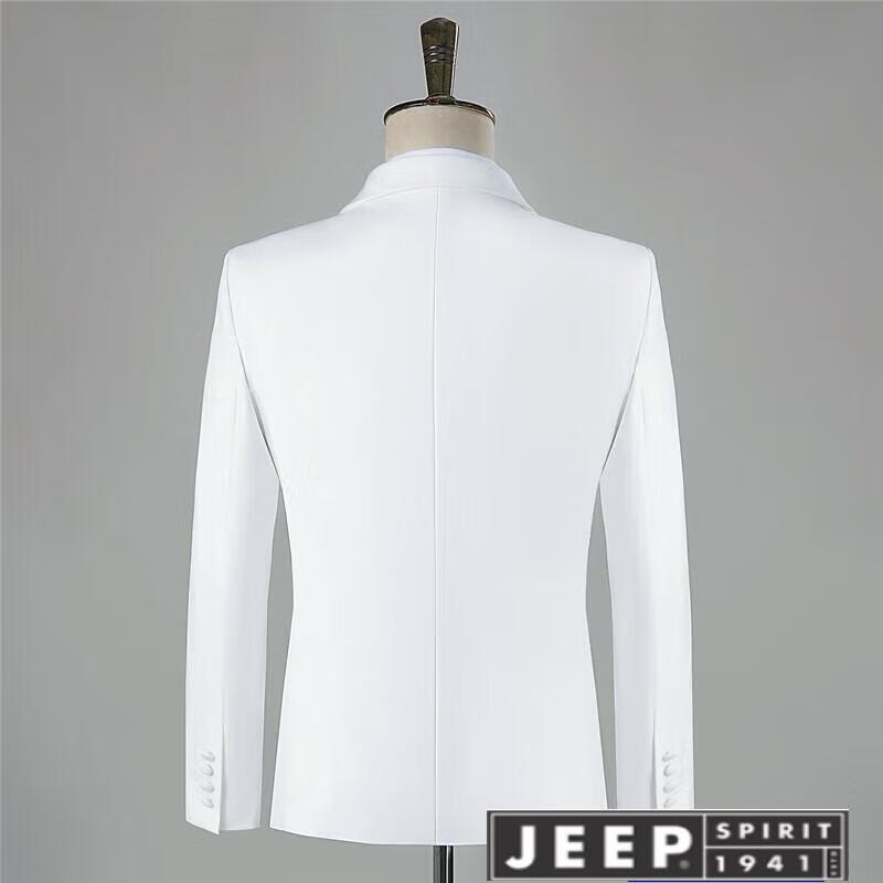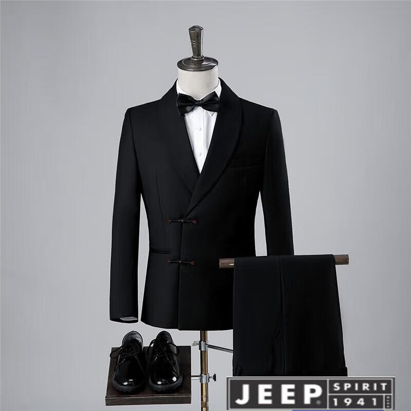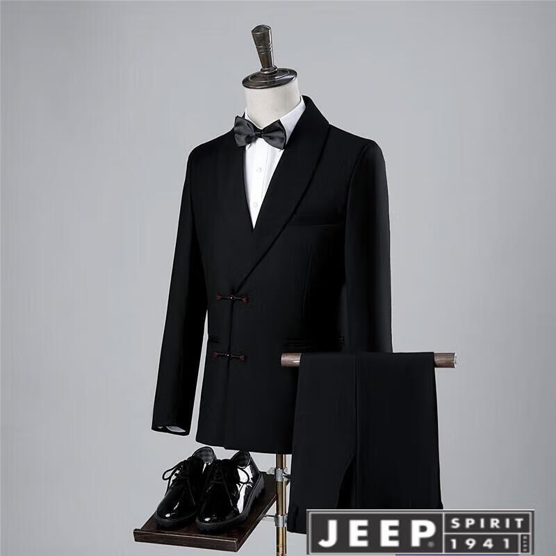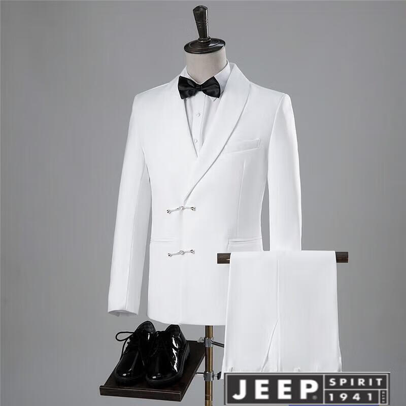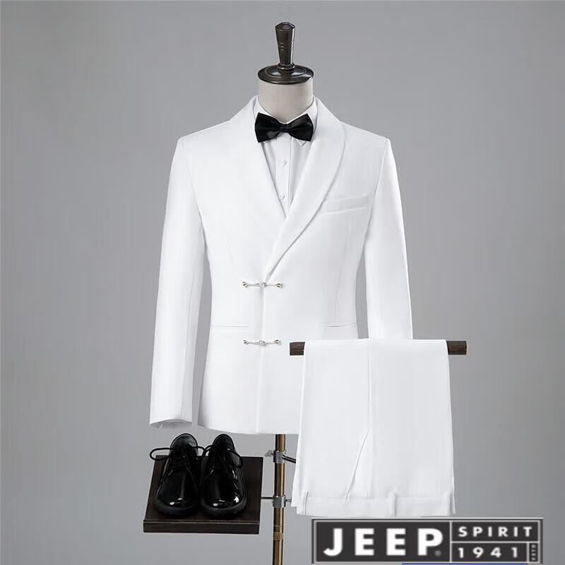 JEEP high-end Chinese-style buckle suit, green fruit collar, black studio wedding dress, Chinese style slim performance suit, white jacket + pants, size L, height 170-175, weight 55-65 kg