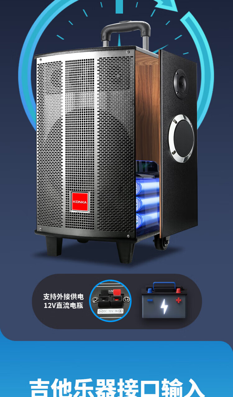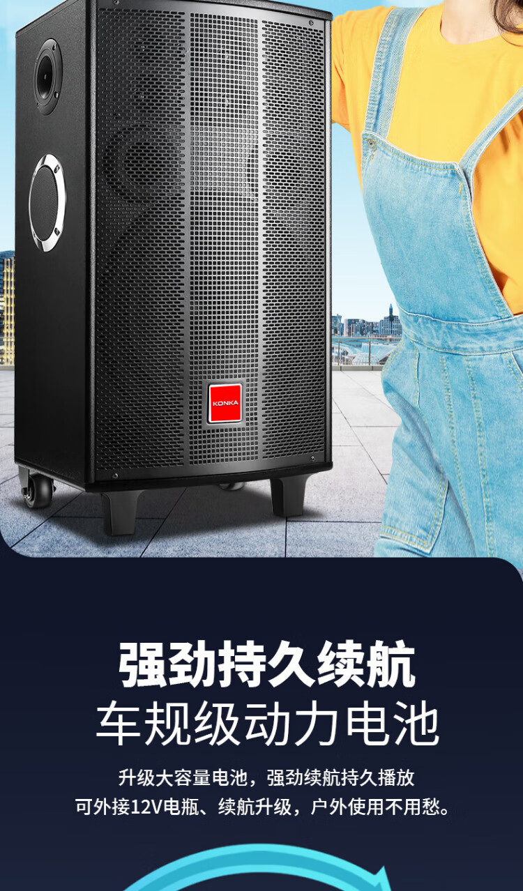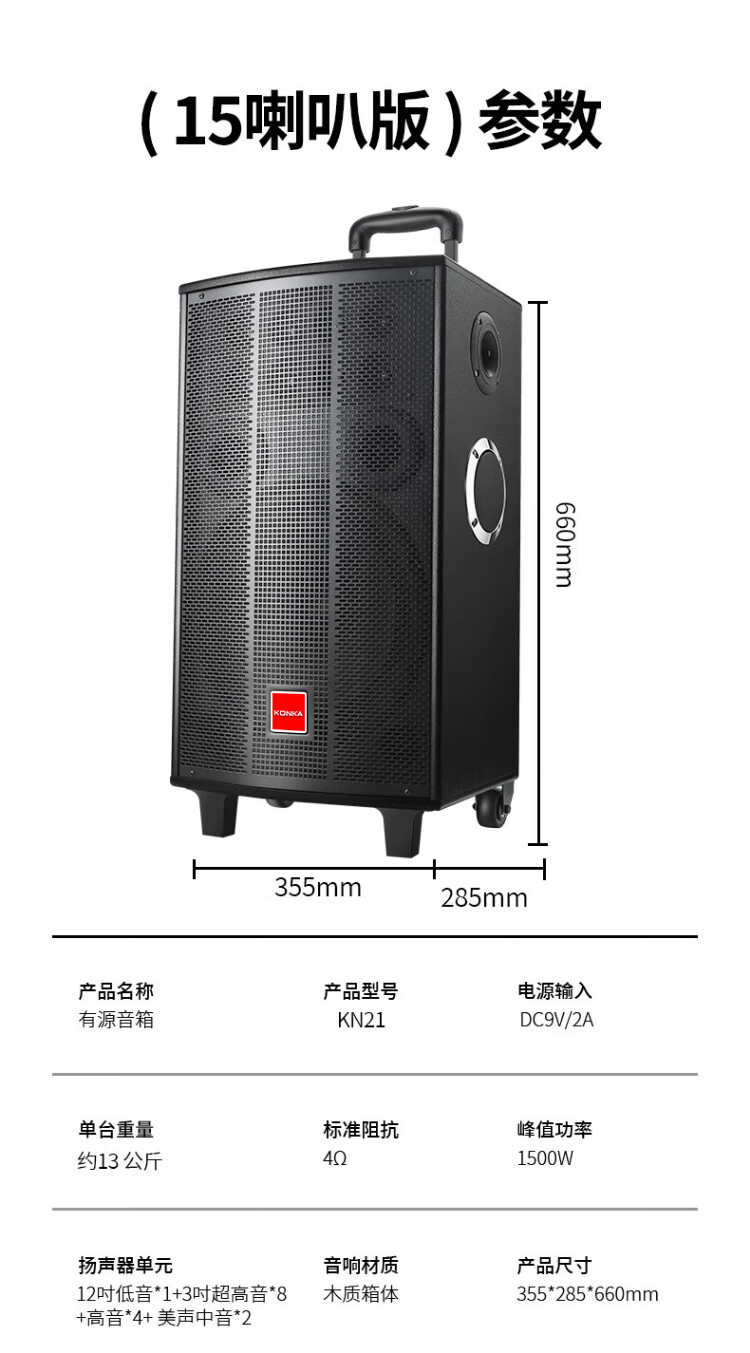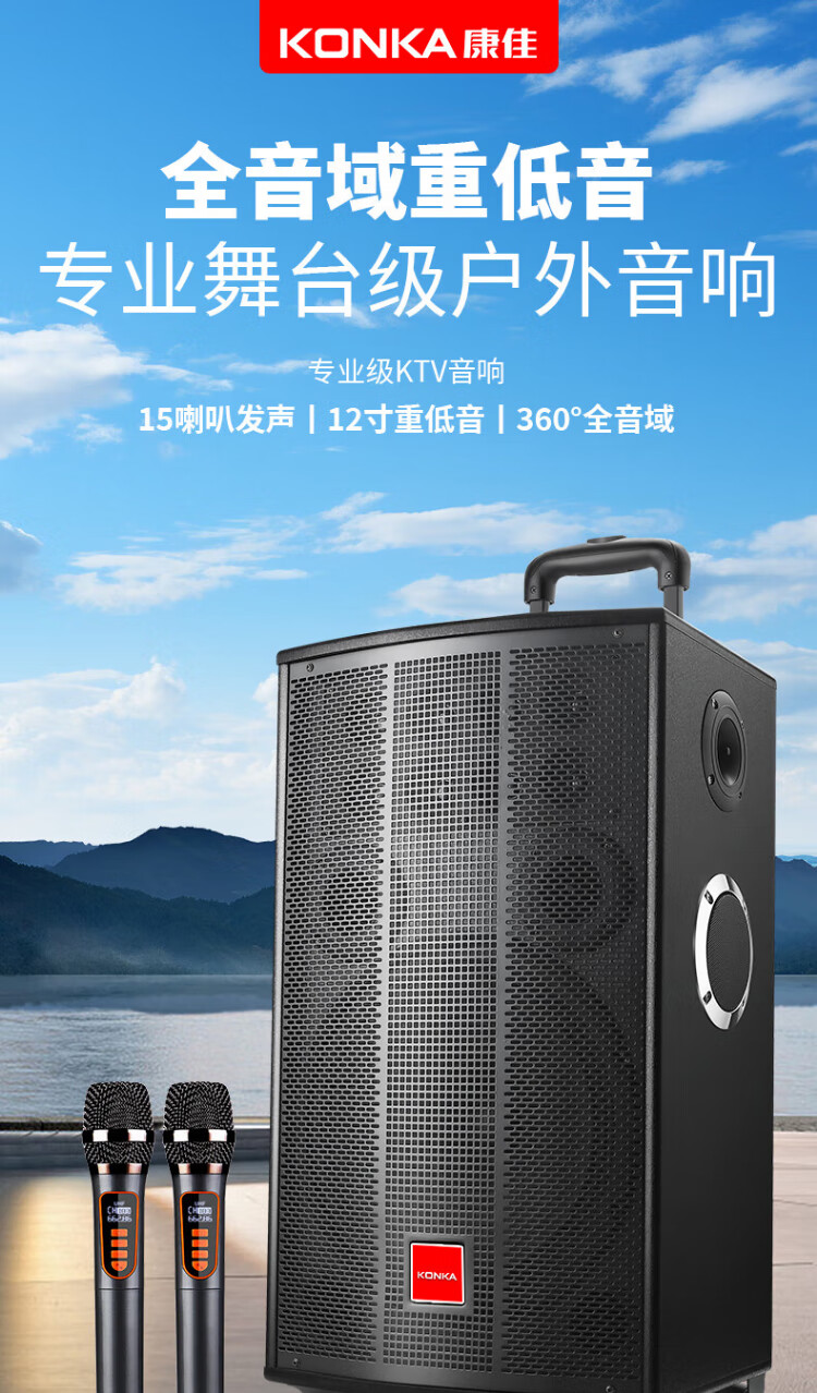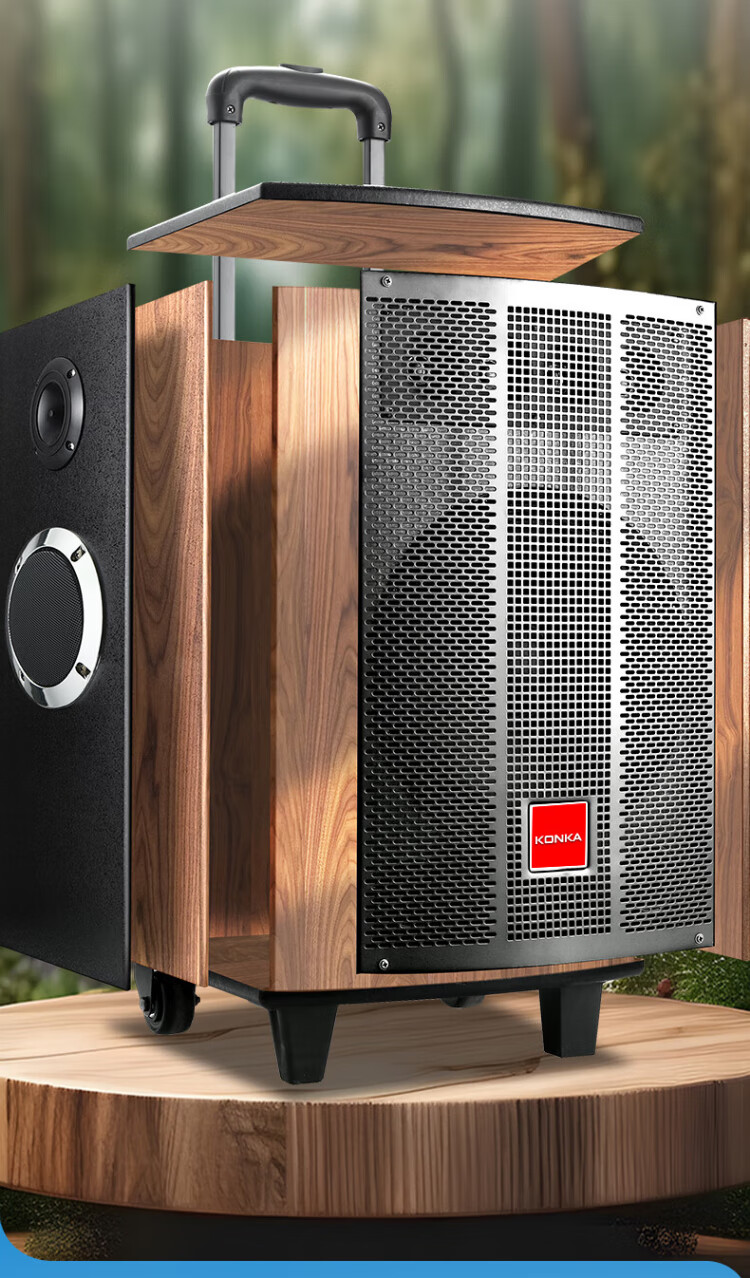Konka square dance audio three-way outdoor mobile trolley performance dancing and singing karaoke speaker wooden household portable Bluetooth high-power volume with wireless microphone subwoofer 15 speakers + 2 rechargeable microphones