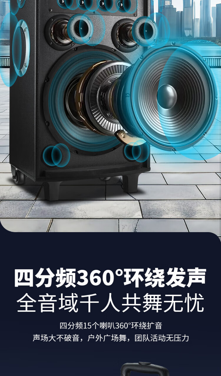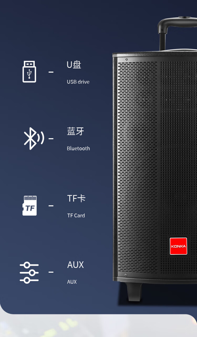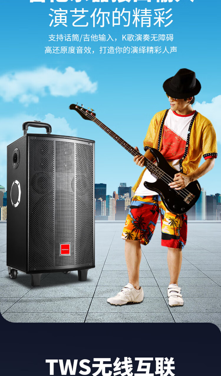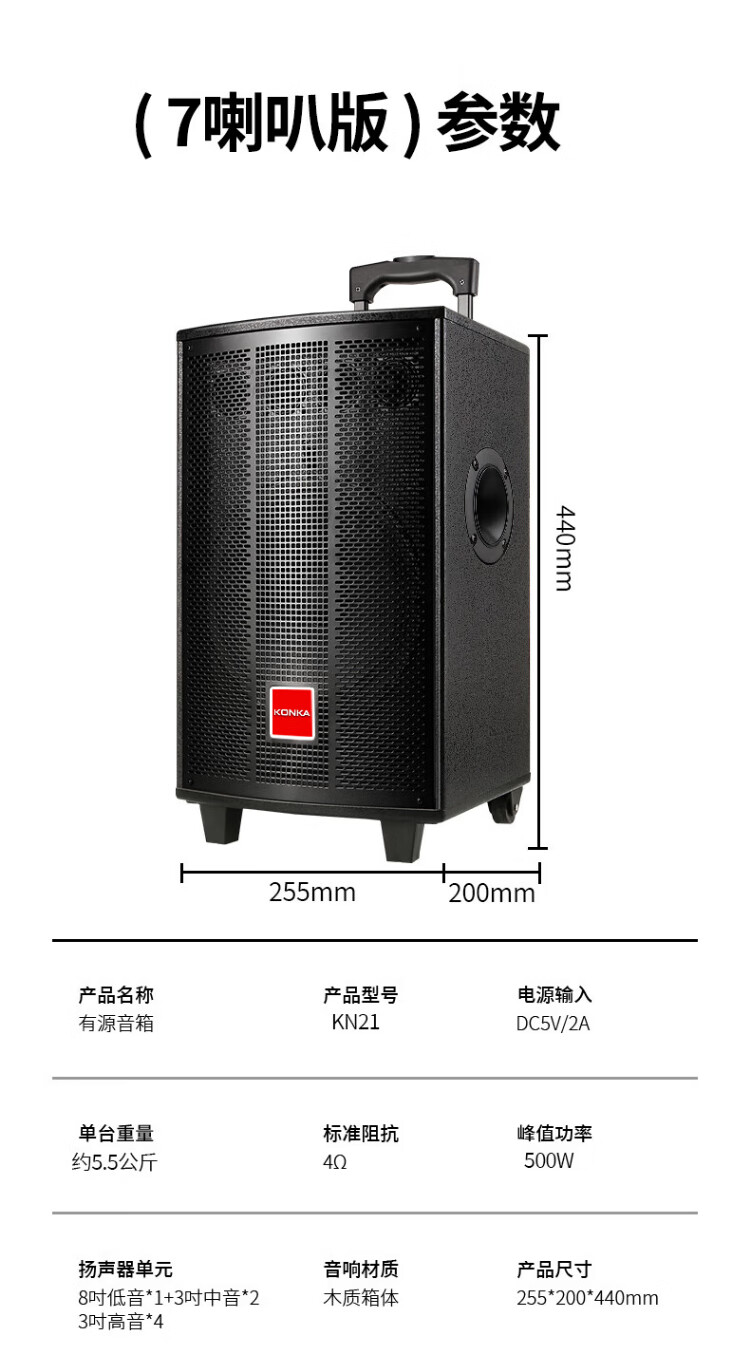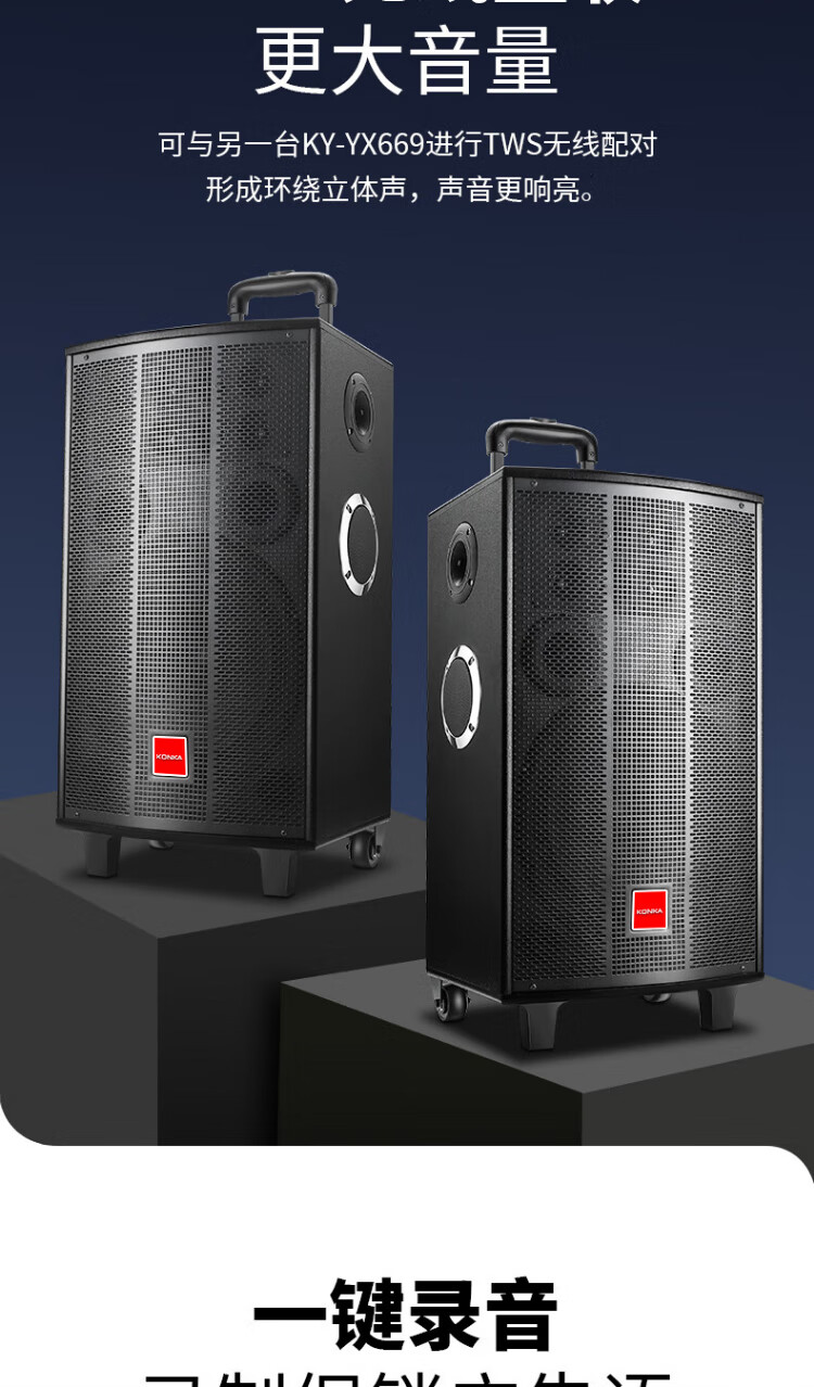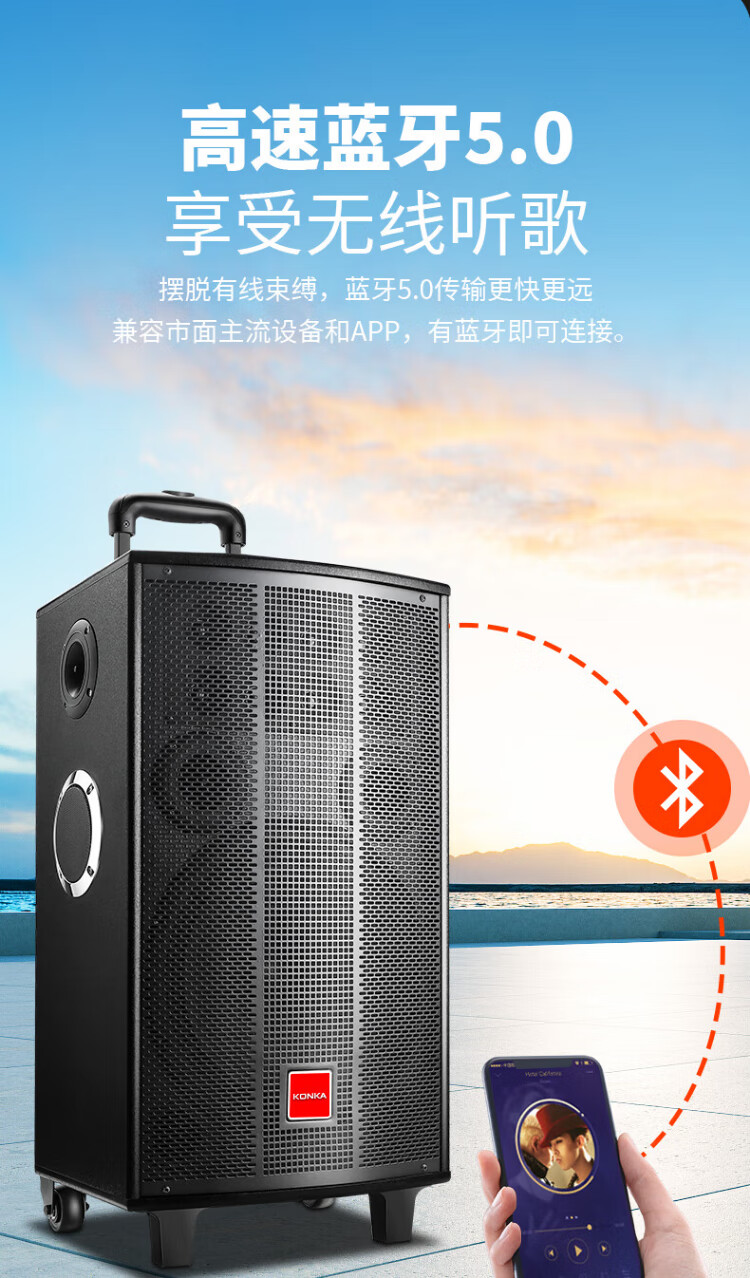 Konka square dance audio three-way outdoor mobile trolley performance dancing and singing karaoke speaker wooden household portable Bluetooth high-power volume with wireless microphone subwoofer 15 speakers + 2 rechargeable microphones