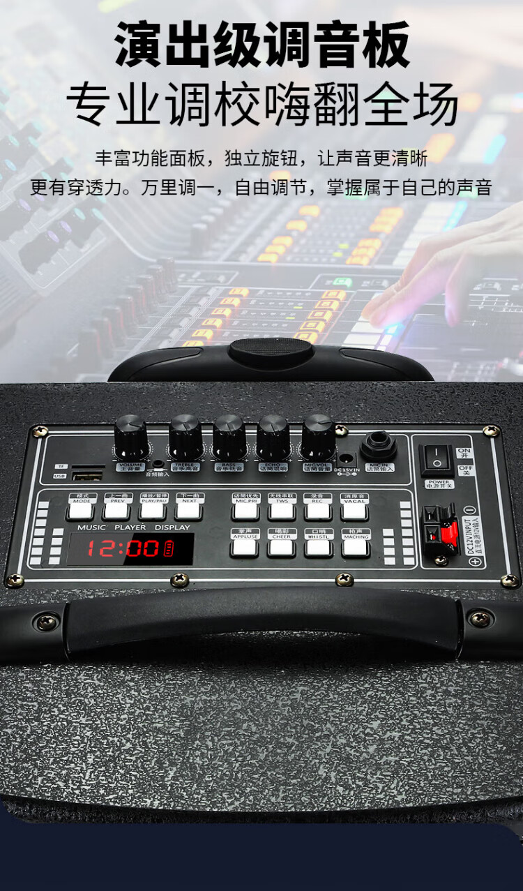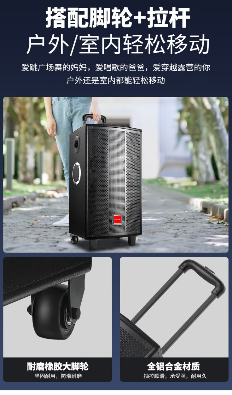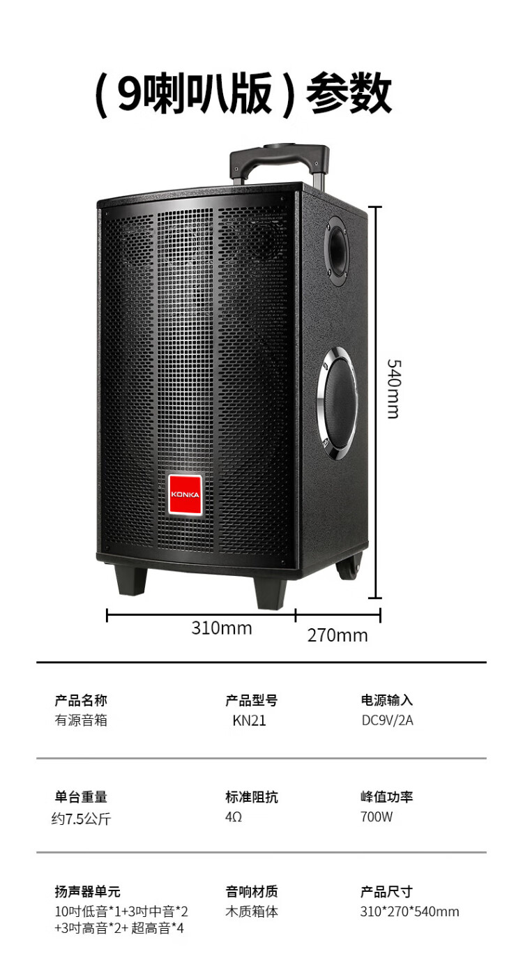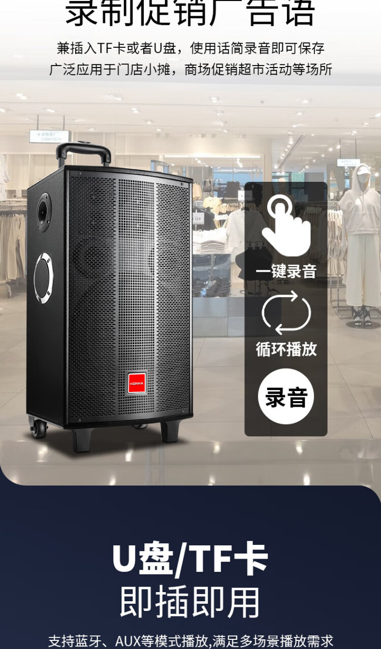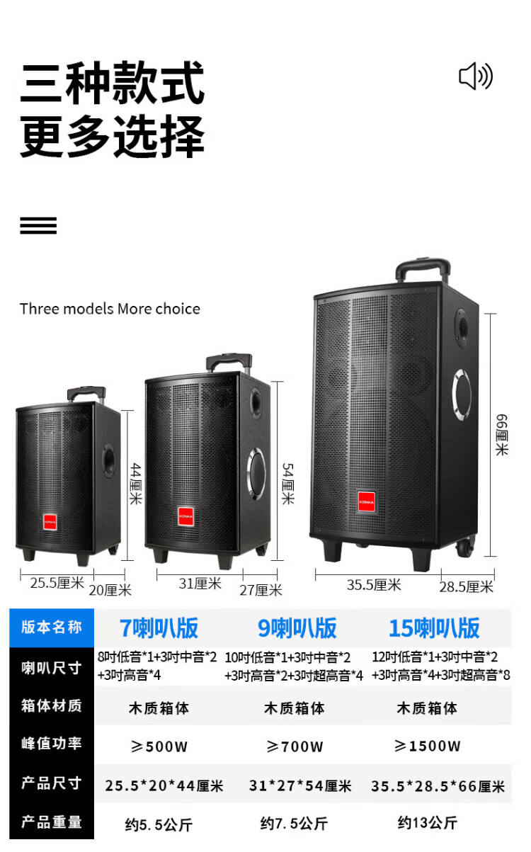Konka square dance audio three-way outdoor mobile trolley performance dancing and singing karaoke speaker wooden household portable Bluetooth high-power volume with wireless microphone subwoofer 15 speakers + 2 rechargeable microphones