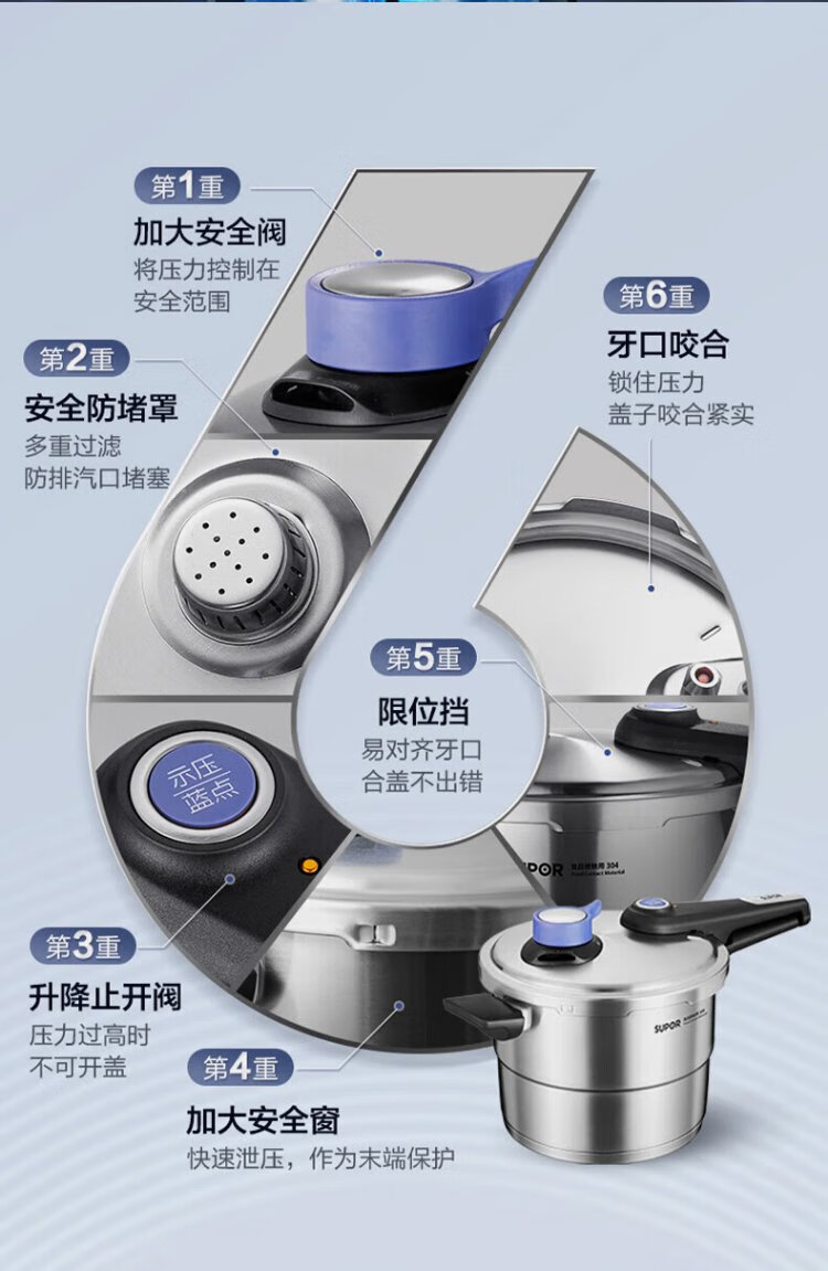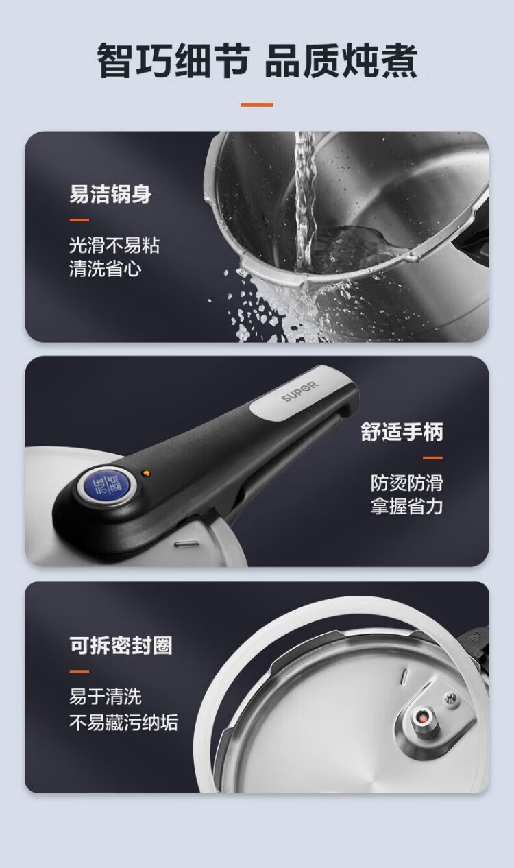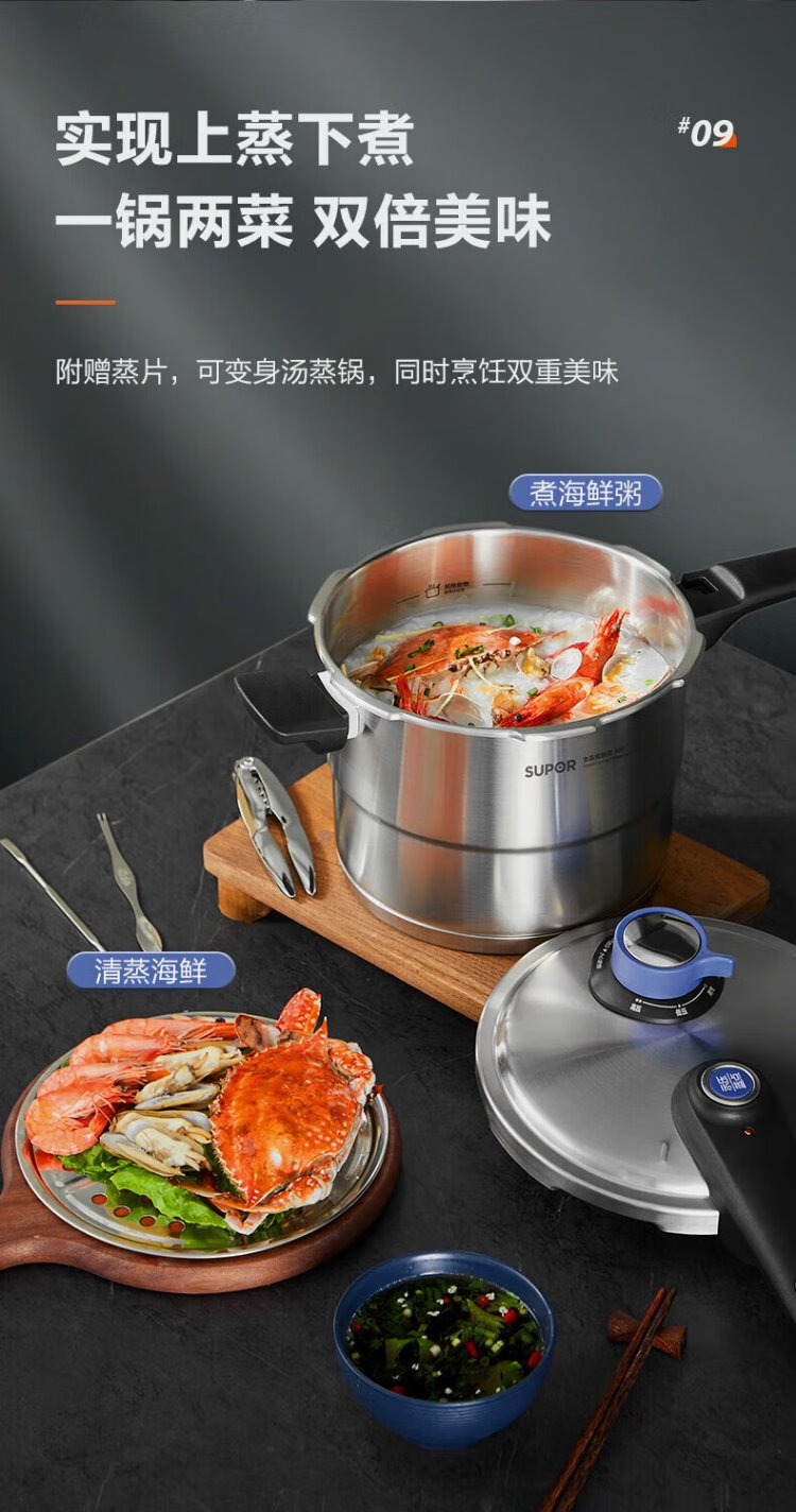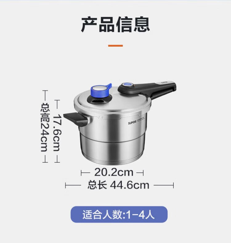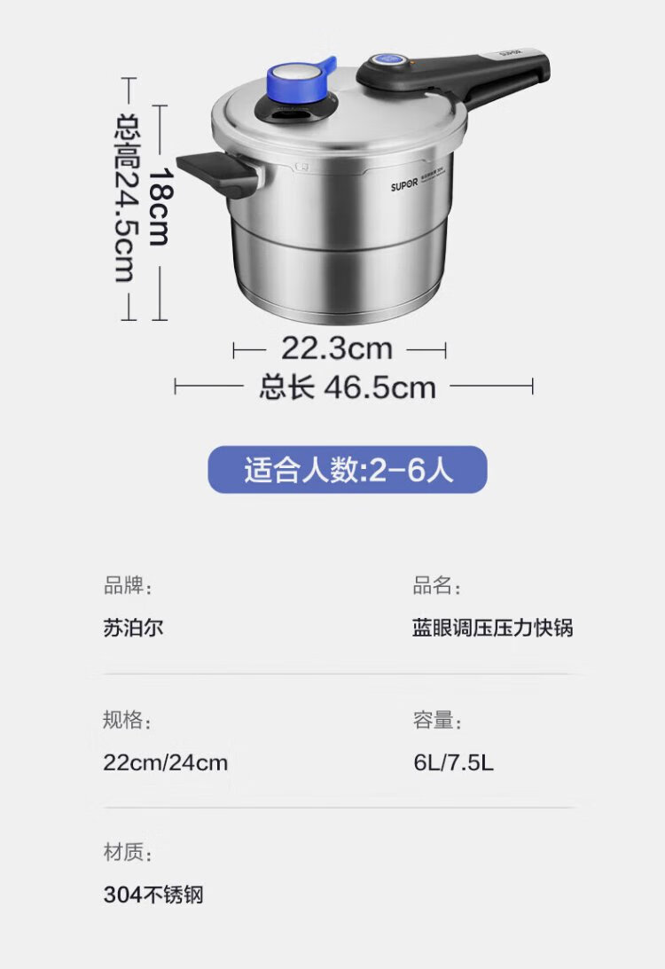 SUPOR pressure cooker 304 stainless steel pressure cooker high corrosion resistance gas stove induction cooker universal fast cooking adjustable pressure 7.5L three-speed pressure adjustment suitable for 2-6 people 24cm