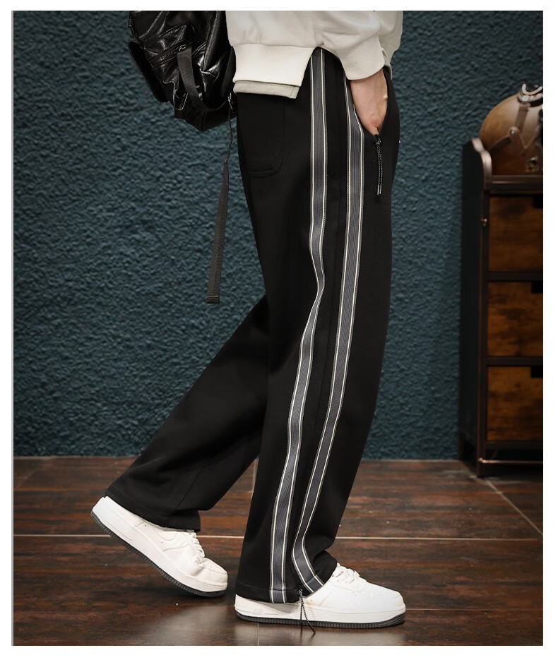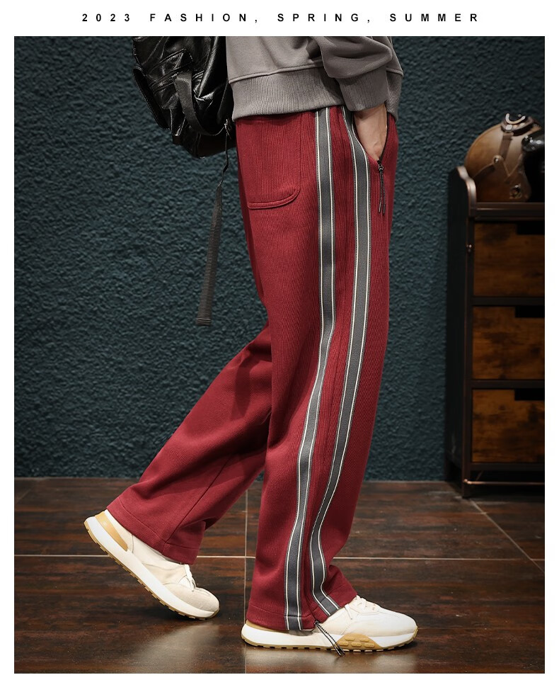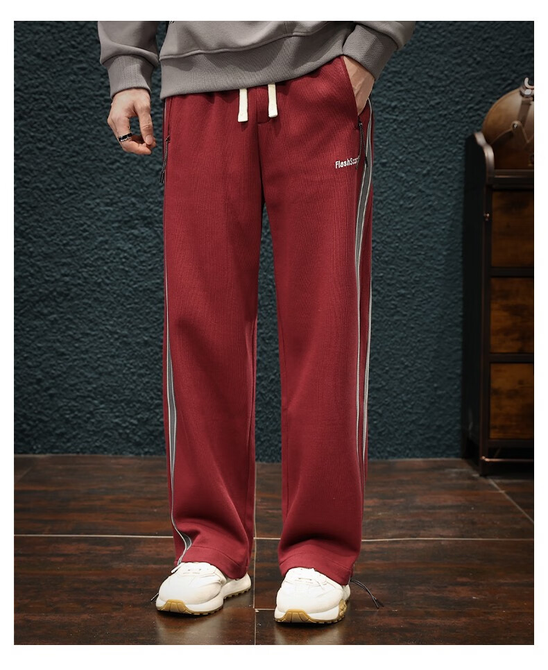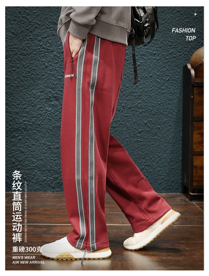 Jingulai striped straight-leg sweatpants for men in spring and autumn, loose zipper pockets, large size fat sweatpants, men's casual pants, red, thickened, velvet, 3XL, weight 180-200Jin Jin is equal to 0.5 kg