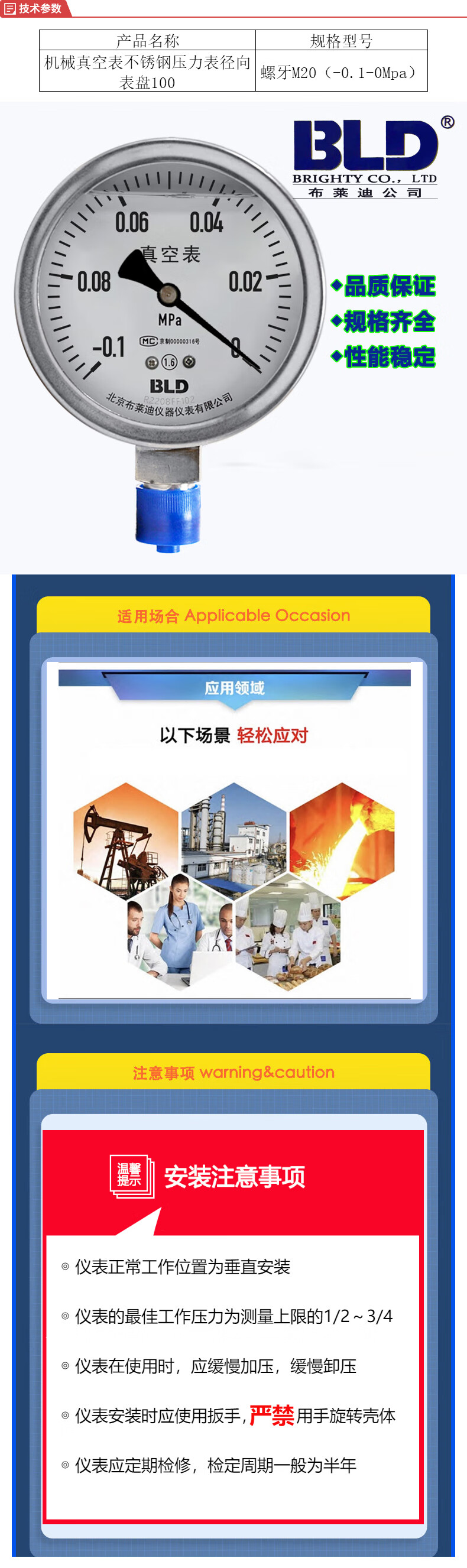 Brady | Mechanical vacuum gauge stainless steel pressure gauge radial dial 100 thread M20 -0.1-0Mpa