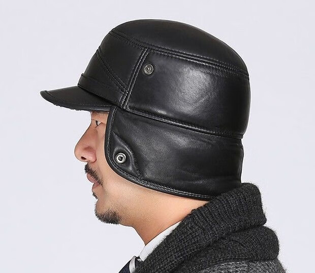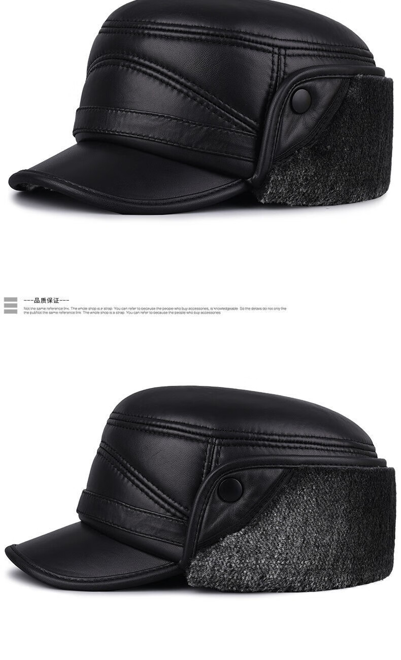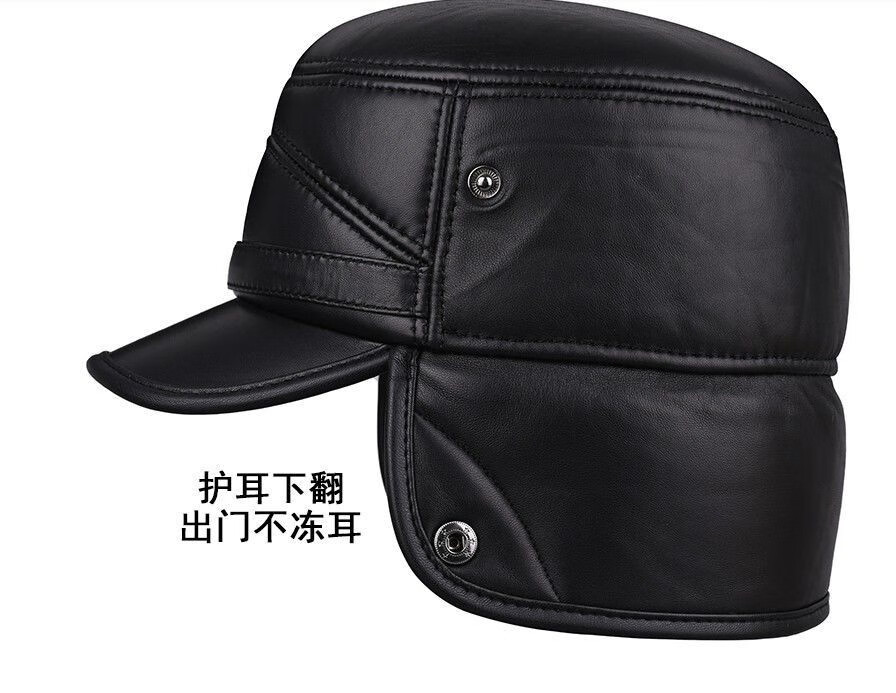 Genuine leather hat for men in winter for middle-aged and elderly people, outdoor cowhide warm ear protection, cold protection, velvet thickened cotton hat, black 57-58CM