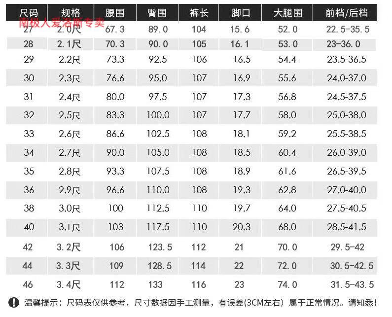 Outseam (cm) 99 cm 101.5 cm 104 cm 106.5 cm 109 cm