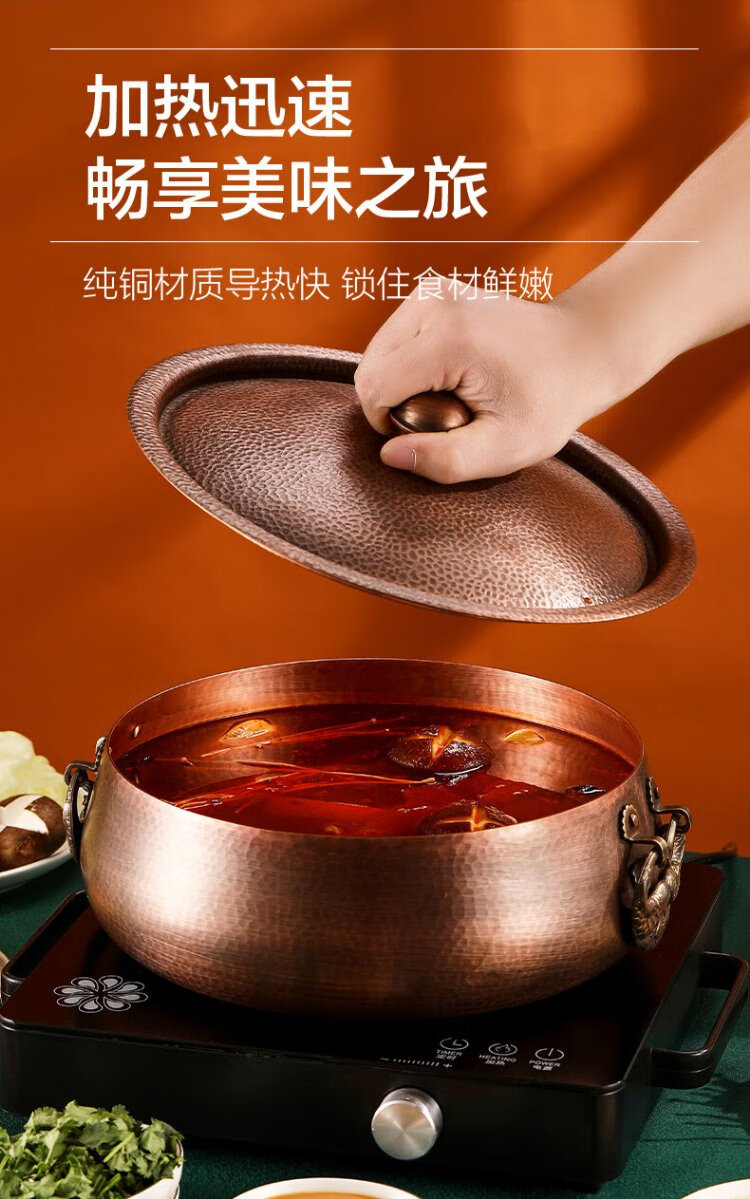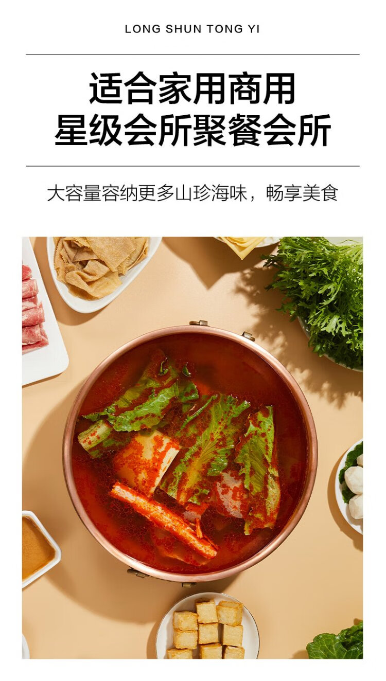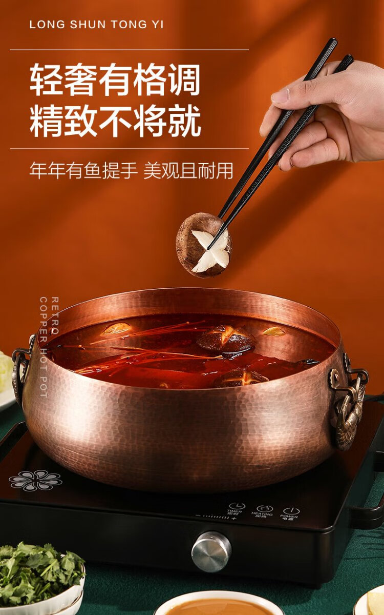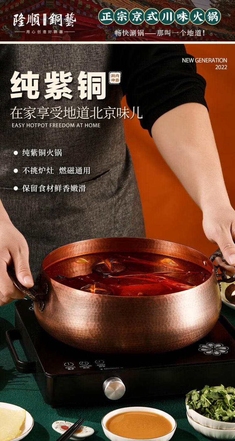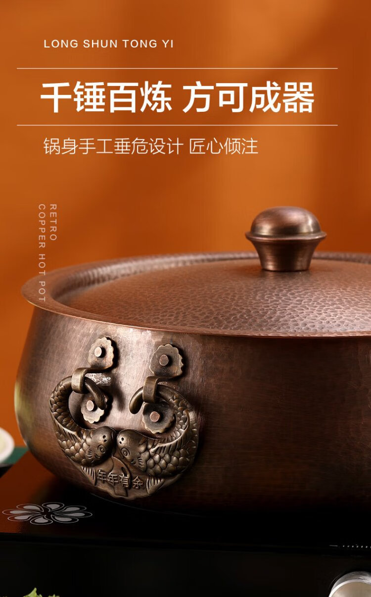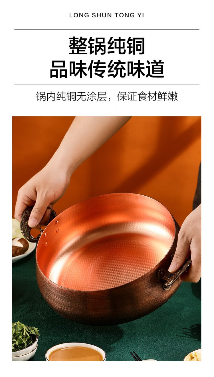 Longshun copper art thickened pure copper hot pot pot induction cooker flat bottom donkey hide gelatin copper pot hot pot Chongqing Sichuan hot pot household and commercial 28cm clear soup pot (more than every year) 6 people 28cm