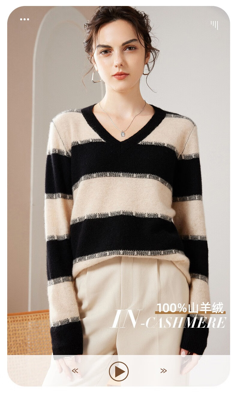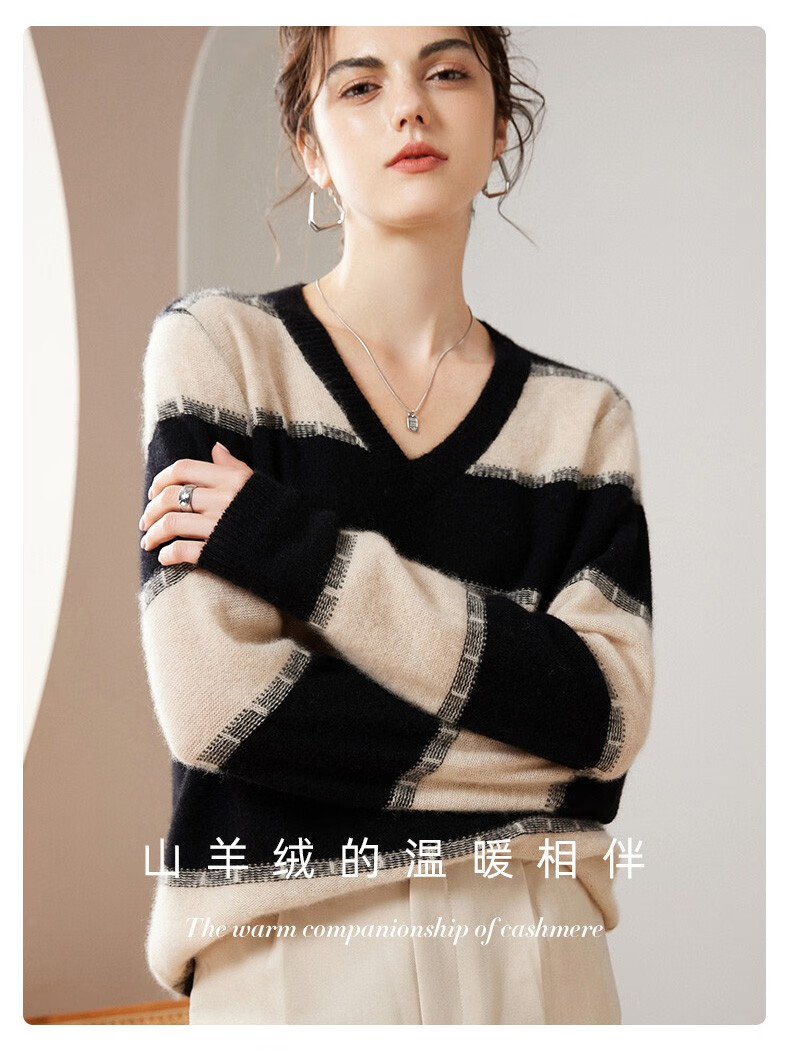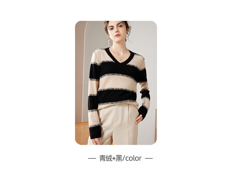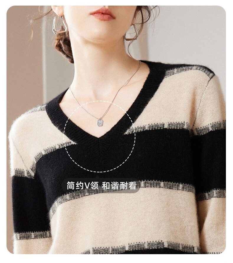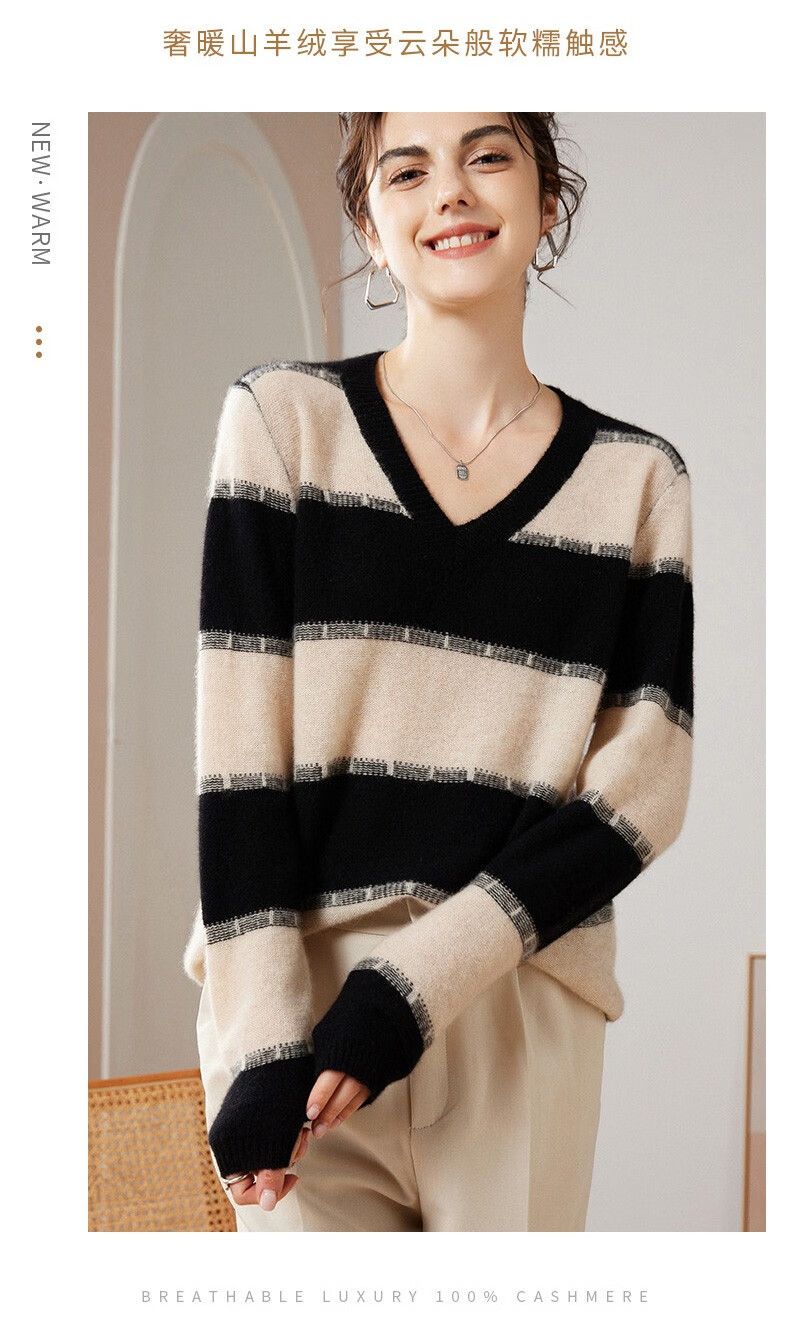 Pash Cashmere Sweater Women's 100% Cashmere Autumn and Winter V-neck Single Yarn Loose Striped Knitted Sweater TY-3134 Green Velvet + Black One Size