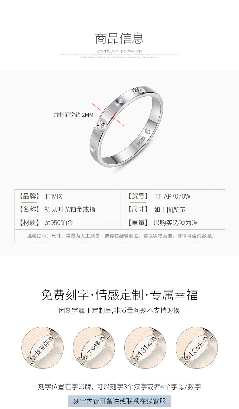 TTMIX platinum ring PT950 women's engraving fashion simple platinum tail ring for girlfriend face width 2.0mm 5# 1.3-1.5g