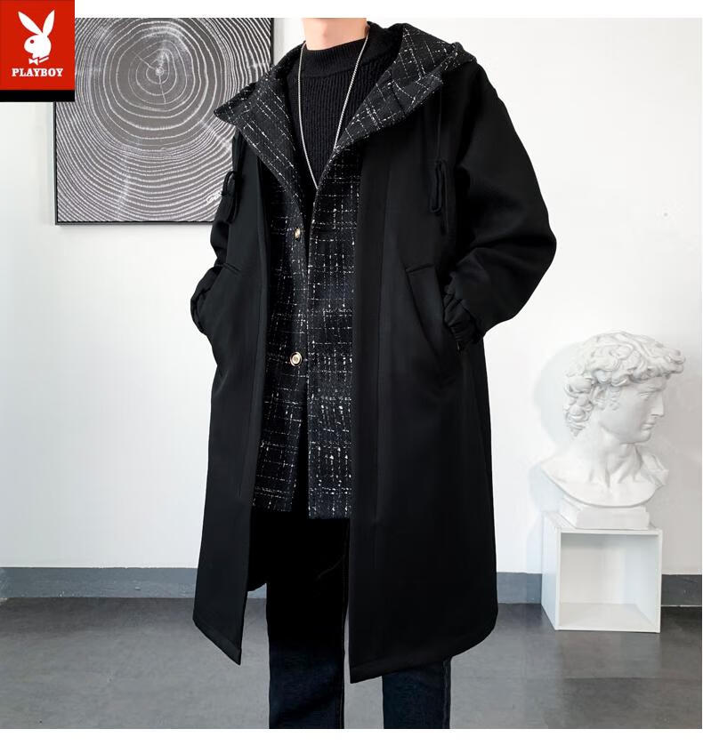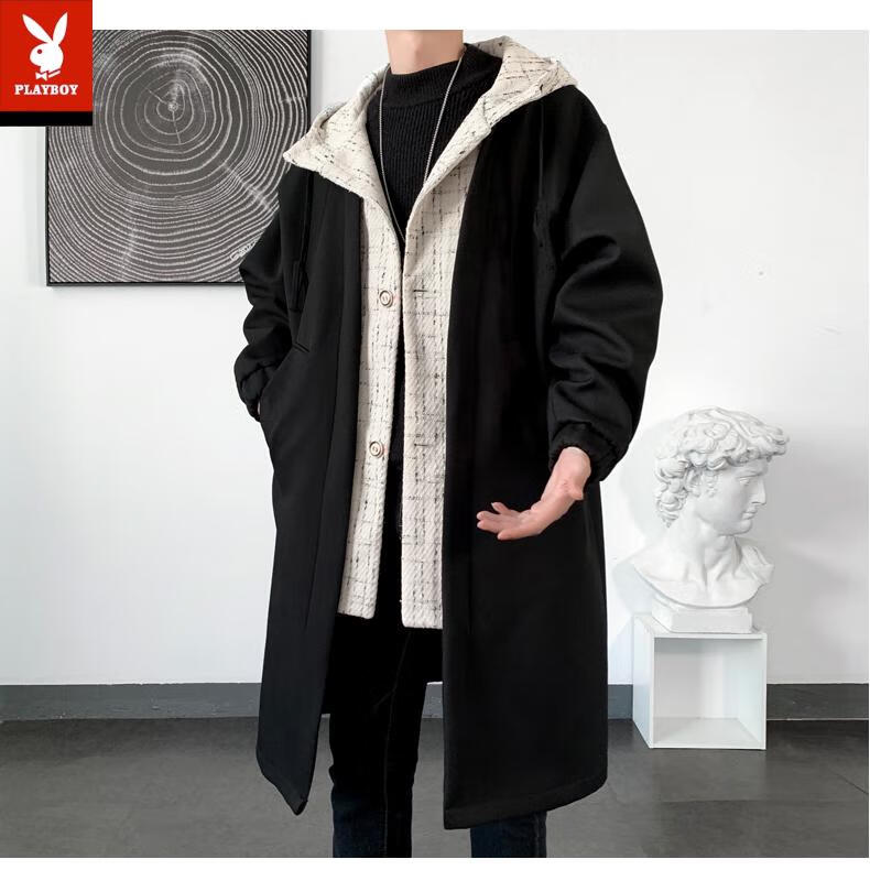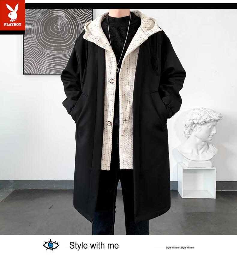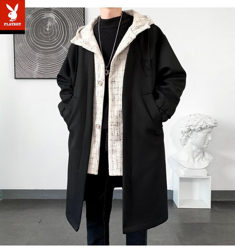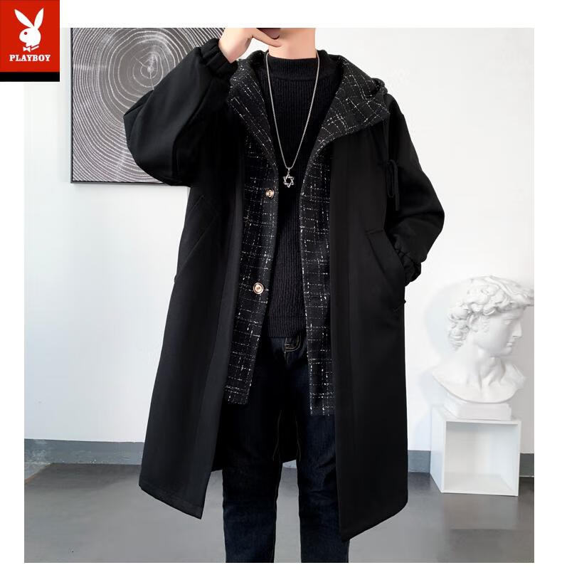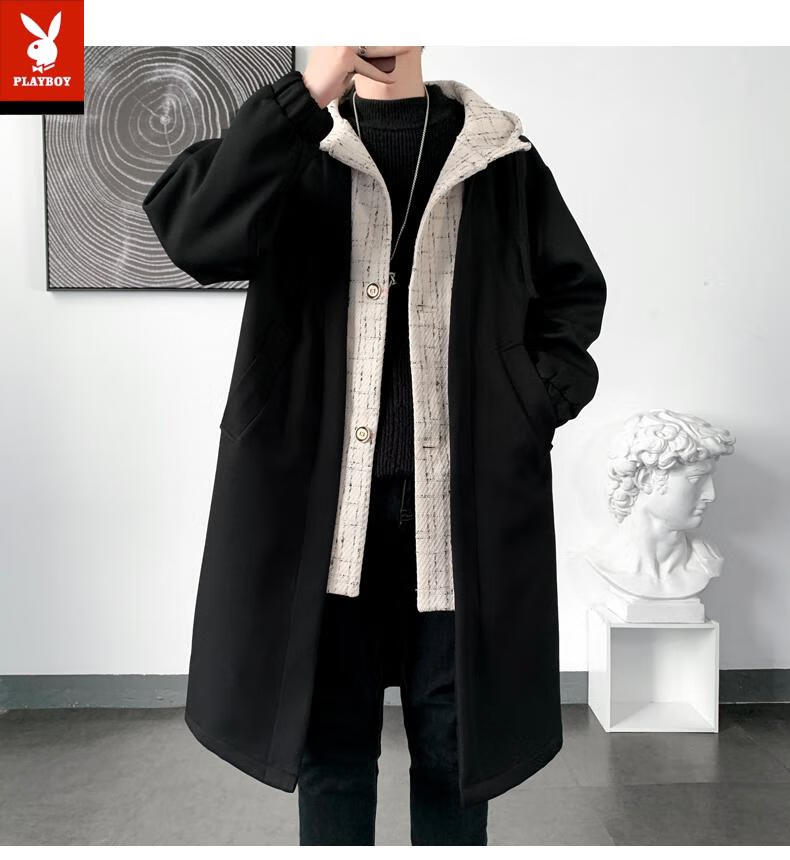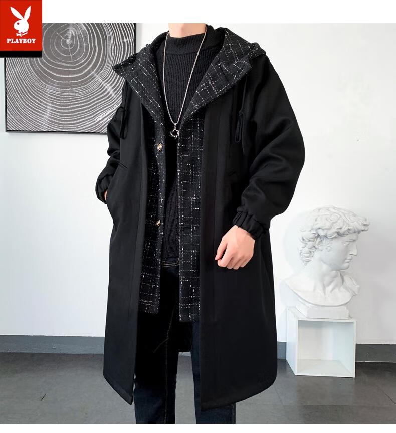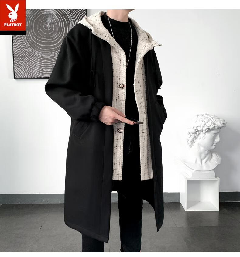 Playboy trench coat men's mid-length trendy loose summer thin Korean style fake two-piece hooded woolen coat black 2XL