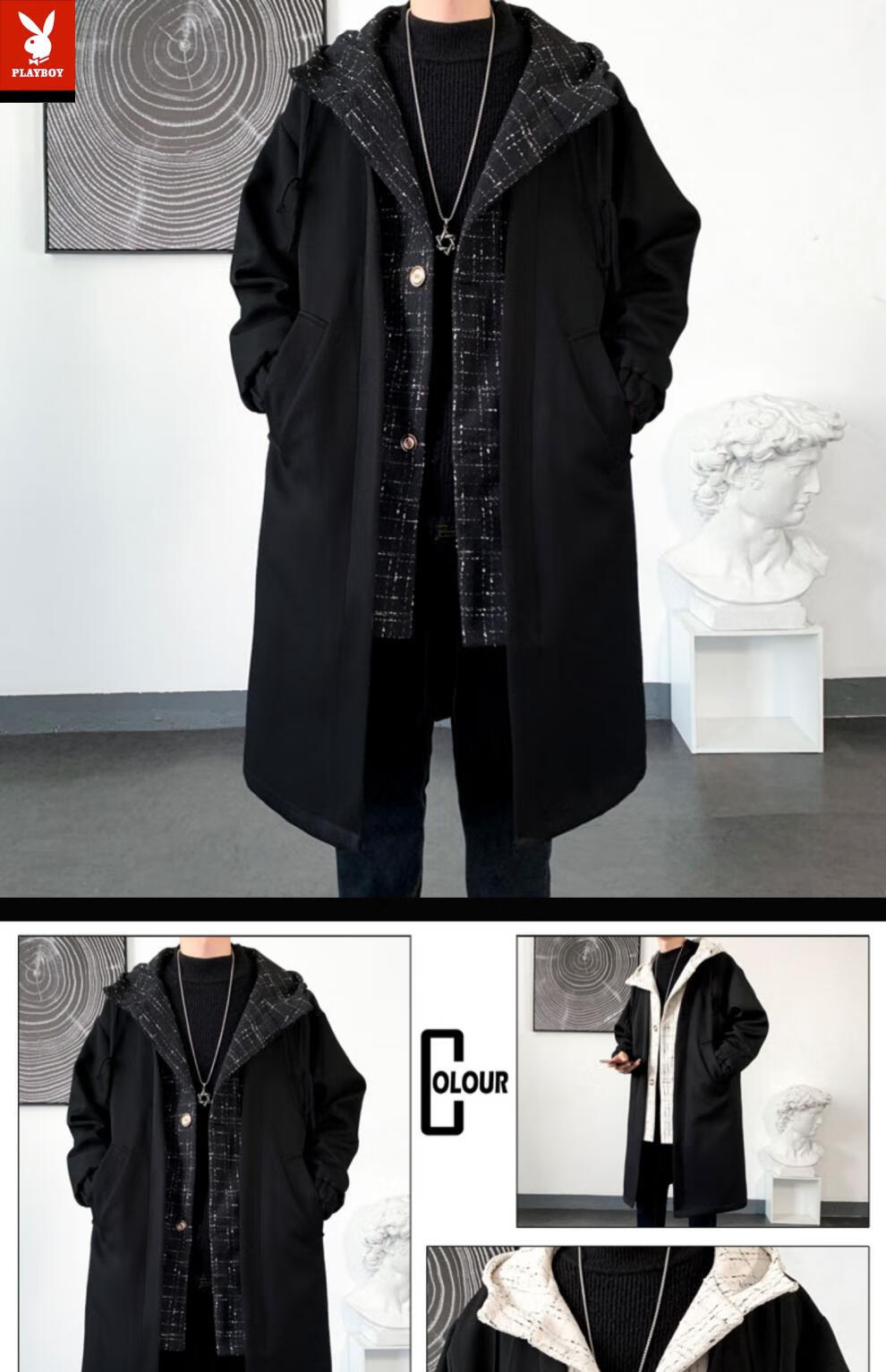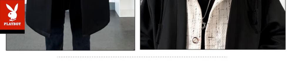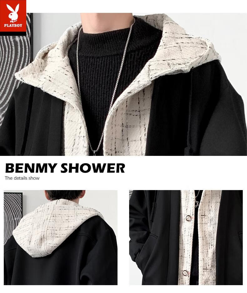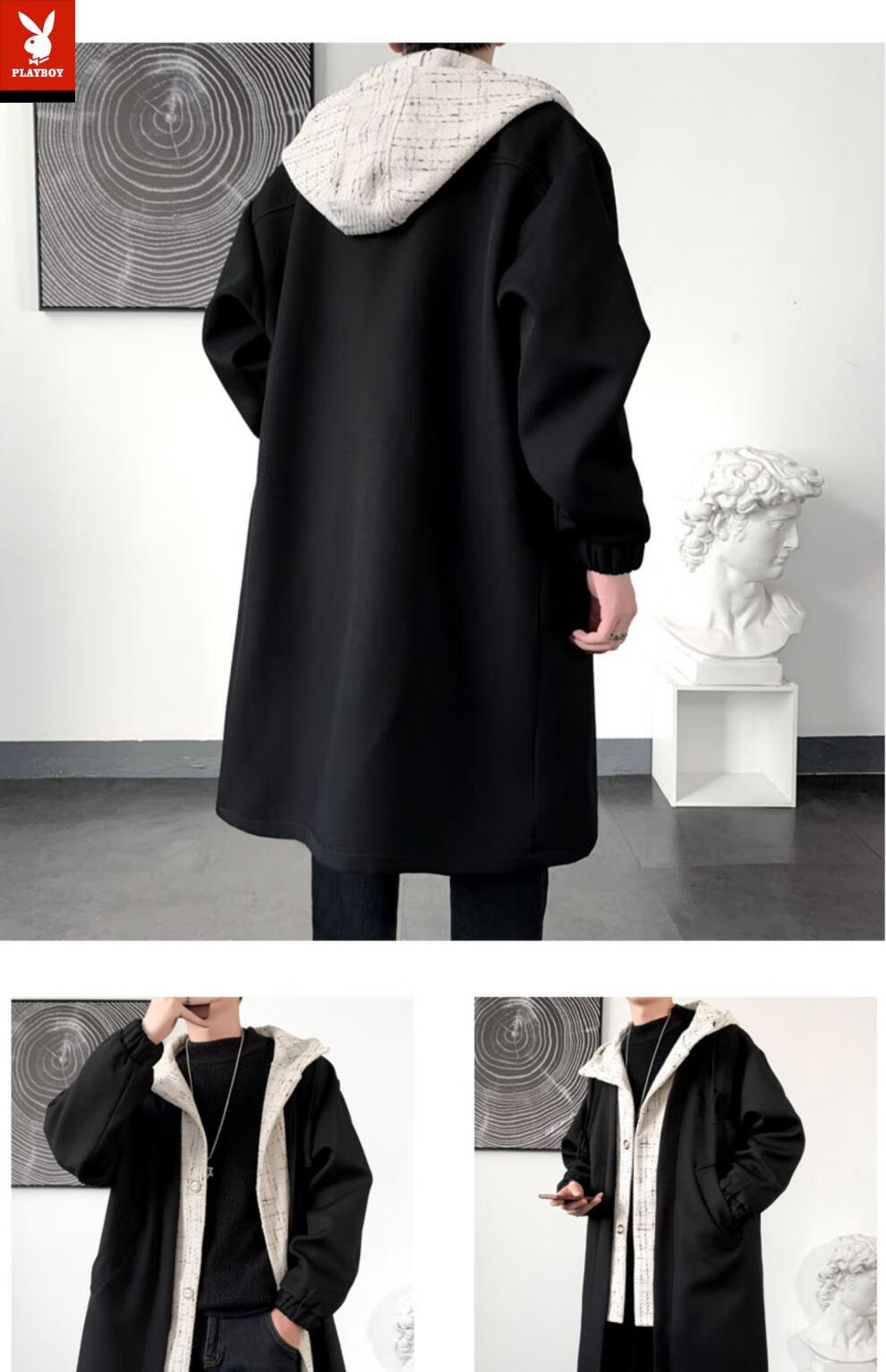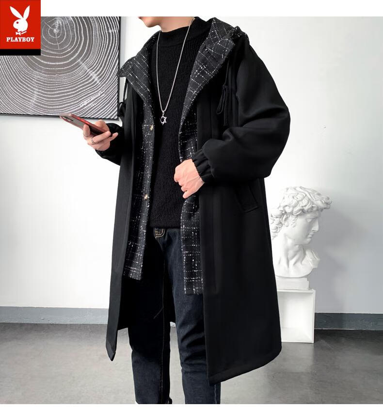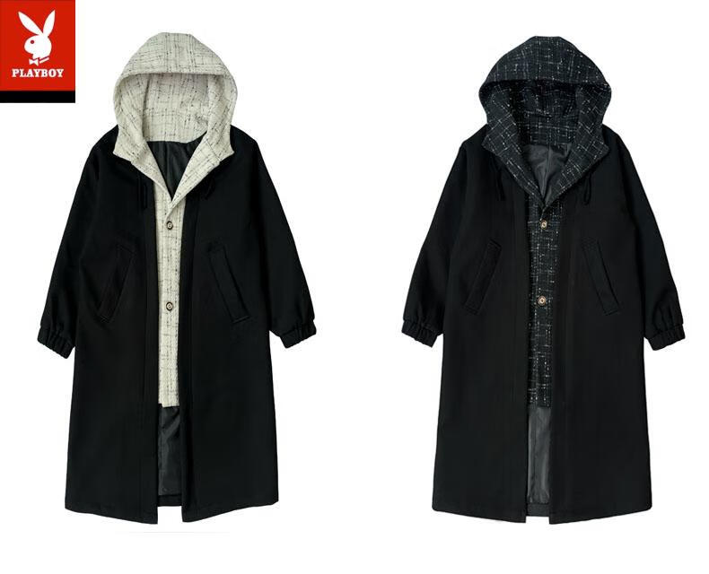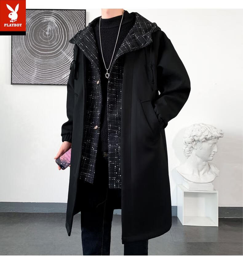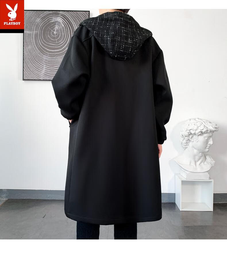 Playboy trench coat men's mid-length trendy loose summer thin Korean style fake two-piece hooded woolen coat black 2XL