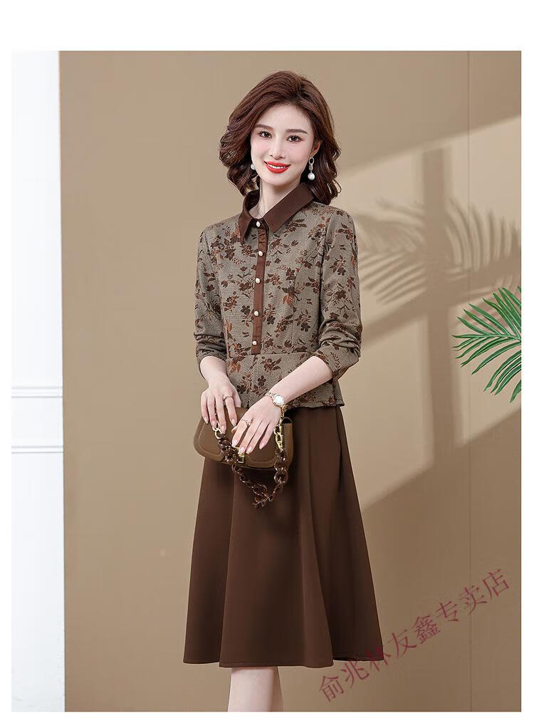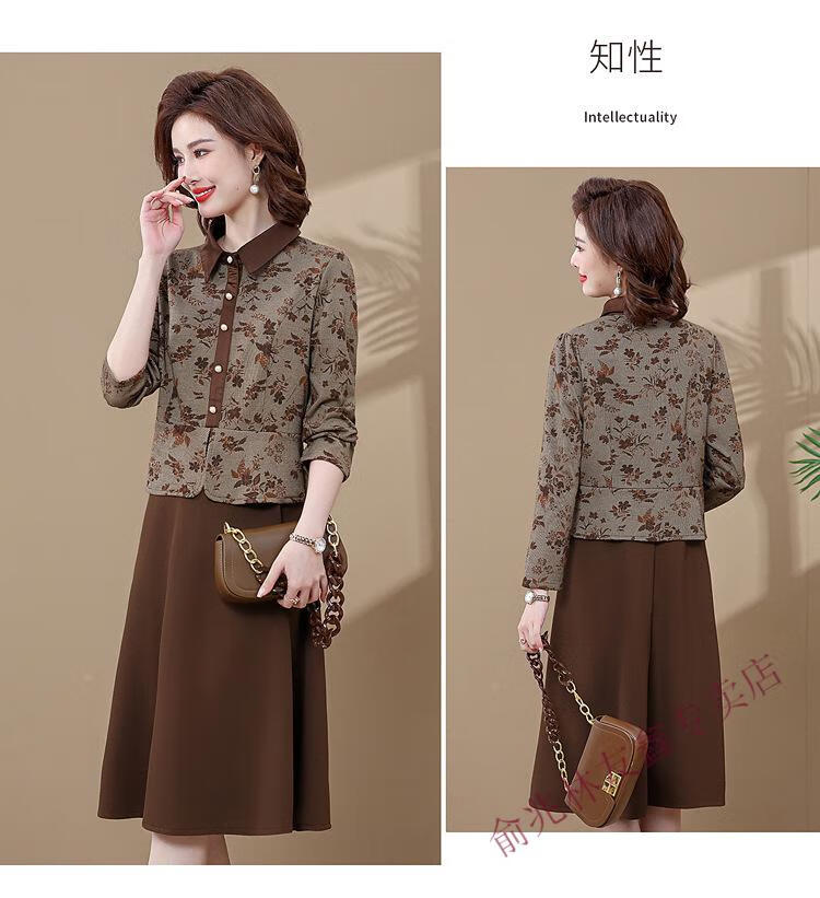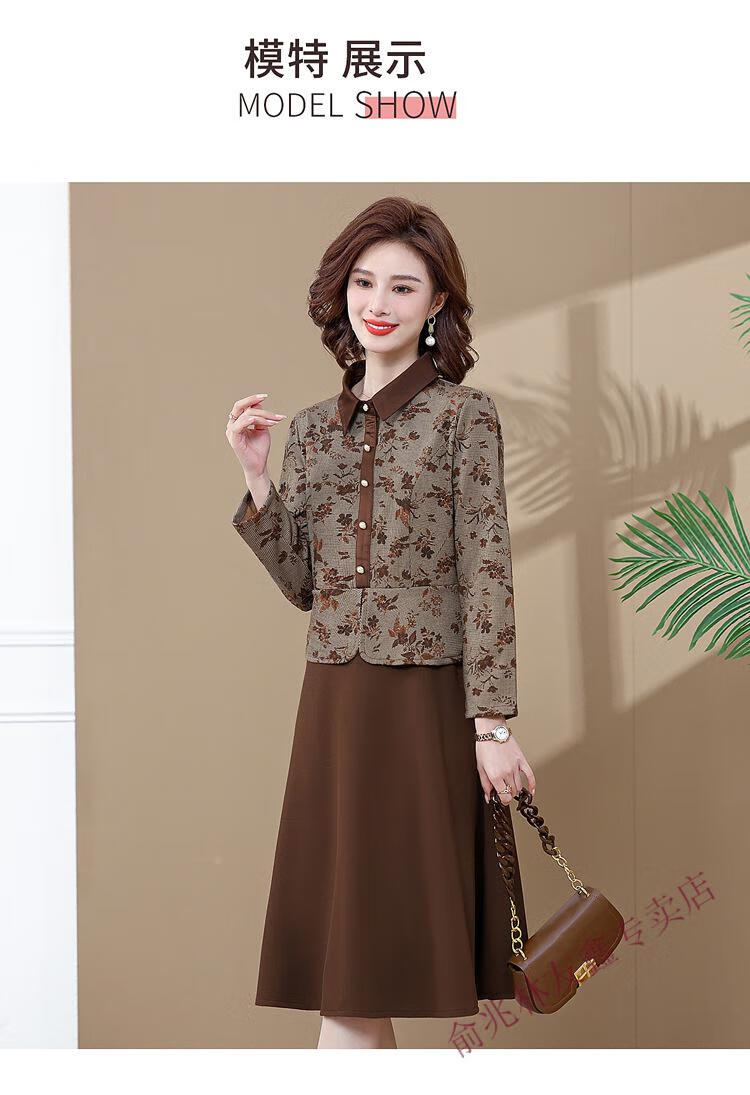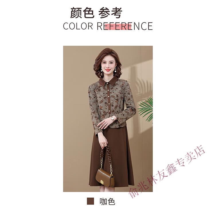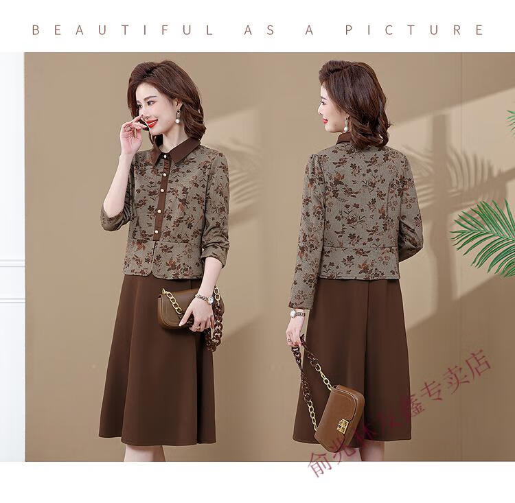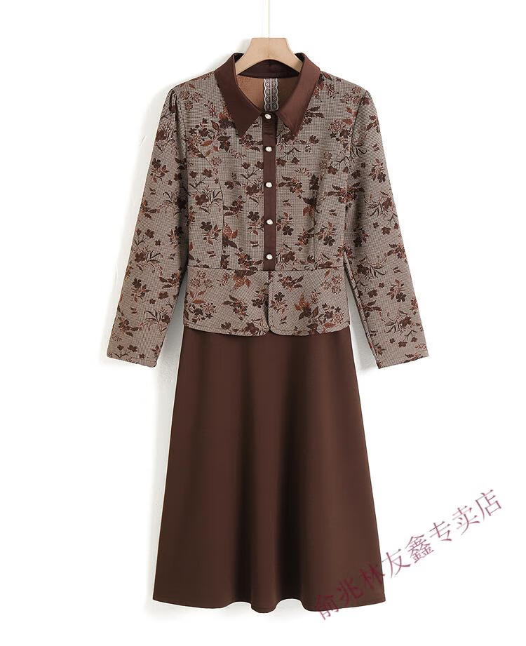 Yu Zhaolin (YUZHAOLIN) brand mother's spring and autumn fake two-piece dress, wide and stylish, new middle-aged and elderly women's long-sleeved shirt collar, coffee color XXL recommended 105-122 Jin Jin equals 0.5 kg