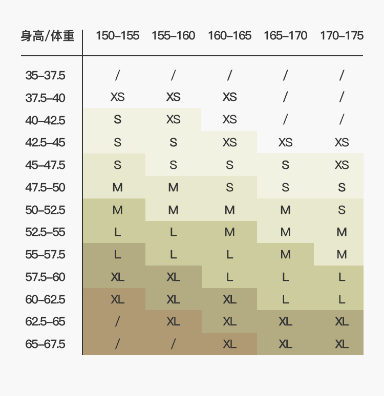 China (cm) 160-165/84-86 165-170 / 88-90 167-172 / 92-96 168-173 / 98-102 170-176 / 106-110