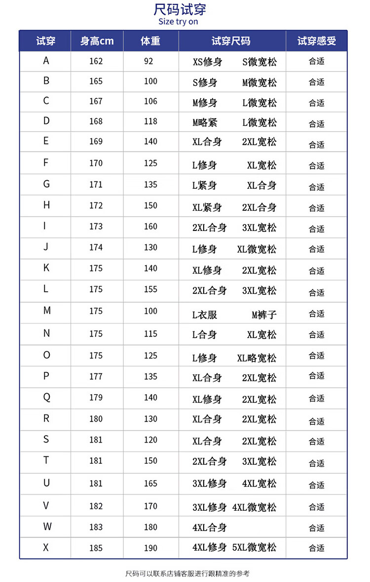 China (cm) 160-165/84-86 165-170 / 88-90 167-172 / 92-96 168-173 / 98-102 170-176 / 106-110