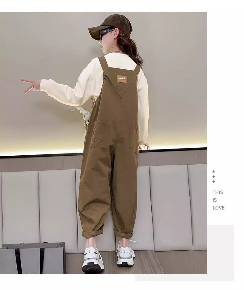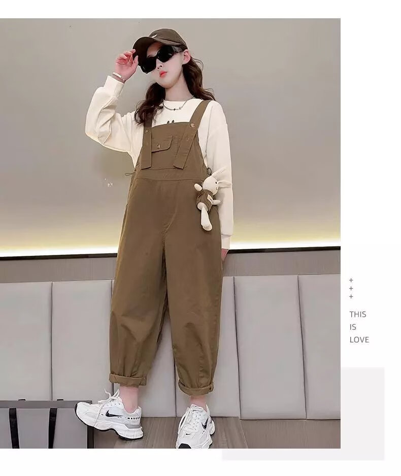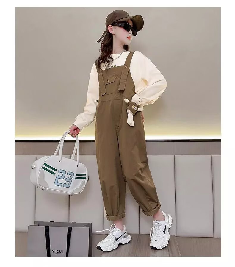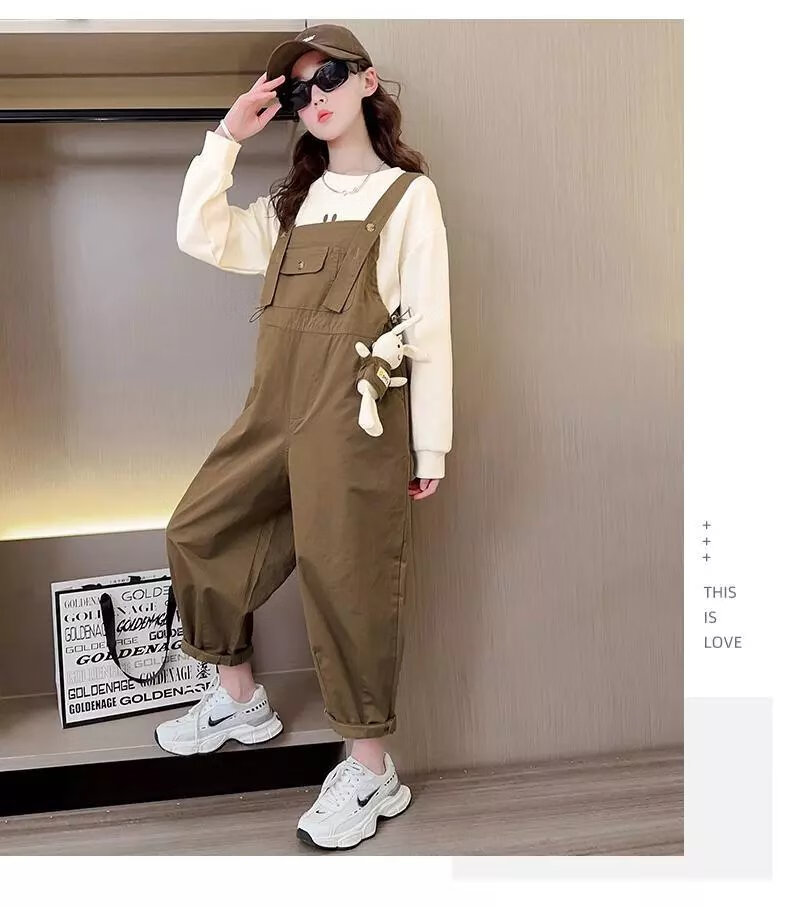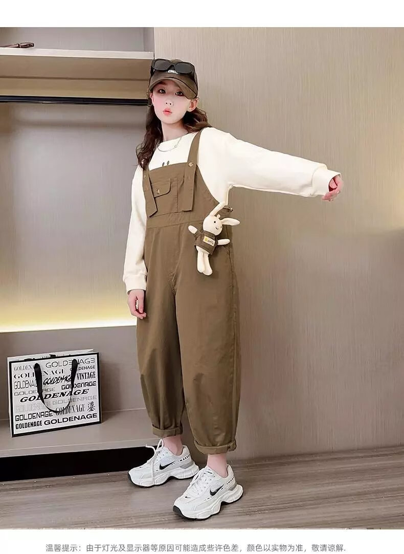 Disney (DISNEY) Girls Suit Spring and Autumn 2023 New Style Fashionable Long-Sleeved Children's Wear Internet Celebrity Big Children's Overalls Two-piece Set Trendy Dark Khaki Overalls + Top Two-piece Set 160