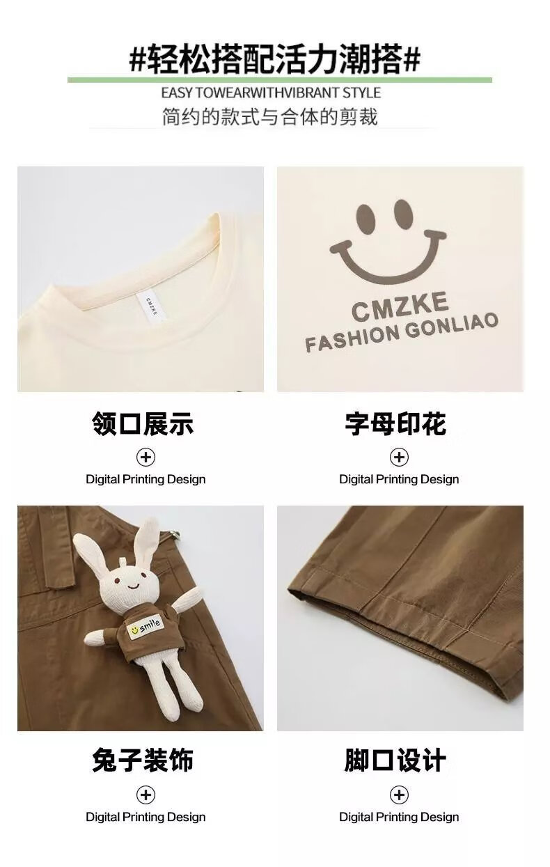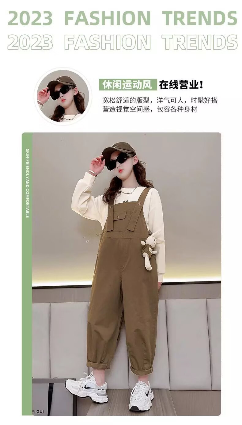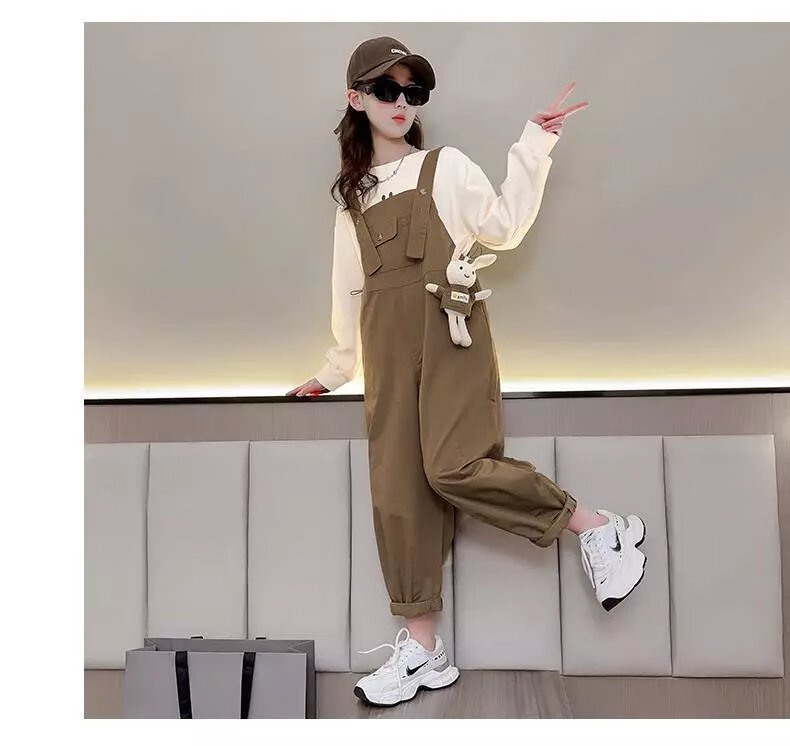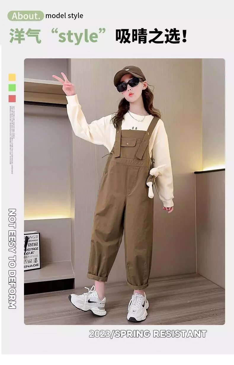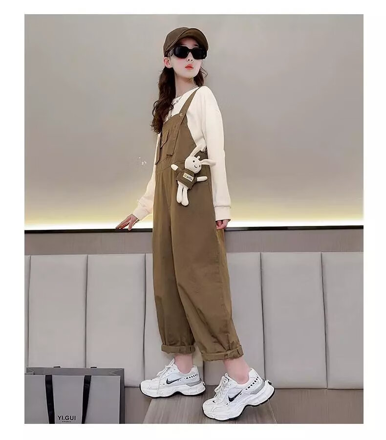 Disney (DISNEY) Girls Suit Spring and Autumn 2023 New Style Fashionable Long-Sleeved Children's Wear Internet Celebrity Big Children's Overalls Two-piece Set Trendy Dark Khaki Overalls + Top Two-piece Set 160
