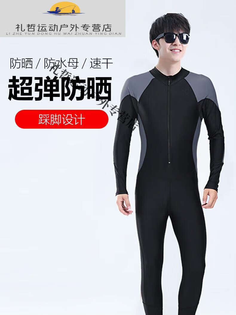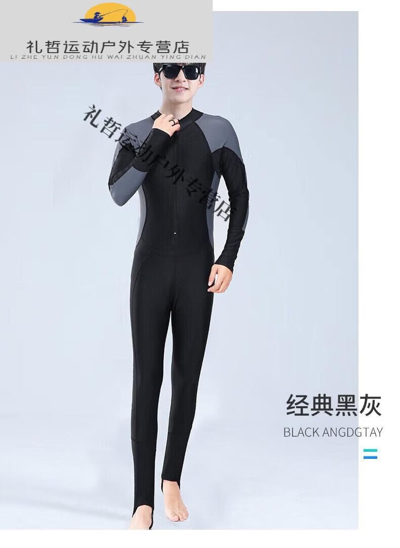 Chuangjingyixuan men's one-piece swimsuit snorkeling surfing wetsuit quick-drying swimsuit long-sleeved long pants warm swimsuit black and gray 2XL recommended 165-175CM weight 140-155Jin Jin equals 0.5 kg