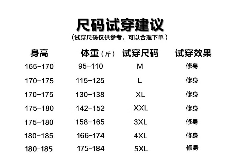 China (cm) 165 / 88-90 170 / 96-98 175 / 108-110 180 / 118-122 185 / 126-130